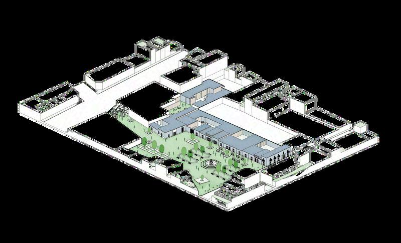 Posteriormente, se han valorado los elementosamantener,comolasfachadas originales, las plazuelas interiores y los jardines, que conservarán su traza y composición histórica, mientras que los interiores se adaptarán con nuevos materiales compatibles para usos culturalesysociales.
