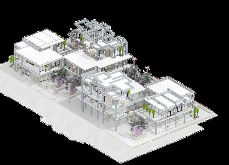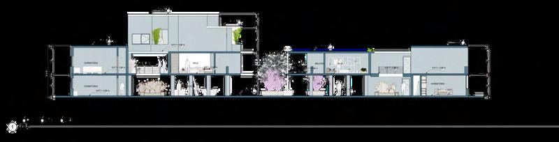 Este manejo de la iluminación no es meramente estético, sino que define el carácter de cada espacio: luz directa y brillante para las zonas de comercio y recreación, y una luz indirecta y suave paralosespaciosdedescansoresidencial. La espacialidad se enriquece con la transparenciadelospuentesdevidrioque conectanlosbloques,loscualesparecen flotarsobreelpatioverde,eliminandola sensacióndeencierro.