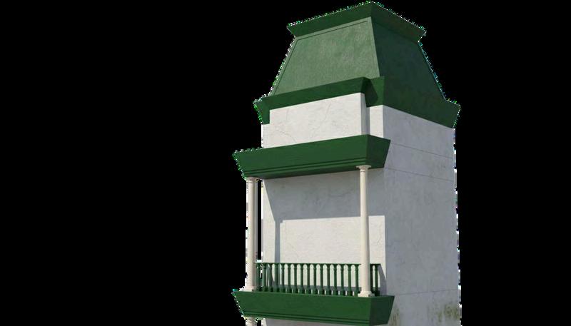 En la fachada principal, este elemento adquiere un carácter representativo mediante enlucidos y molduras que refuerzan su monumentalidad. Los vanos verticales, acompañados de carpinterías demaderaybalconestrabajados,añaden esbeltezyelegancia,generandounritmo visual que enriquece la composición general.