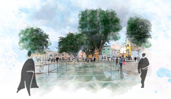 El agua recolectada es destinada principalmentealriegodeáreasverdesy espacios abiertos del proyecto, fortaleciendo la relación entre arquitecturaypaisaje.Esteusocontrolado favorece el mantenimiento de la vegetación sin incrementar el consumo deaguapotable.Deestemodo,lagestión hídrica se convierte en un componente activo del diseño, aportando valor ambientalyfuncionalalconjuntourbano.