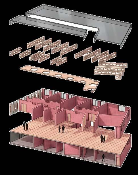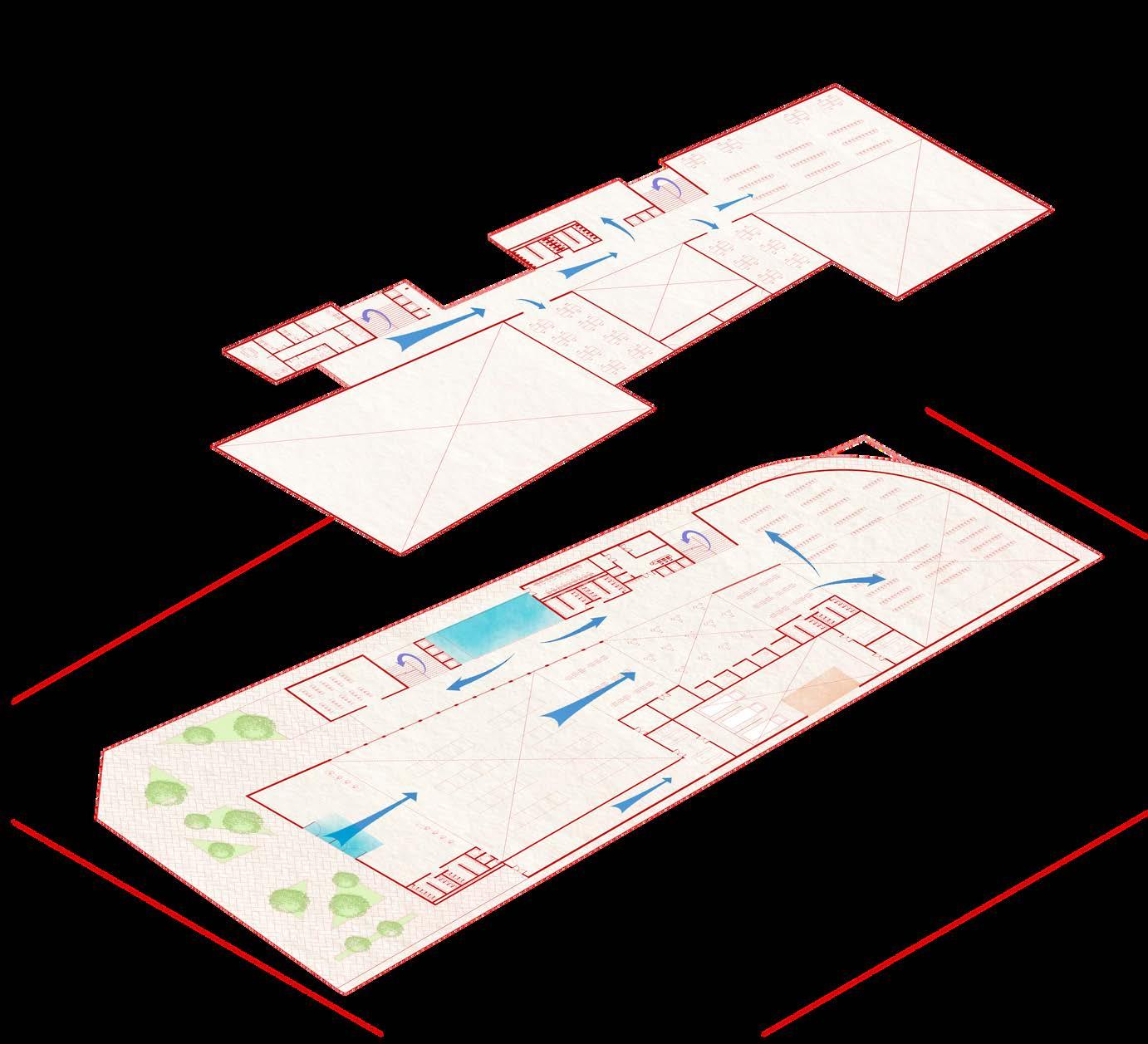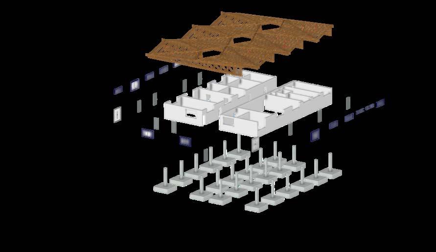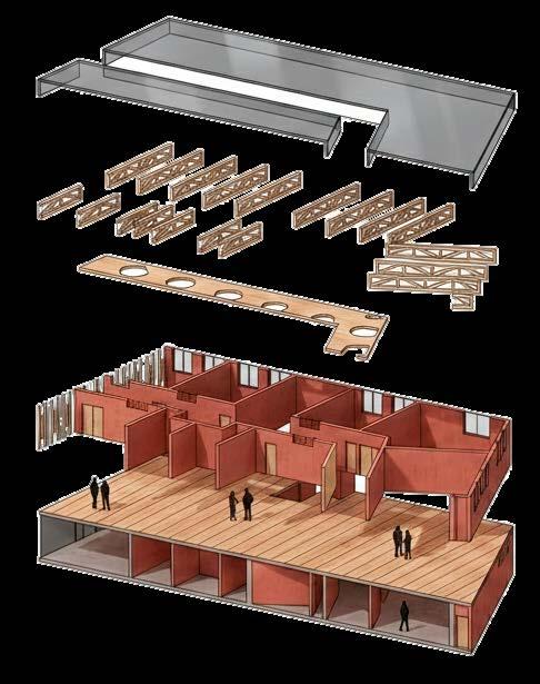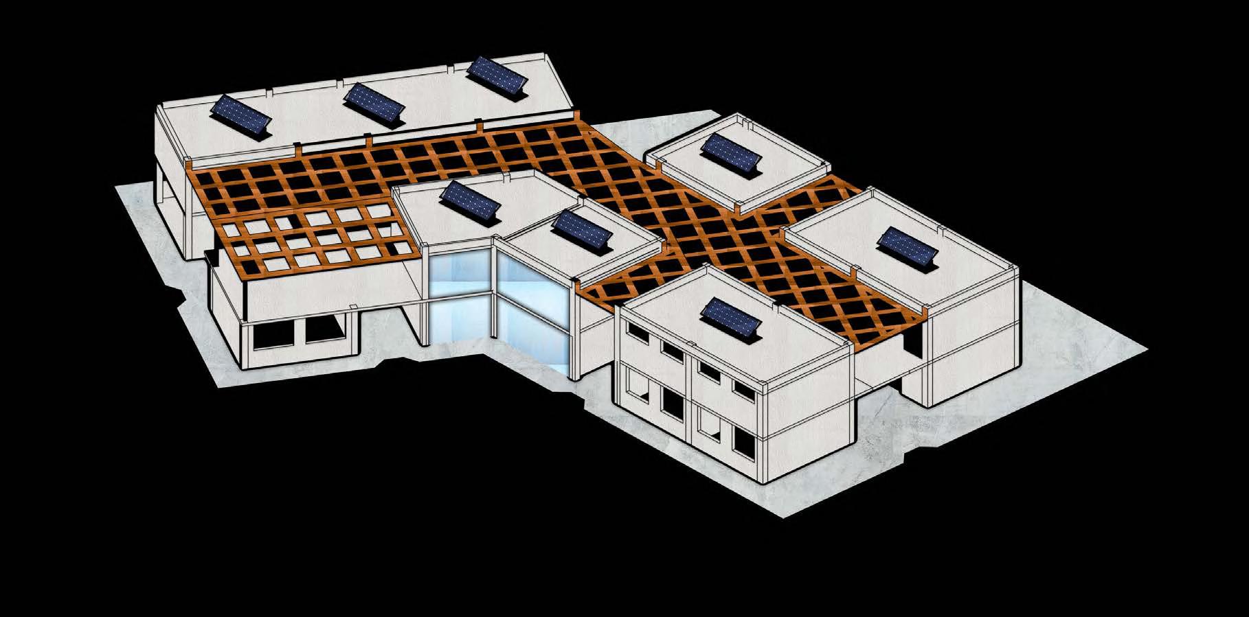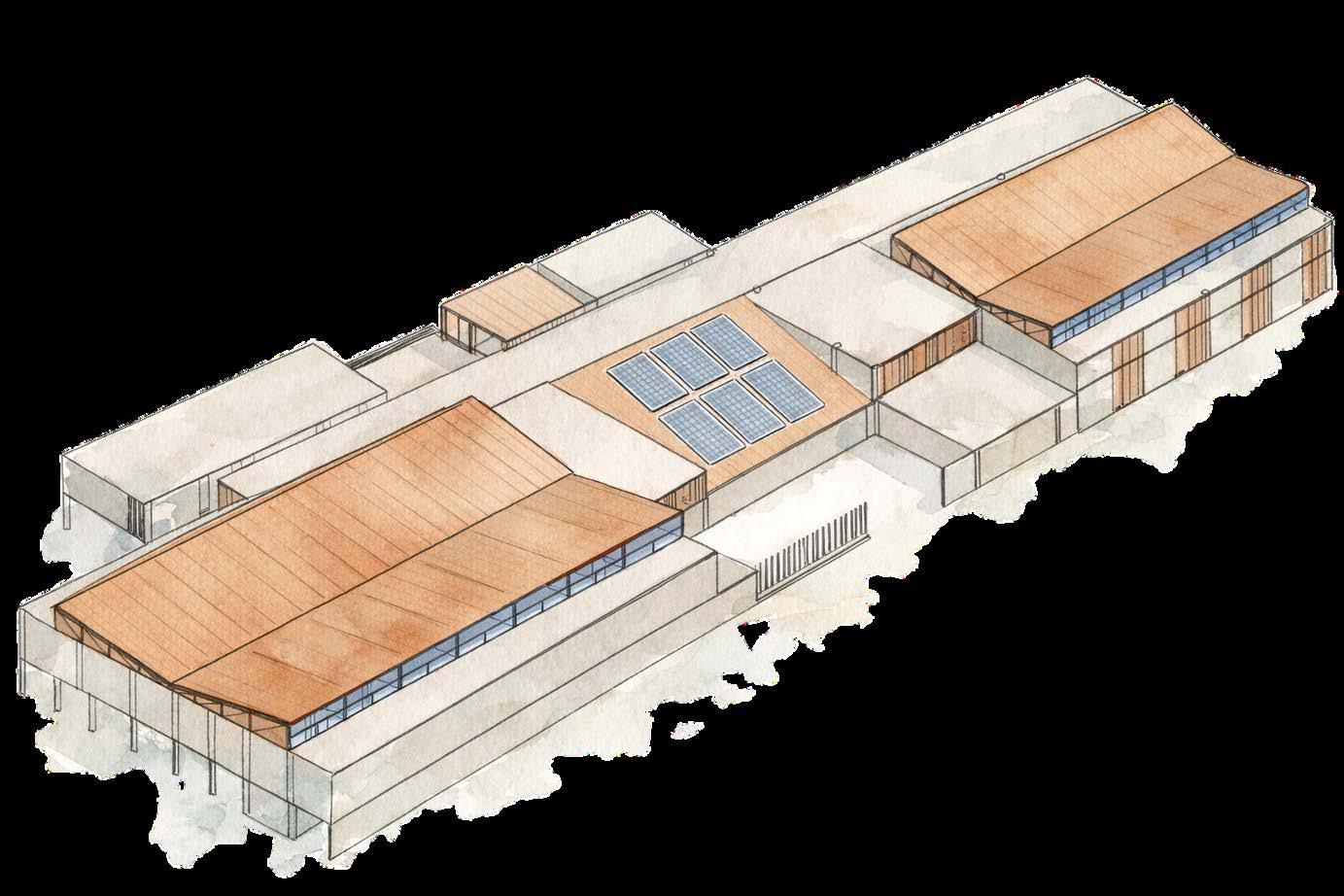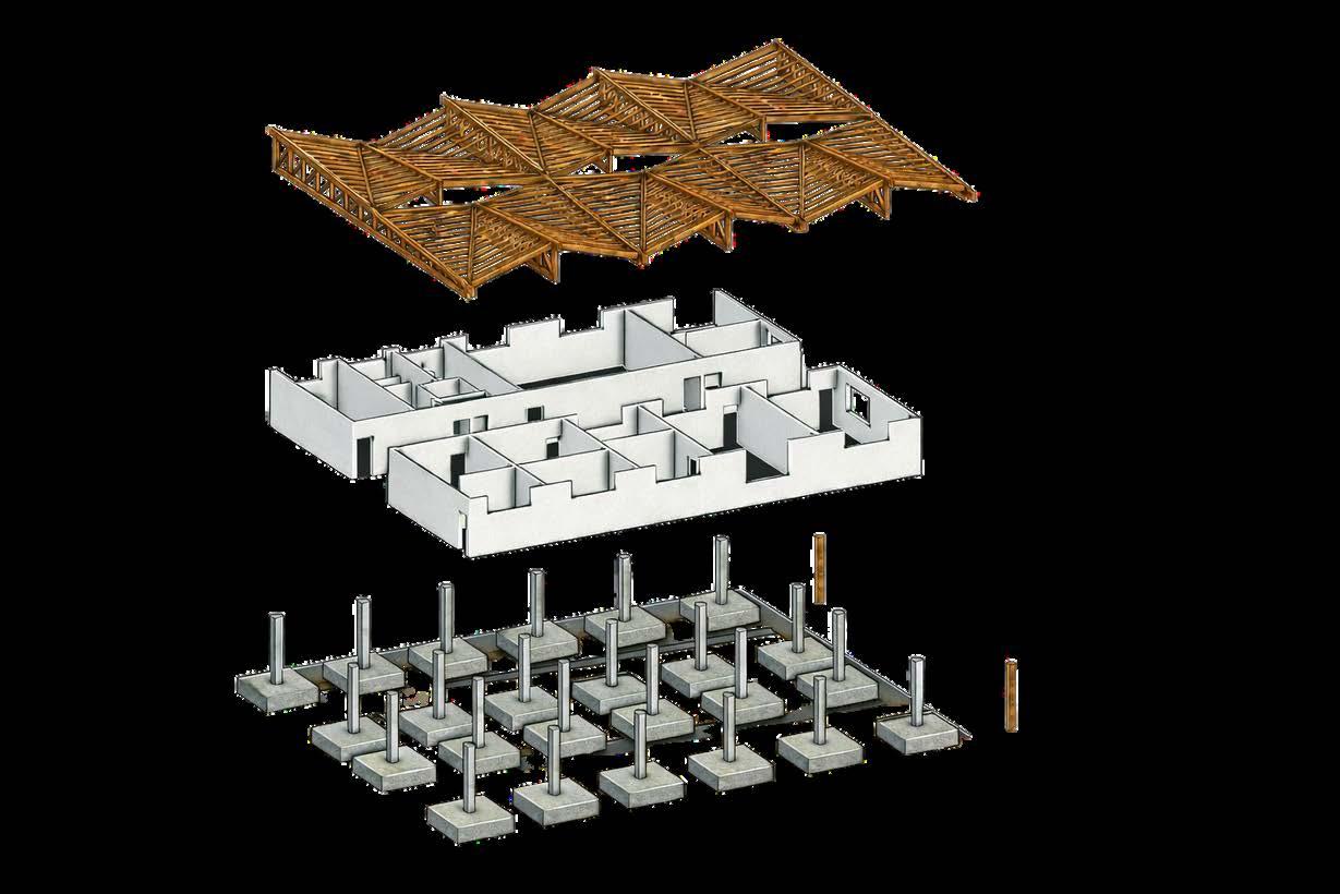 y manteniendo un ambiente fresco y saludable que favorece la concentración de los estudiantes mediante métodos pasivos. La flexibilidad del sistema estructural permitequelascorrientesdeairecirculen sin obstáculos significativos a través de las plantas. Gracias a la combinación de inerciatérmicaenlabaseyligerezaenla cubierta, el edificio logra un confort higrotérmico óptimo sin depender de sistemasdeclimatizaciónmecánicos.