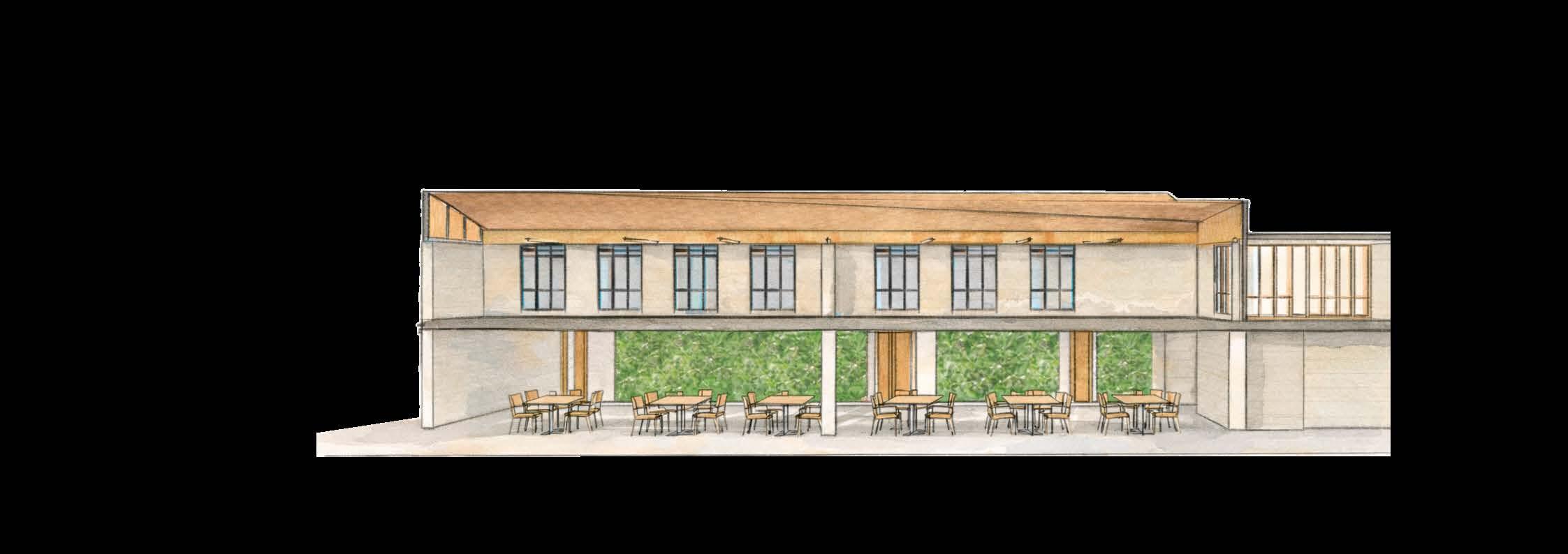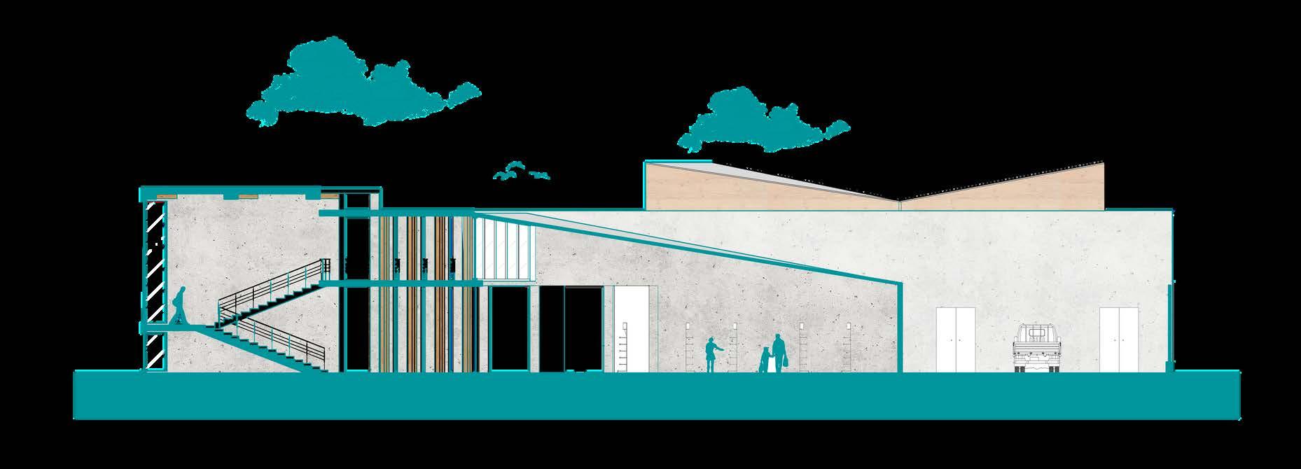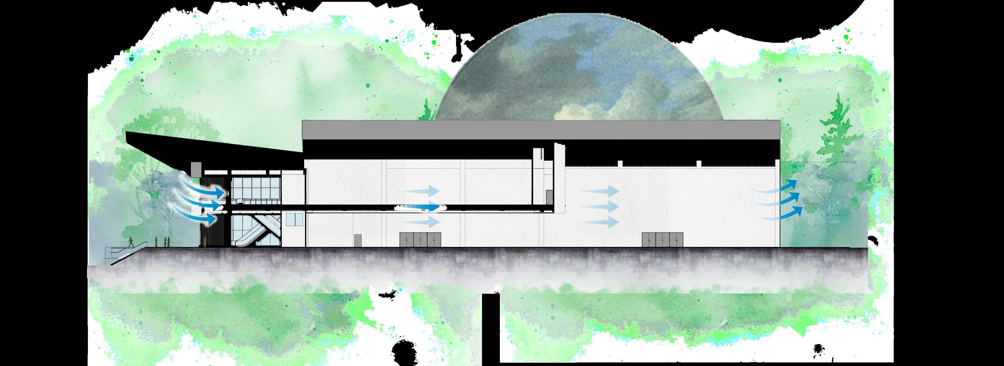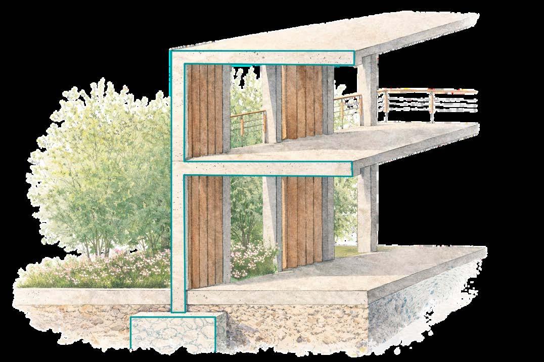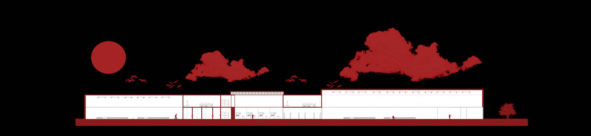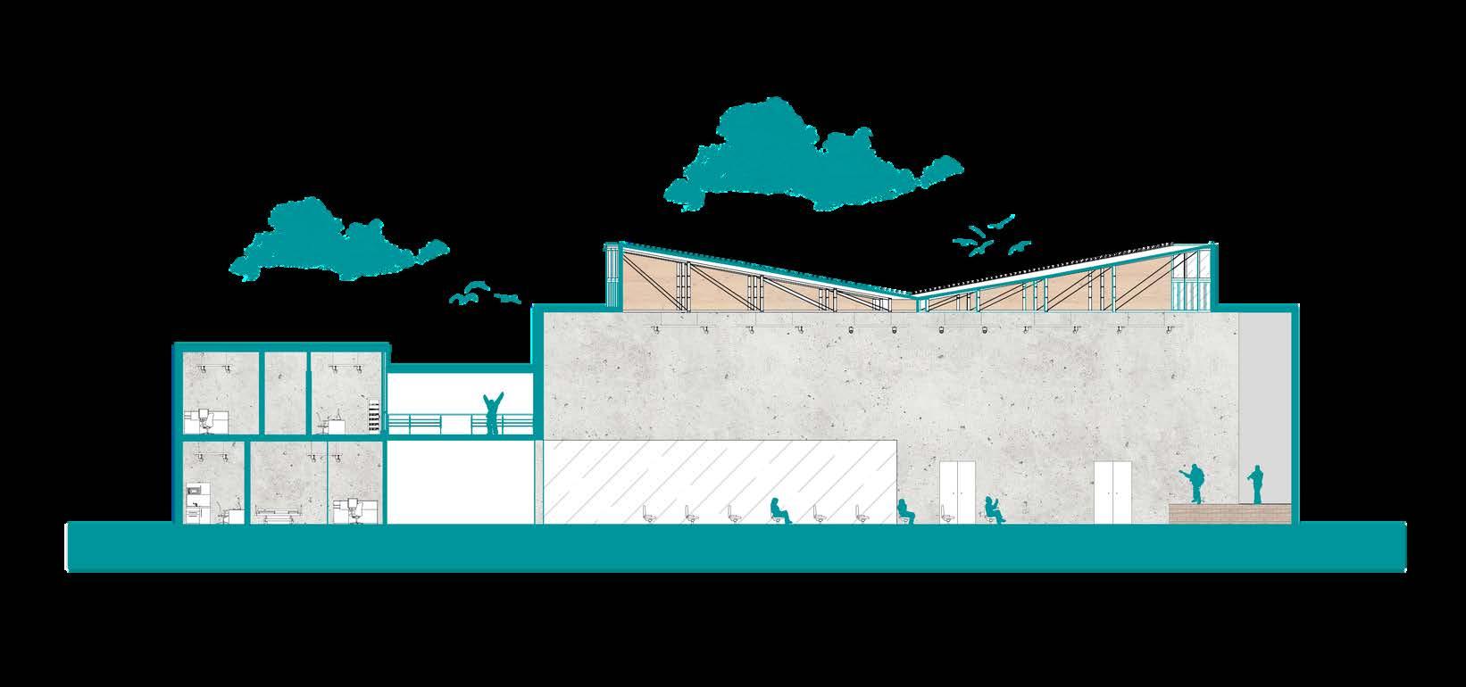 y manteniendo un ambiente fresco y saludable que favorece la concentración de los estudiantes mediante métodos pasivos. La flexibilidad del sistema estructural permitequelascorrientesdeairecirculen sin obstáculos significativos a través de las plantas. Gracias a la combinación de inerciatérmicaenlabaseyligerezaenla cubierta, el edificio logra un confort higrotérmico óptimo sin depender de sistemasdeclimatizaciónmecánicos.