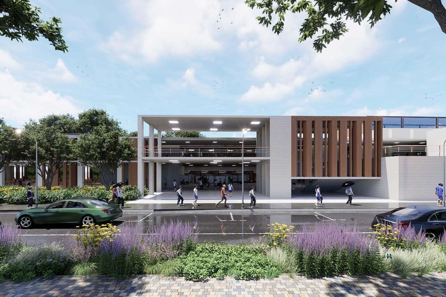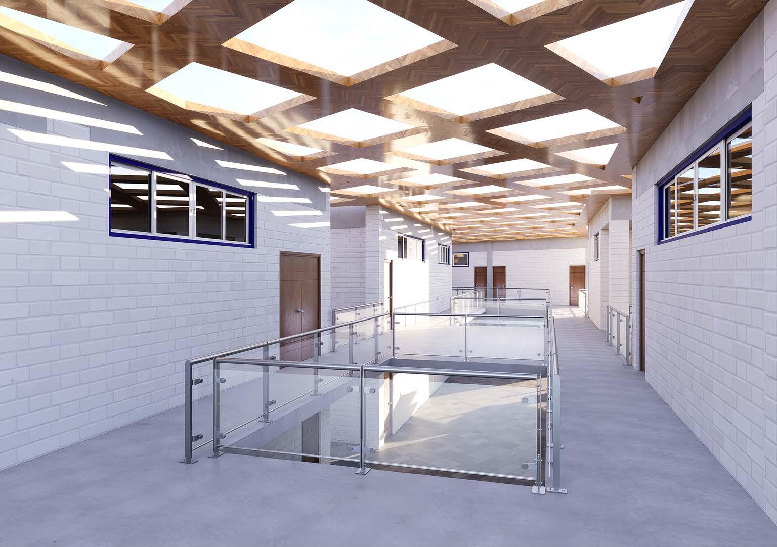 En el bloque del instituto, se emplean vanos laterales proporcionales que aseguranunailuminaciónprofundaenlas aulasdeestudio.Laestructuraaporticada permitequelaclaridadnaturalalcancelas zonas centrales, optimizando el confort visualyreduciendoelconsumoenergético durantelasactividadesacadémicas.
