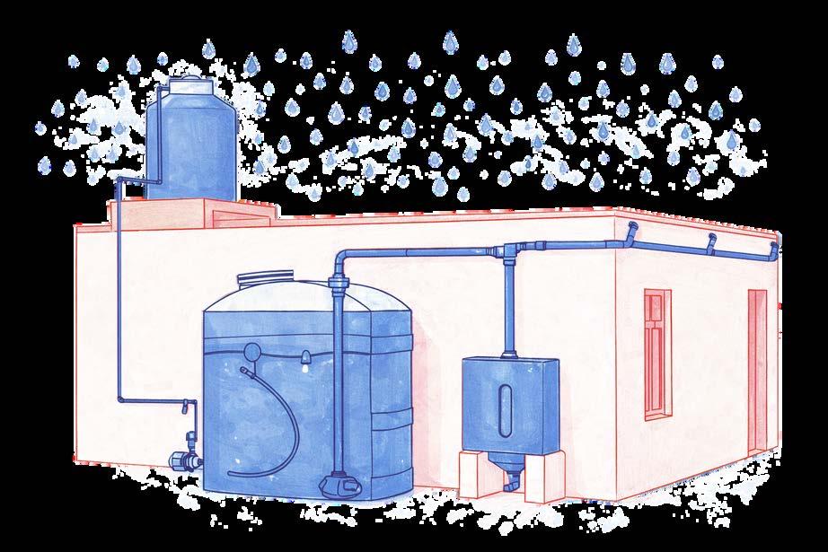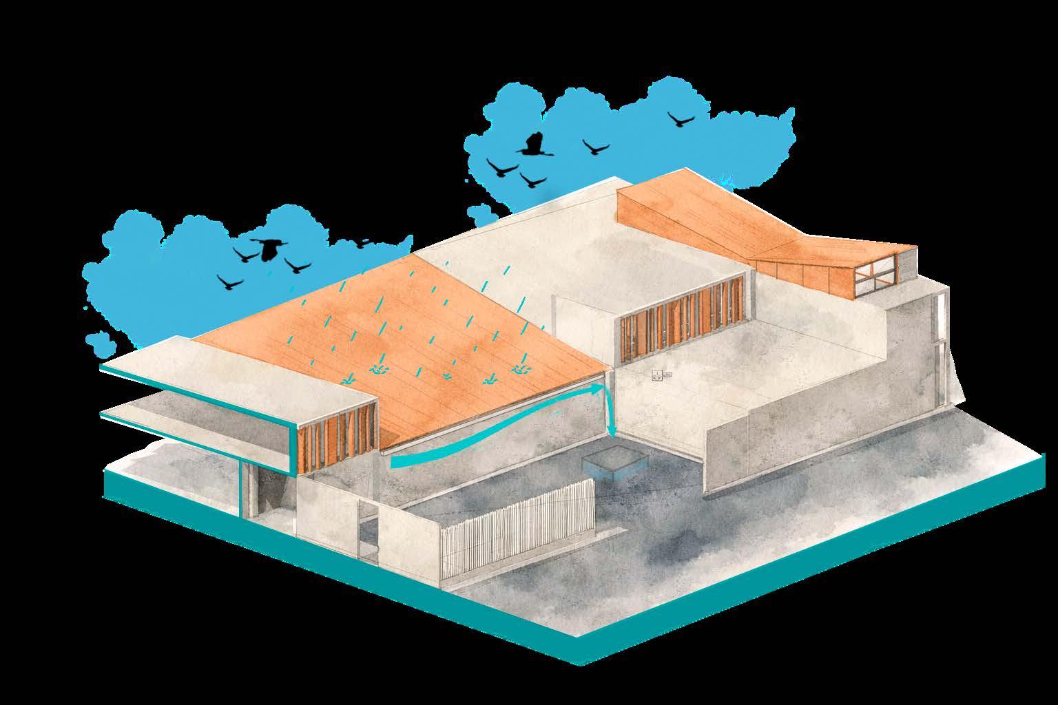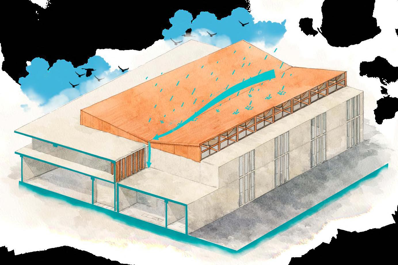 Elprocesoiniciaenlacubiertadeledificio, cuya geometría facilita la captación de agua pluvial. El agua de lluvia es recolectada mediante canaletas ubicadas estratégicamenteeneltechoyconducida atravésdeunareddetuberíasverticales integradasaldiseñodeledificio.