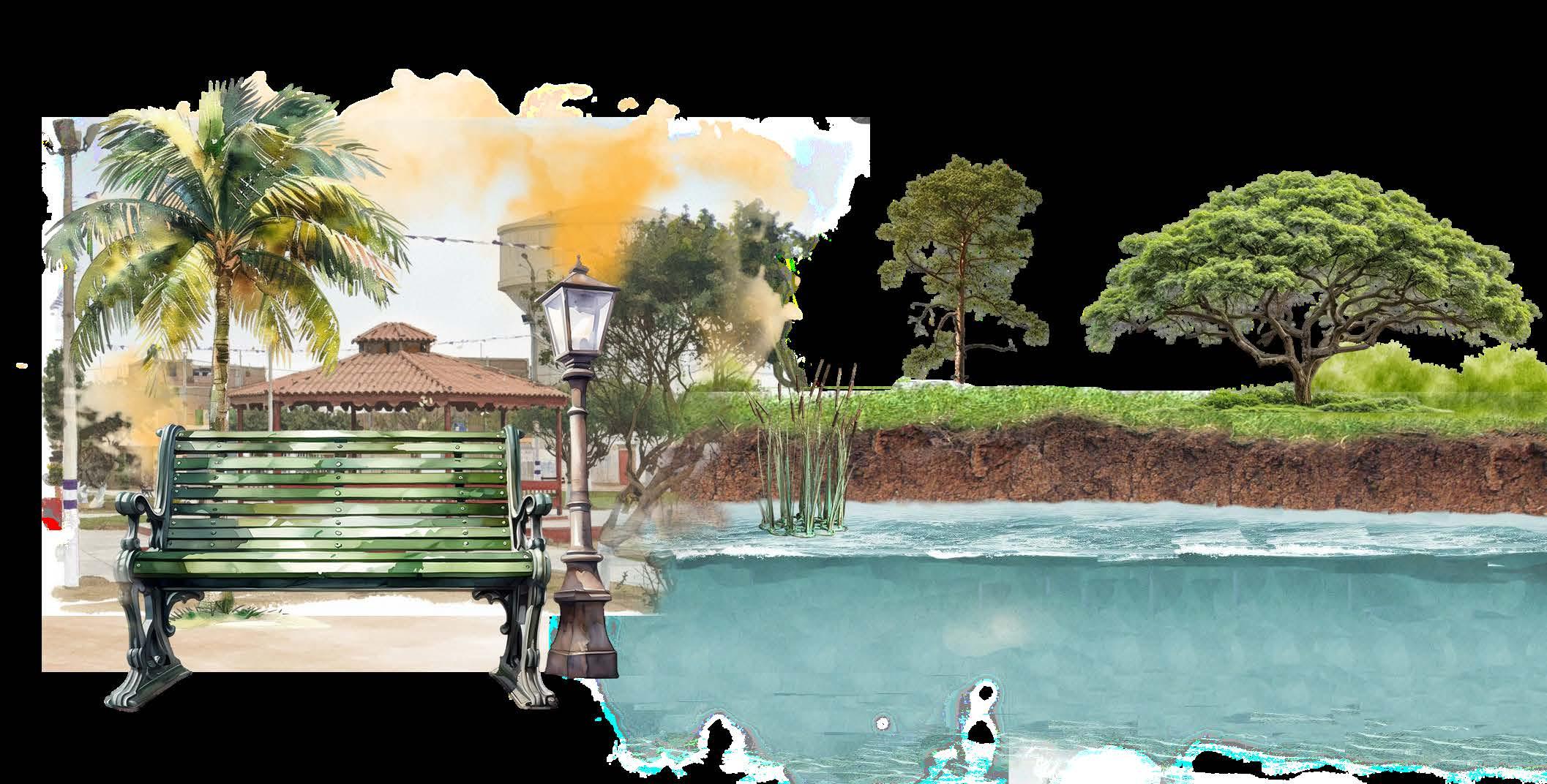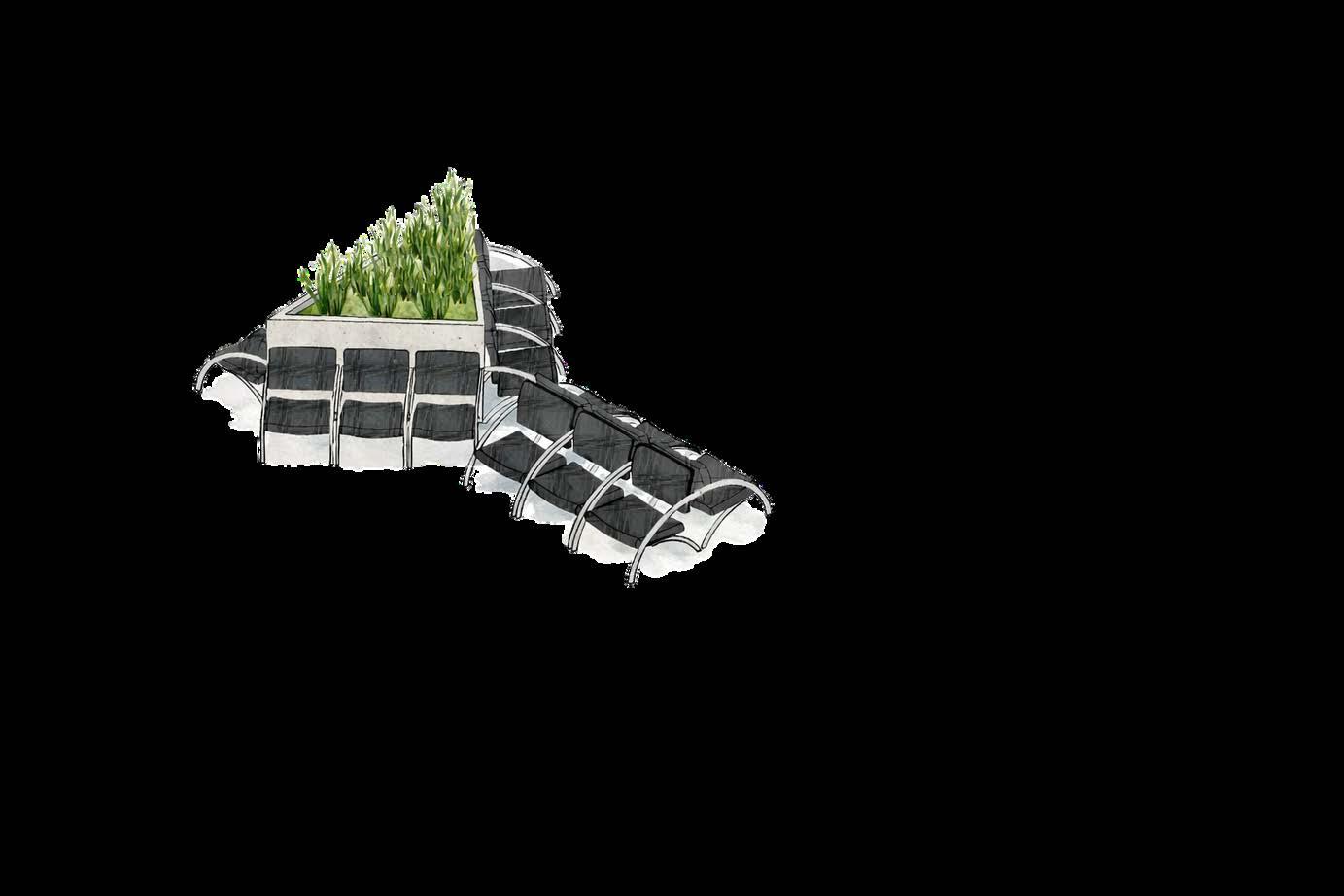 La estructura metálica curva se ancla a una base de concreto simple mediante pernosdeanclaje,asegurandoseguridad, firmeza y estabilidad estructural. Este mobiliario fortalece la relación entre arquitectura,paisajeyclima,integrándose de manera armónica al entorno y reforzando el enfoque sostenible y funcionaldelproyecto.