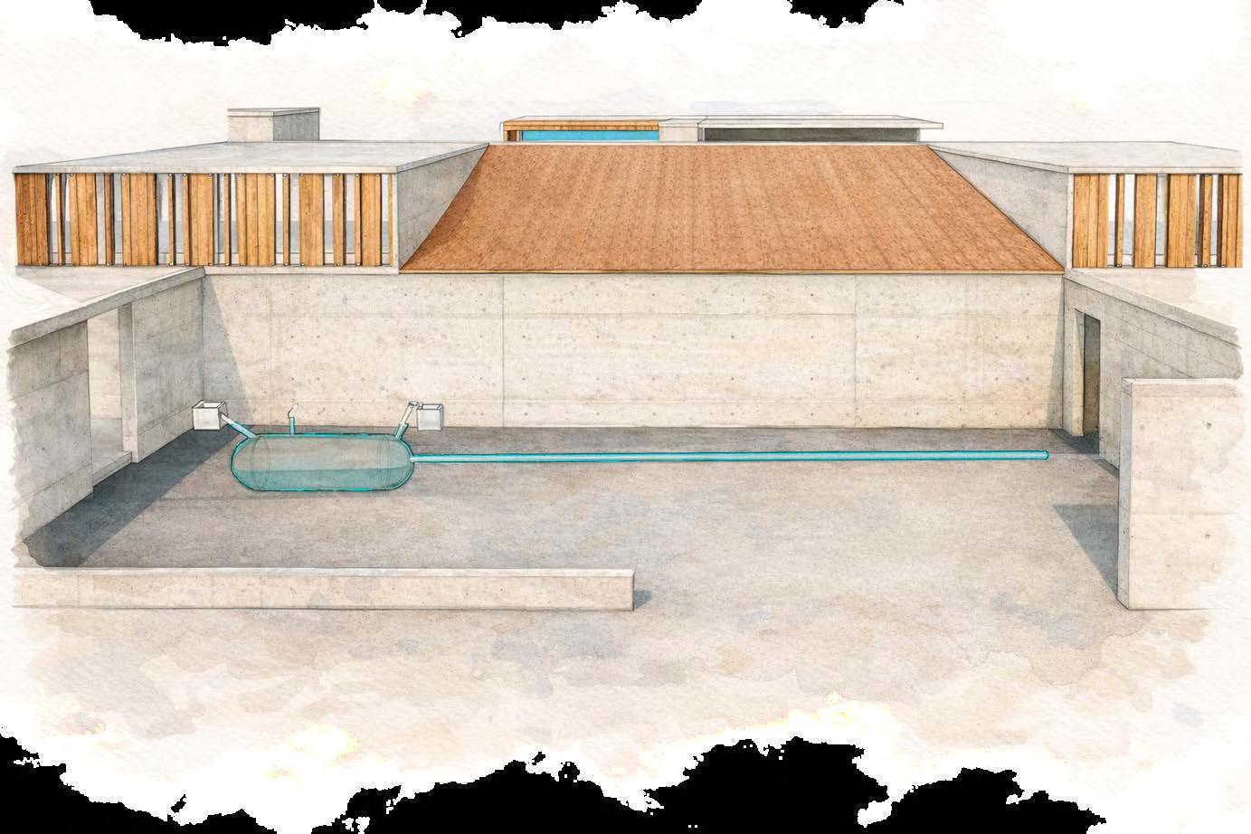 Finalmente,elaguatratadaesconducida hacia una cisterna subterránea de almacenamiento, ubicada estratégicamente bajo el edificio. Este reservorio permite conservar el agua de manera segura y protegida de agentes externos, asegurando su disponibilidad duranteperiodosdemenorprecipitacióny garantizando un uso eficiente y continuo delrecursohídrico.