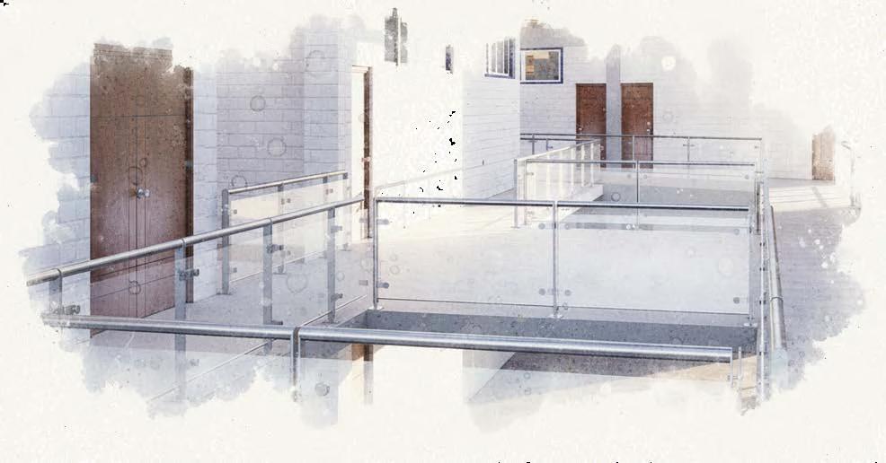 El sistema constructivo está compuesto porunbastidormetálicoqueproporciona estabilidad y durabilidad, incorporando vidrio templado de 5 mm que garantiza resistencia y seguridad. Los herrajes, burletesylacanaletainferiorpermitenun correcto sellado, un funcionamiento eficiente y una adecuada evacuación del agua.