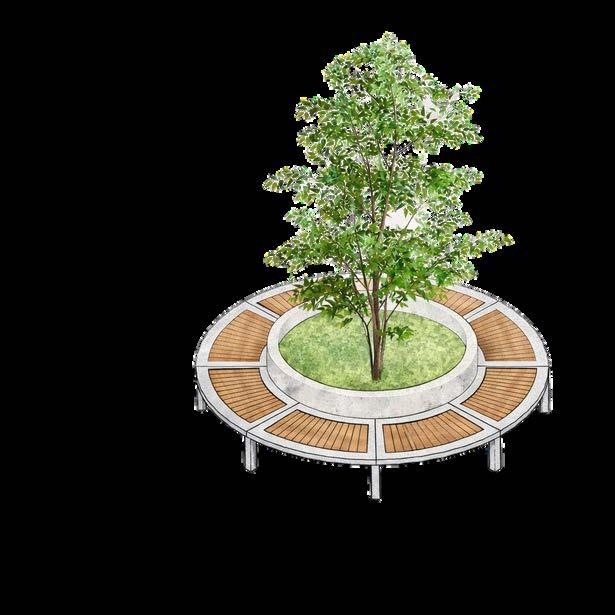La pérgola de madera de cedro proporcionasombra,protecciónfrenteala radiaciónsolarycontroldelasoleamiento, permitiendounusocontinuodelmobiliario durante distintas horas del día. Los asientos de madera ofrecen confort térmico y resistencia al uso prolongado, mientras que los elementos metálicos complementanelconjuntoyrefuerzansu durabilidad.