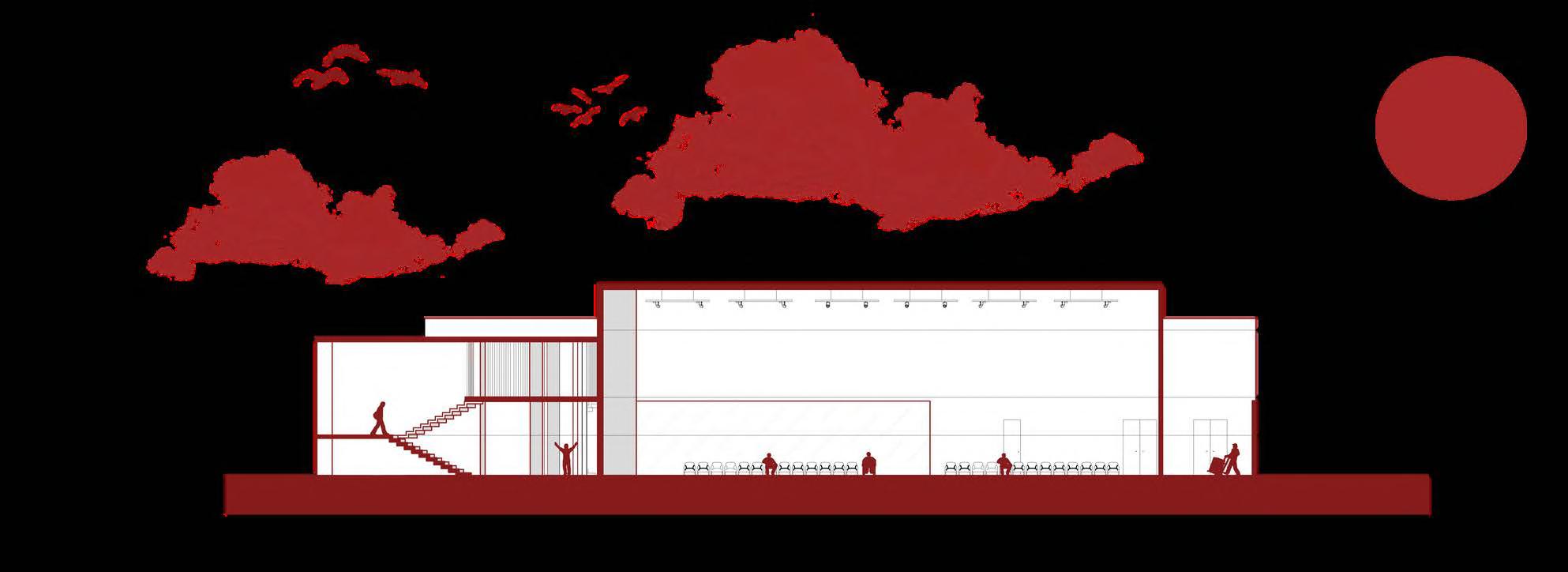 La circulación es continua, jerarquizada y claramente legible. Rampas exteriores, escaleras convencionales y una escalera eléctrica conectan de forma eficiente los dos niveles, asegurando accesibilidad para todos los usuarios. Estos elementos convergen en el área central de doble altura, desde donde se distribuyen los flujoshaciaauditorios,salonesyservicios complementarios. Esta disposición ordenada optimiza los recorridos, reduce tiempos de desplazamiento y evita congestión,permitiendounusosimultáneo y flexible de los ambientes para distintos tiposdeeventos.