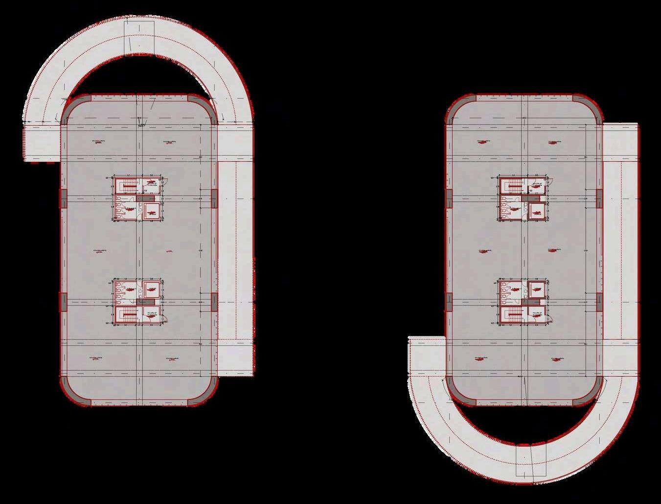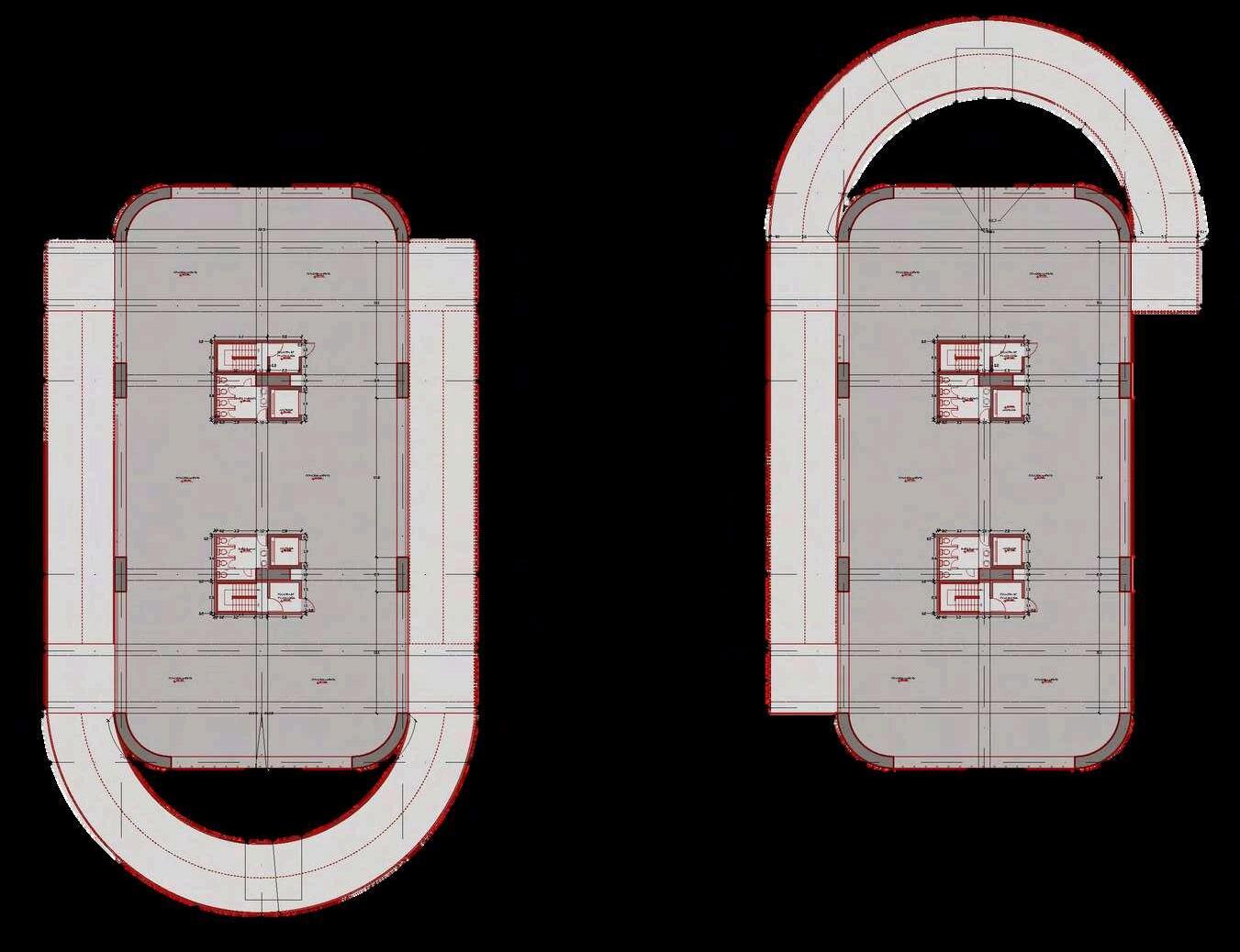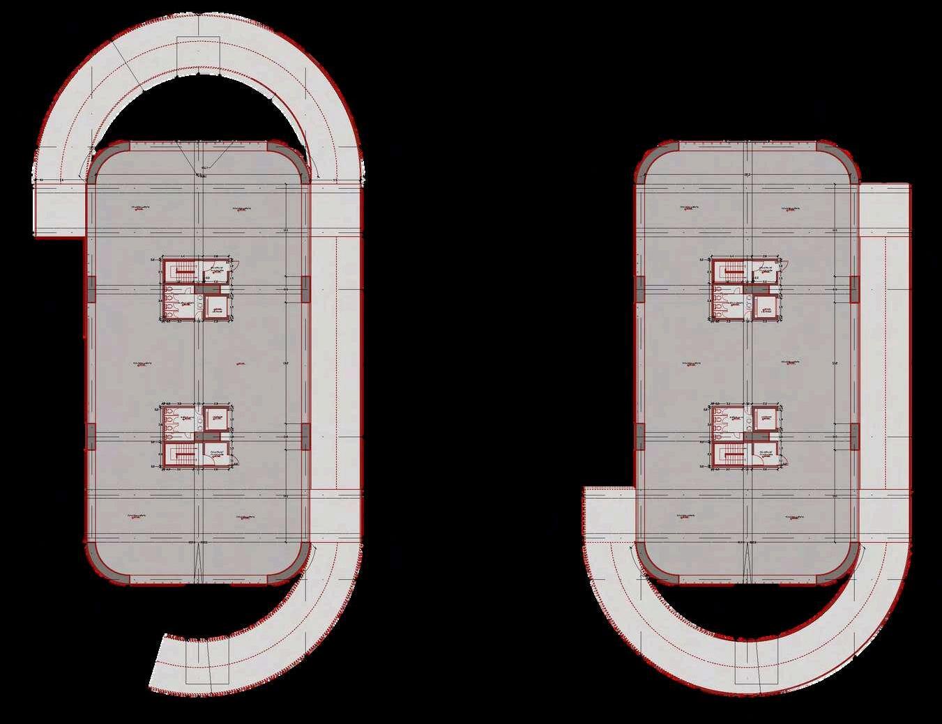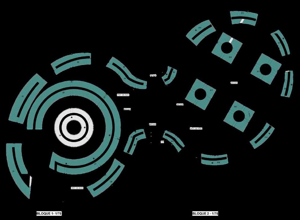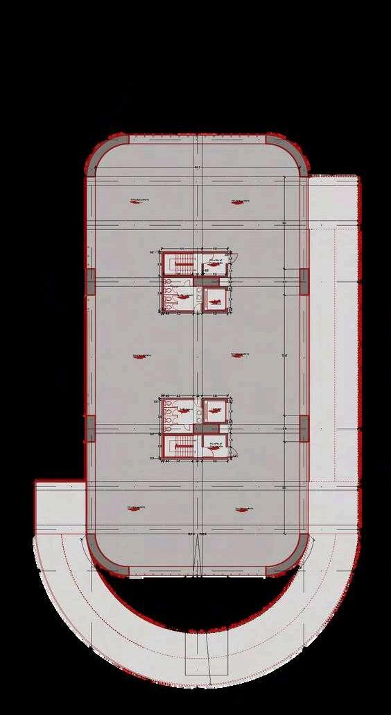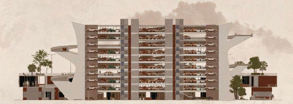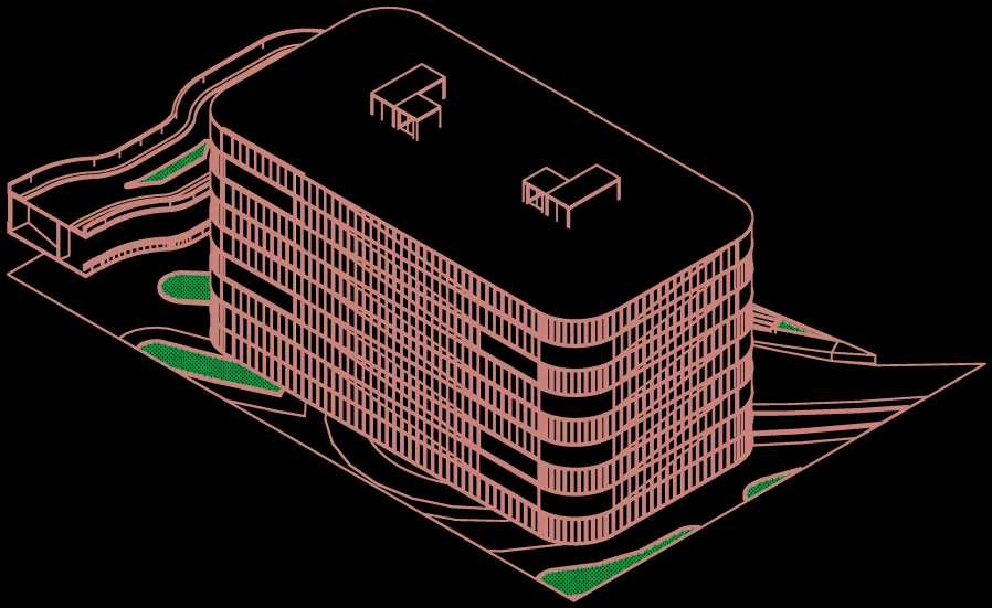 Las plantas superiores del edificio de estacionamientosedesarrollanapartirde un sistema de repetición controlada de tres tipos de plantas intercaladas, estrategiaquepermiteoptimizareldiseño estructural y funcional, al mismo tiempo queaportadinamismoalavolumetríadel conjunto. En total, el edificio cuenta con sieteplantas:elprimertipodeplantase repite en tres niveles, mientras que el segundo y el tercer tipo se repiten dos vecescadauno.Estaalternanciaevitala monotoníaespacialygeneravariaciones perceptiblestantoenelinteriorcomoen la lectura exterior del edificio. Cada una de estas plantas mantiene las mismas especificaciones funcionales de la primeraplanta,priorizandoladisposición ordenada de los cajones de estacionamiento, una circulación vehicularclaraycontinua,lapresenciade la rampa como elemento articulador verticalylaincorporacióndeescalerasde evacuación estratégicamente ubicadas. Noseincorporanusosadicionalesenlas plantas, reforzando así la claridad programática del edificio y garantiza un funcionamiento eficiente, seguro y comprensibleparalosusuarios. NIVEL 7