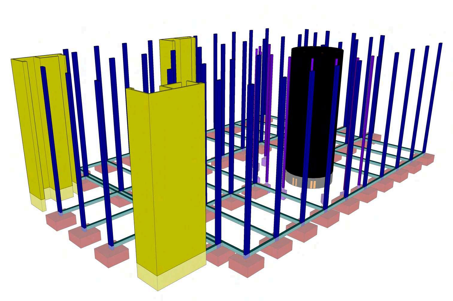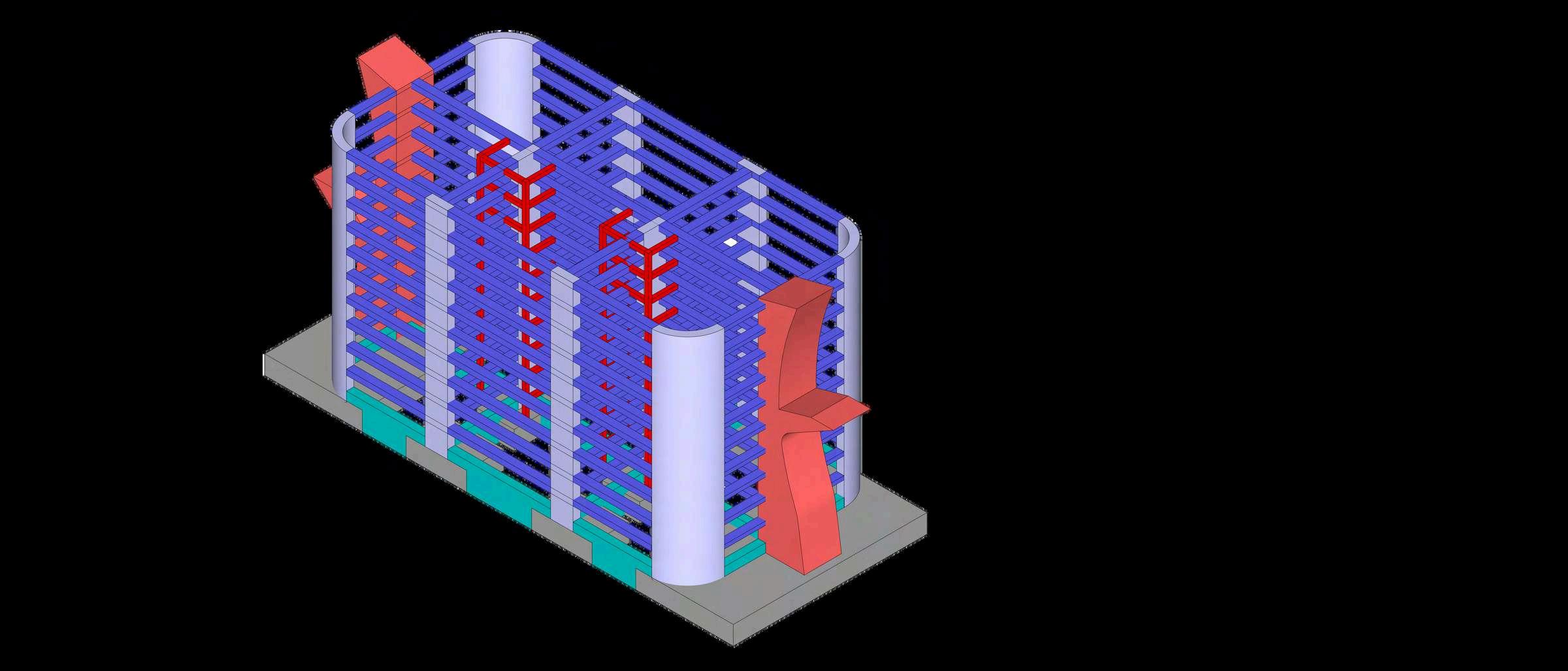 Sobre la cimentación se desarrolla un sistemaregulardecolumnasdeconcreto armado, organizadas según una modulaciónconstantequerespondeala disposición de los cajones de estacionamiento y a las circulaciones vehiculares. Estas columnas transmiten lascargasverticaleshacialaszapatasy trabajandemaneraconjuntaconvigasy losas, conformando un esquema estructural eficiente y repetitivo. La regularidad del sistema facilita tanto la construcción como el control estructural enlosdistintosnivelesdeledificio.