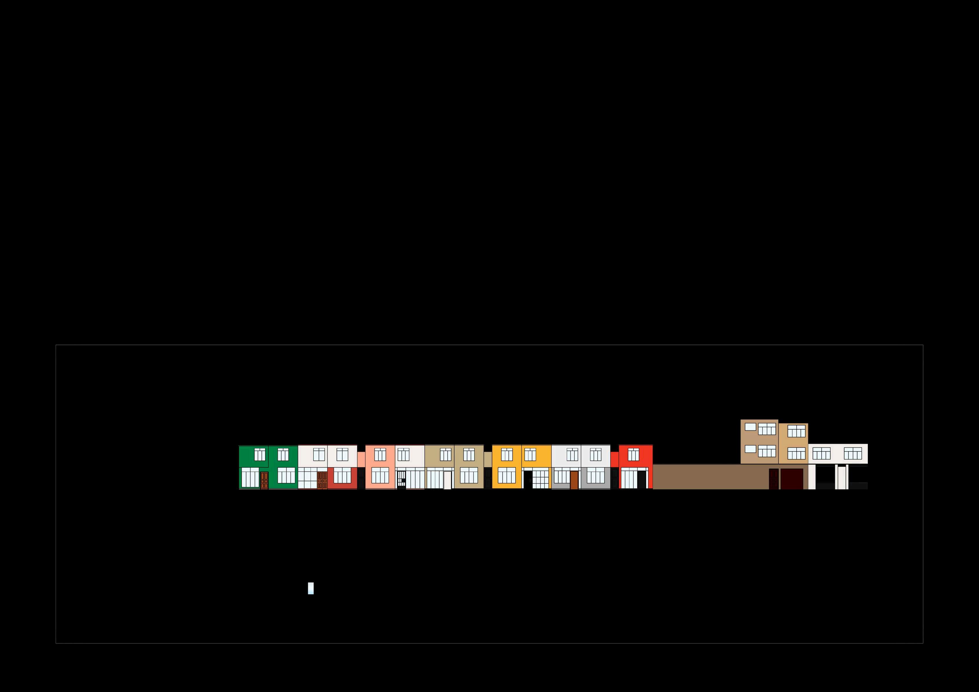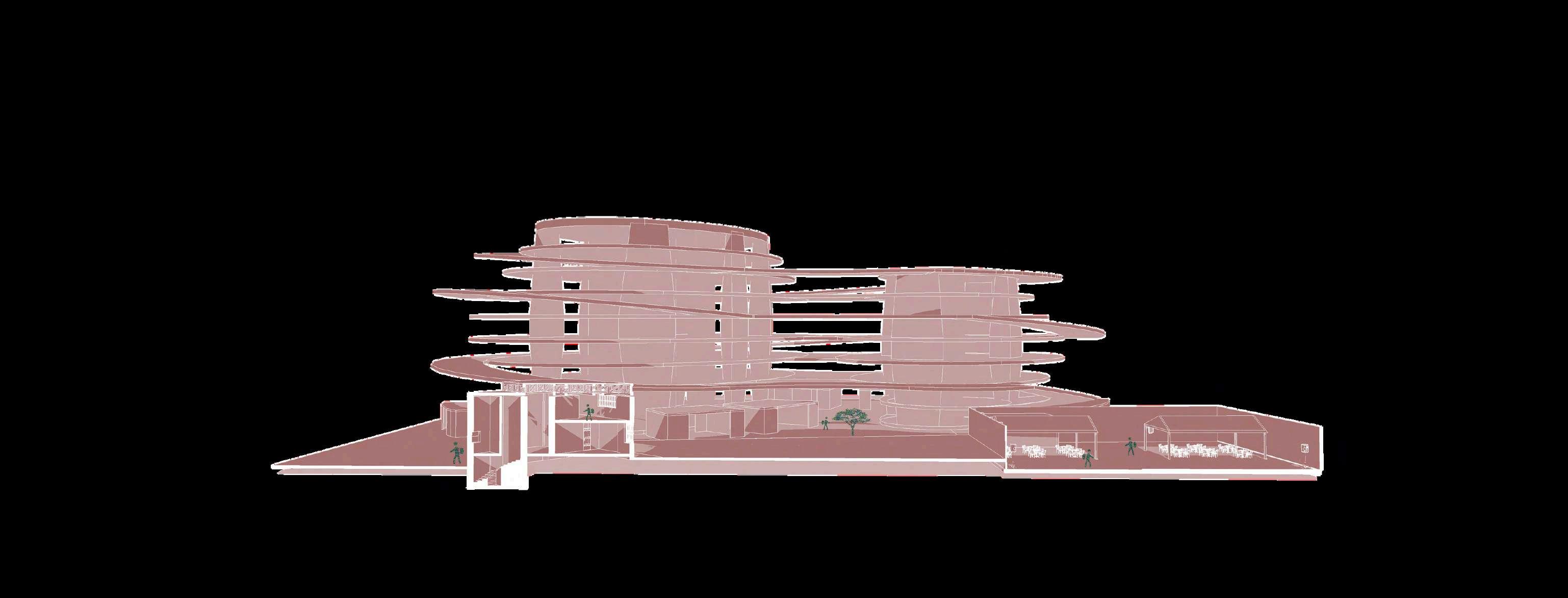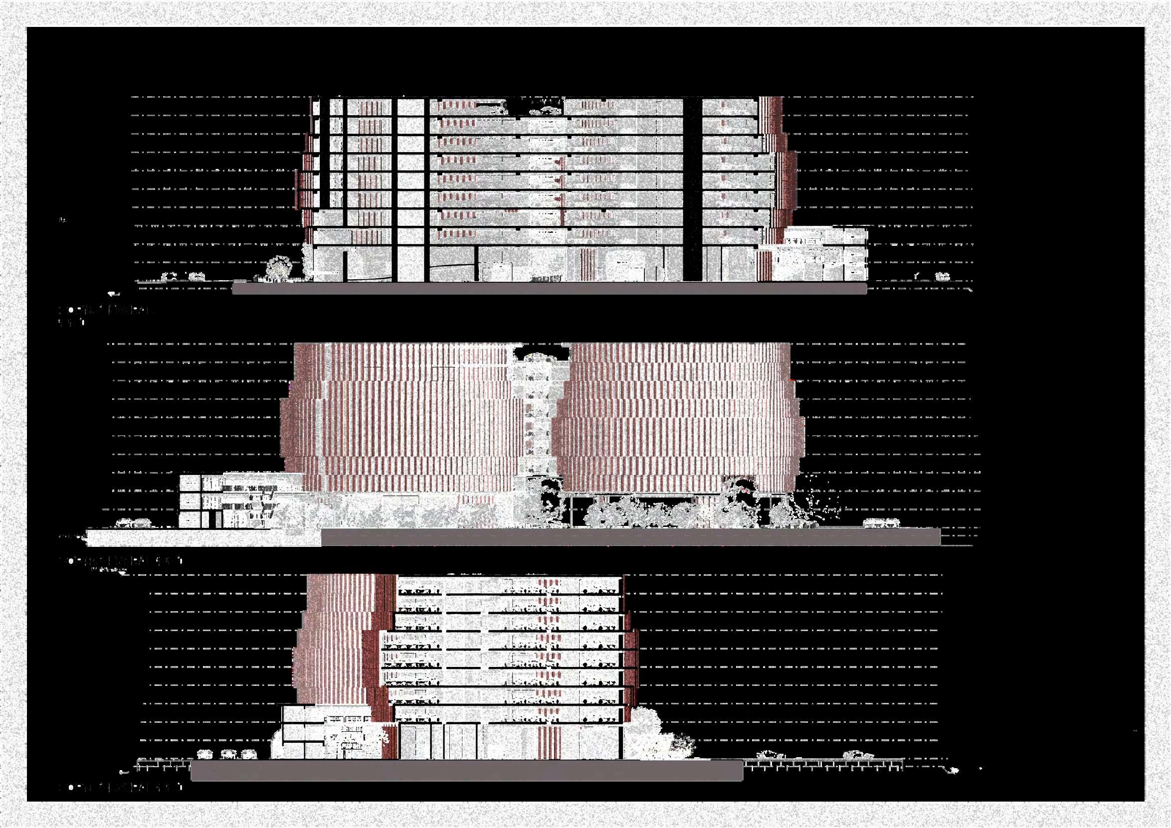 Finalmente, las secciones muestran la relación del edificio con el entorno inmediato, especialmente en los puntos donde se generan aperturas y vacíos. Estas secciones permiten visualizar cómo el volumen se fragmenta parcialmente, generando mayor permeabilidad visual y una lectura más ligeradelconjuntodesdeelexterior,en relación directa con el parque urbano y losespaciospúblicosadyacentes.