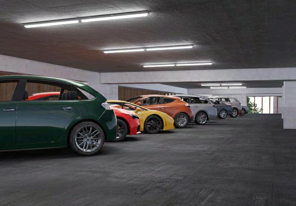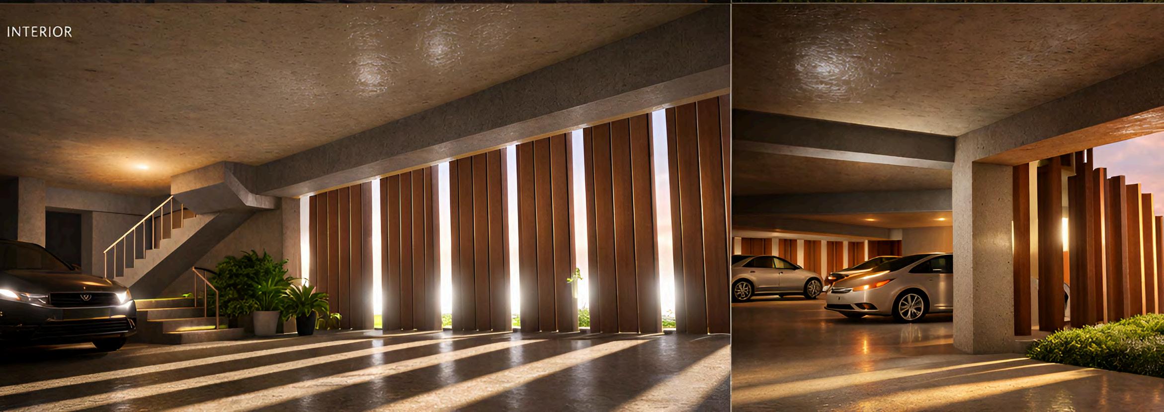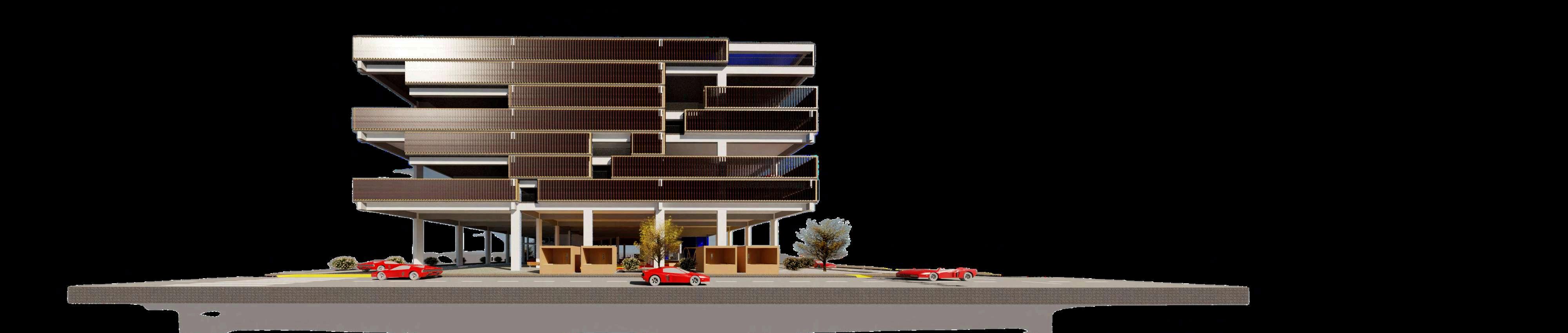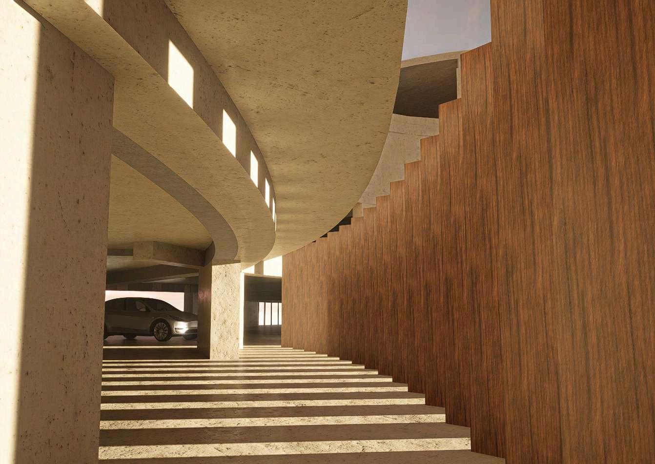 Las imágenes evidencian el tratamiento de las fachadas del edificio, donde el concreto se combina con celosías de madera de roble y barandillas de acero inoxidable. Esta combinación material genera una lectura más permeable del volumen, permitiendo visualizar la relación entre el interior del estacionamiento y el exterior.Asimismo, se representan las aperturas y vacíos estratégicosquefavorecenelingresode iluminaciónnaturalyventilación.