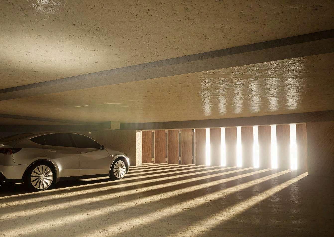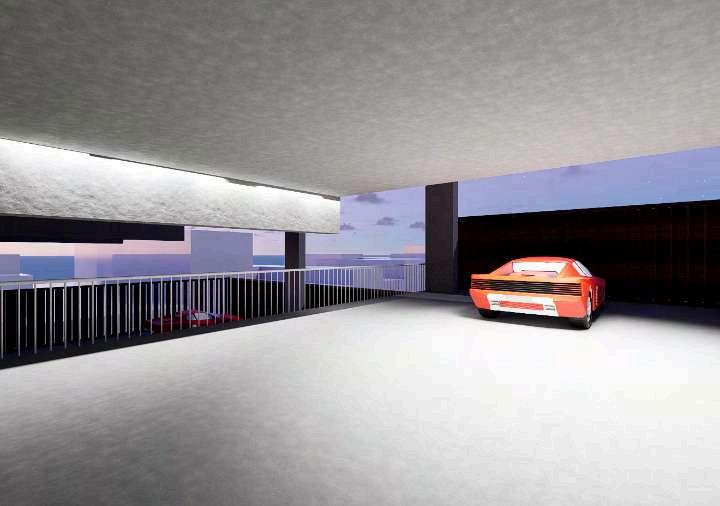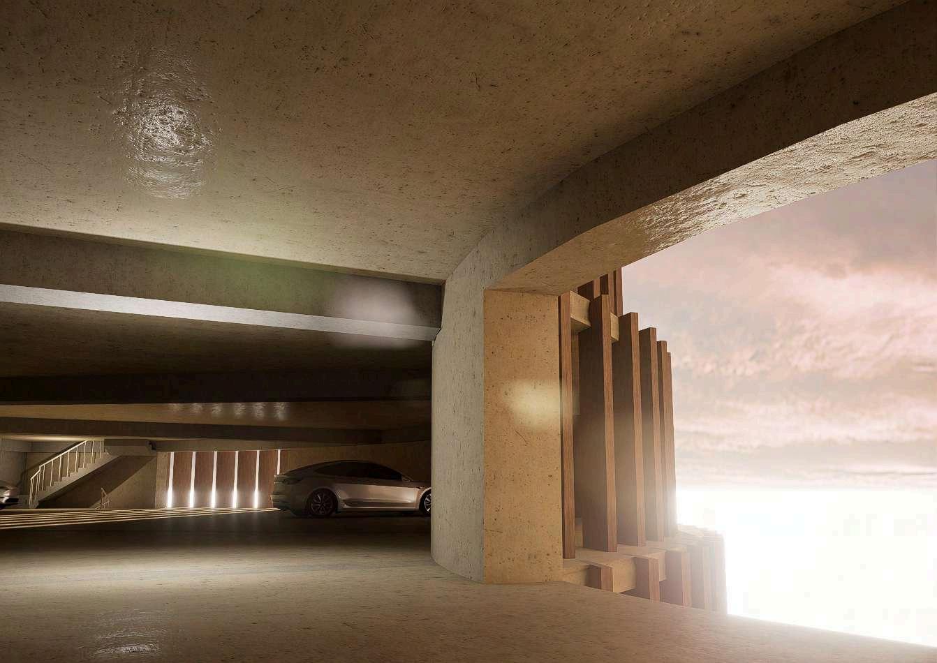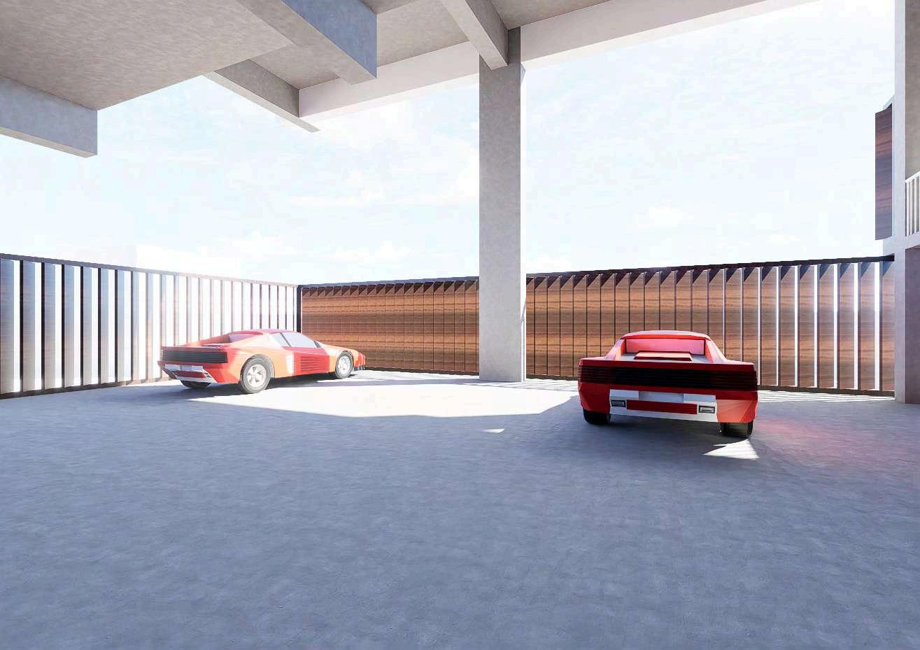 Las imágenes evidencian el tratamiento de las fachadas del edificio, donde el concreto se combina con celosías de madera de roble y barandillas de acero inoxidable. Esta combinación material genera una lectura más permeable del volumen, permitiendo visualizar la relación entre el interior del estacionamiento y el exterior.Asimismo, se representan las aperturas y vacíos estratégicosquefavorecenelingresode iluminaciónnaturalyventilación.