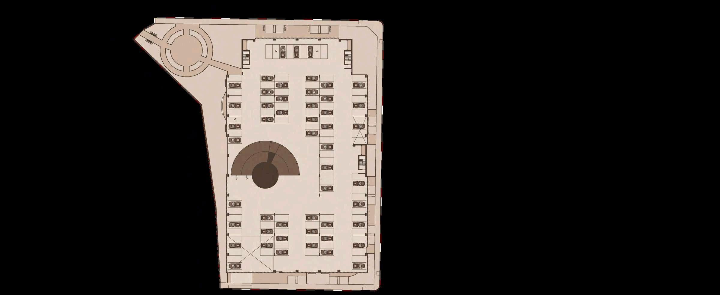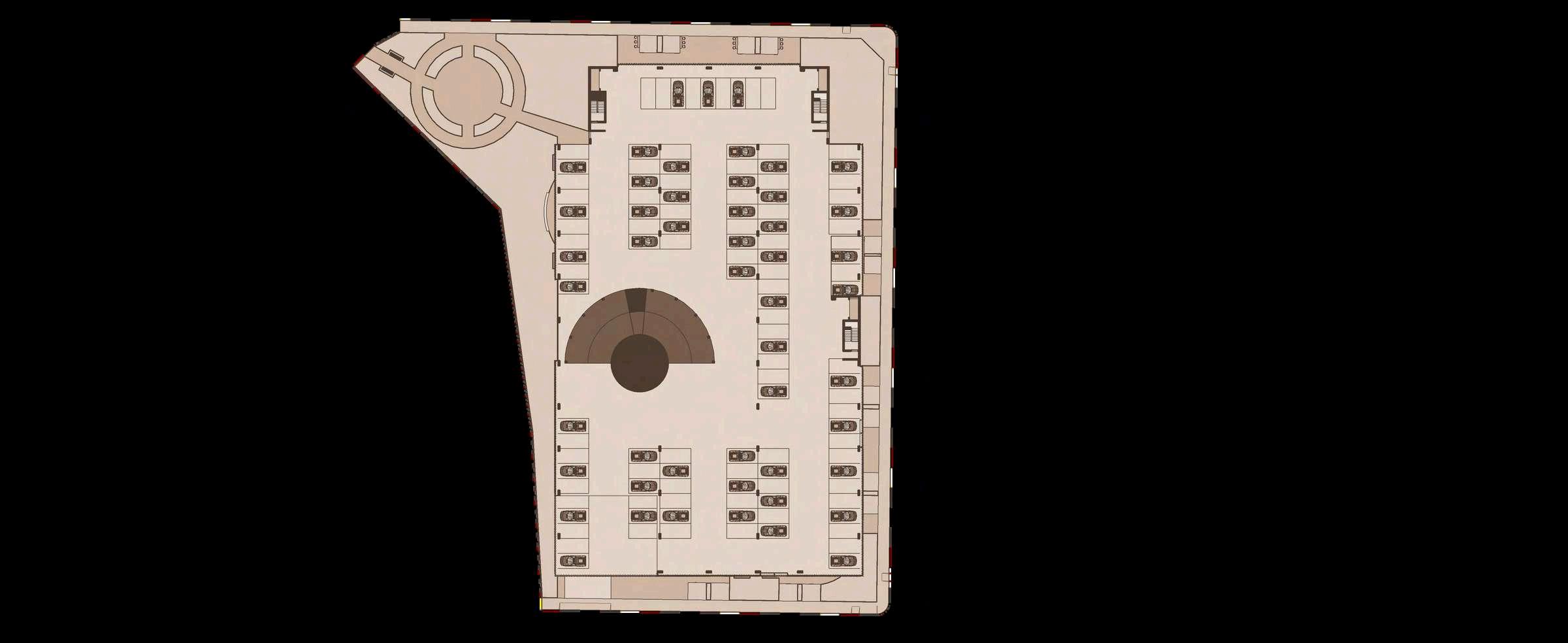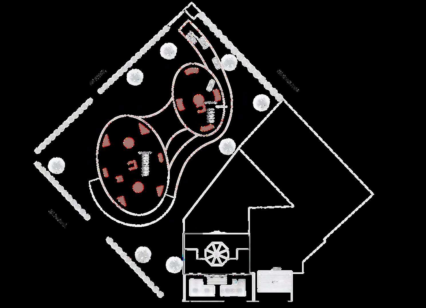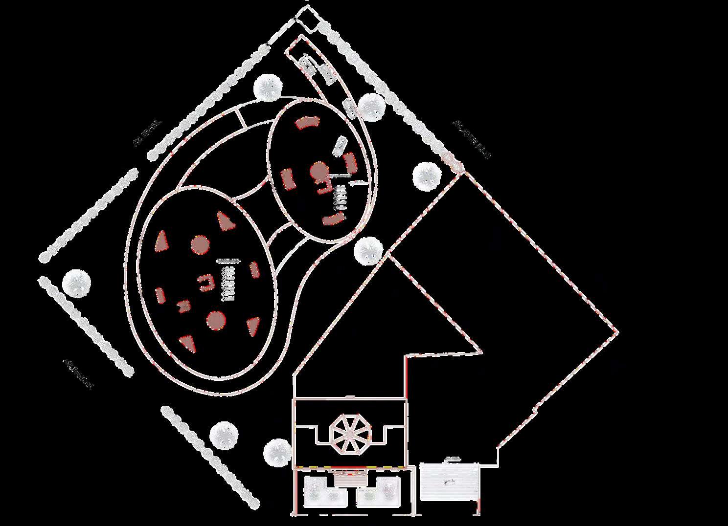 El interior del parque se destina principalmente a zonas de recreación y estancia, priorizando superficies libres, áreasajardinadasyrecorridospeatonales continuos que permiten una experiencia fluida y accesible. La disposición abierta delespaciocentralfavorecelaflexibilidad de usos, desde actividades recreativas hastaencuentroscomunitarios.Integrada de manera estratégica en la planta, se ubica el inicio de la rampa hacia el edificio de estacionamiento, concebida como un elemento de transición que articula el parque con la infraestructura vehicular,minimizandosuimpactovisual ymanteniendolacontinuidaddelespacio.