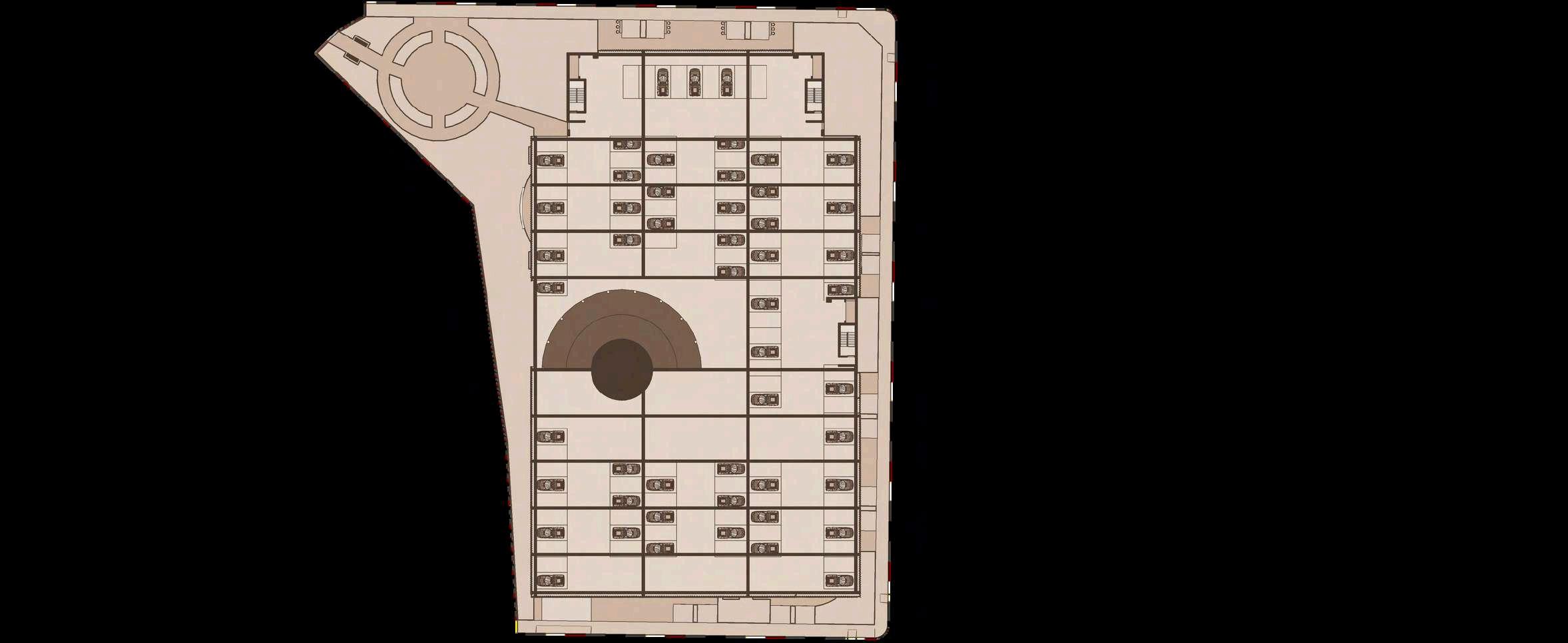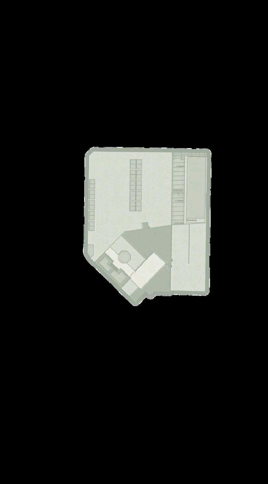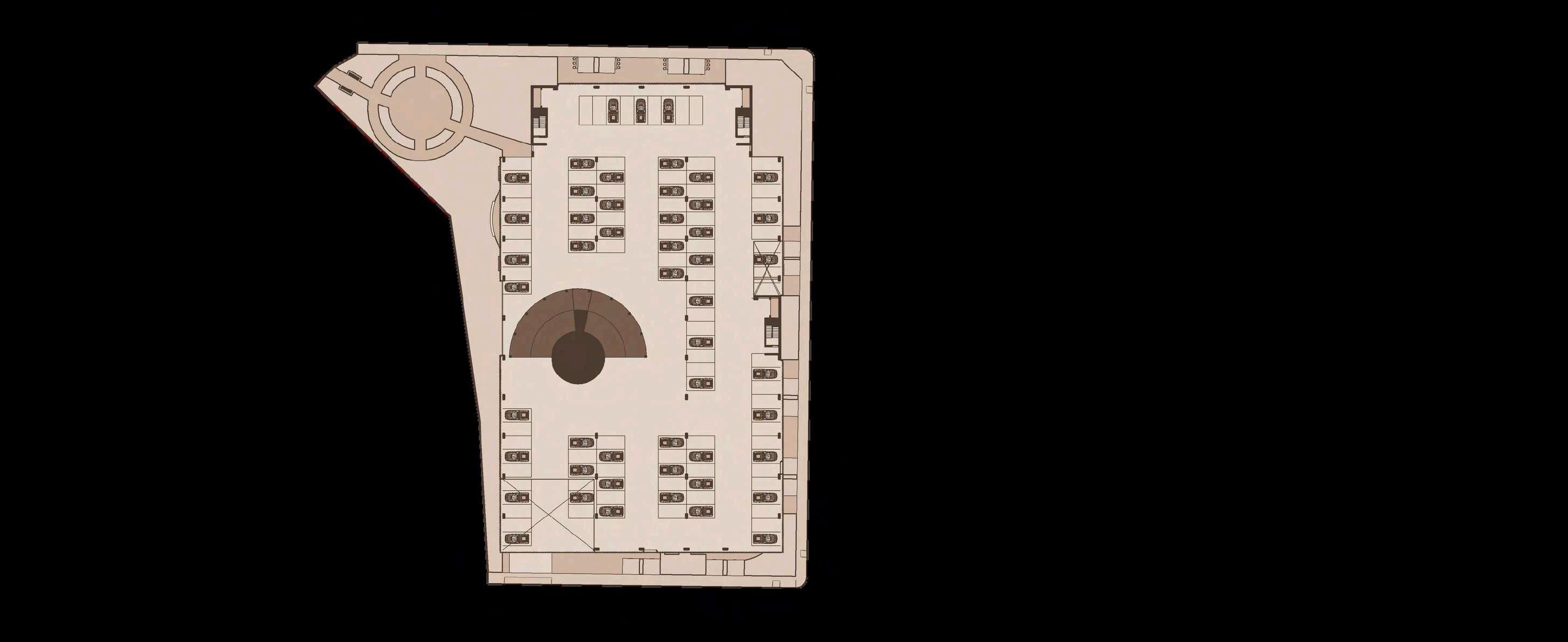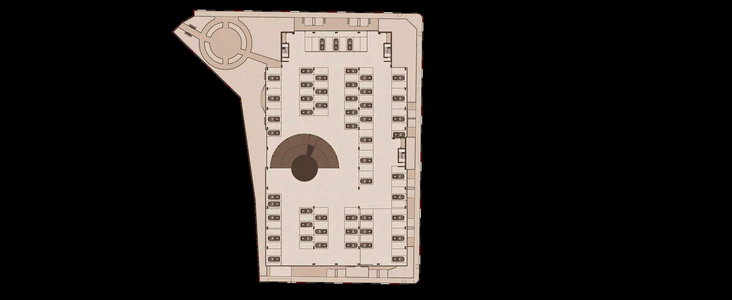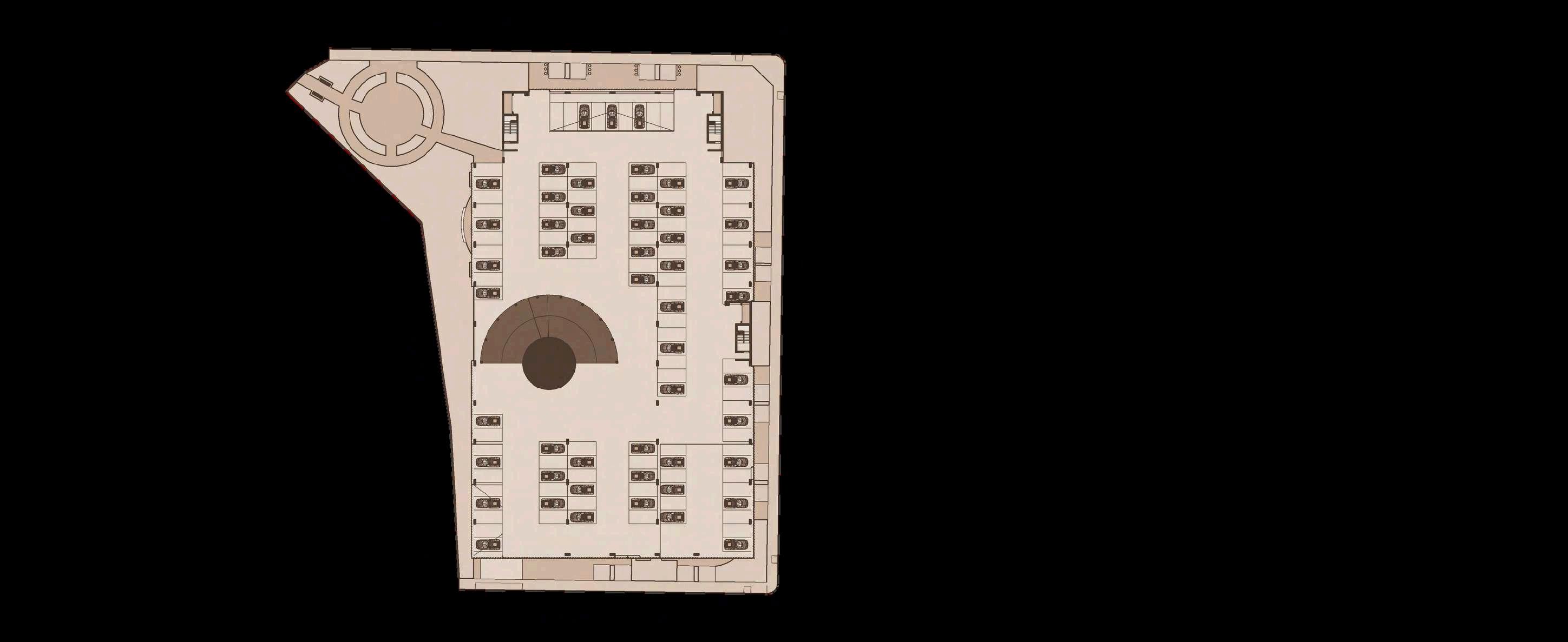 El interior del parque se destina principalmente a zonas de recreación y estancia, priorizando superficies libres, áreasajardinadasyrecorridospeatonales continuos que permiten una experiencia fluida y accesible. La disposición abierta delespaciocentralfavorecelaflexibilidad de usos, desde actividades recreativas hastaencuentroscomunitarios.Integrada de manera estratégica en la planta, se ubica el inicio de la rampa hacia el edificio de estacionamiento, concebida como un elemento de transición que articula el parque con la infraestructura vehicular,minimizandosuimpactovisual ymanteniendolacontinuidaddelespacio.