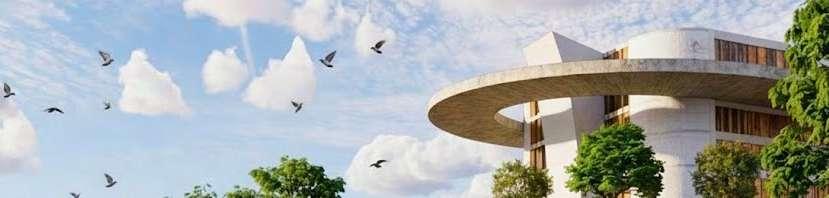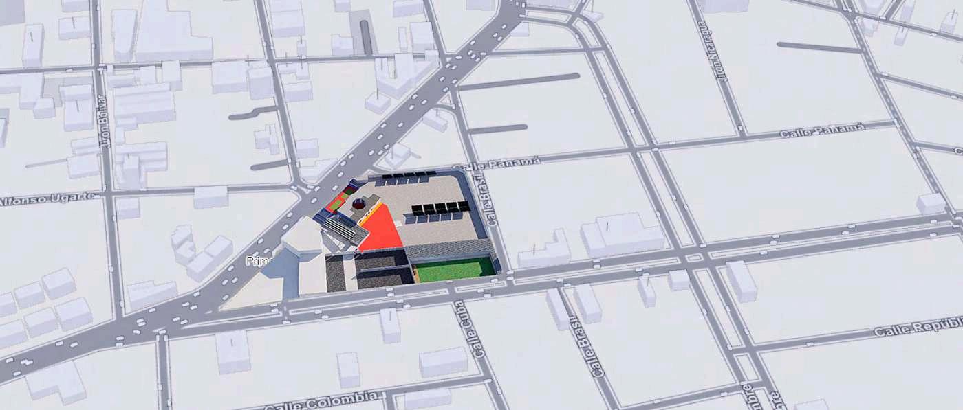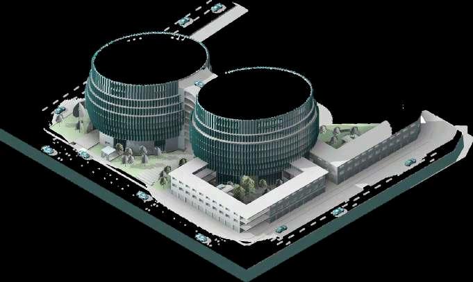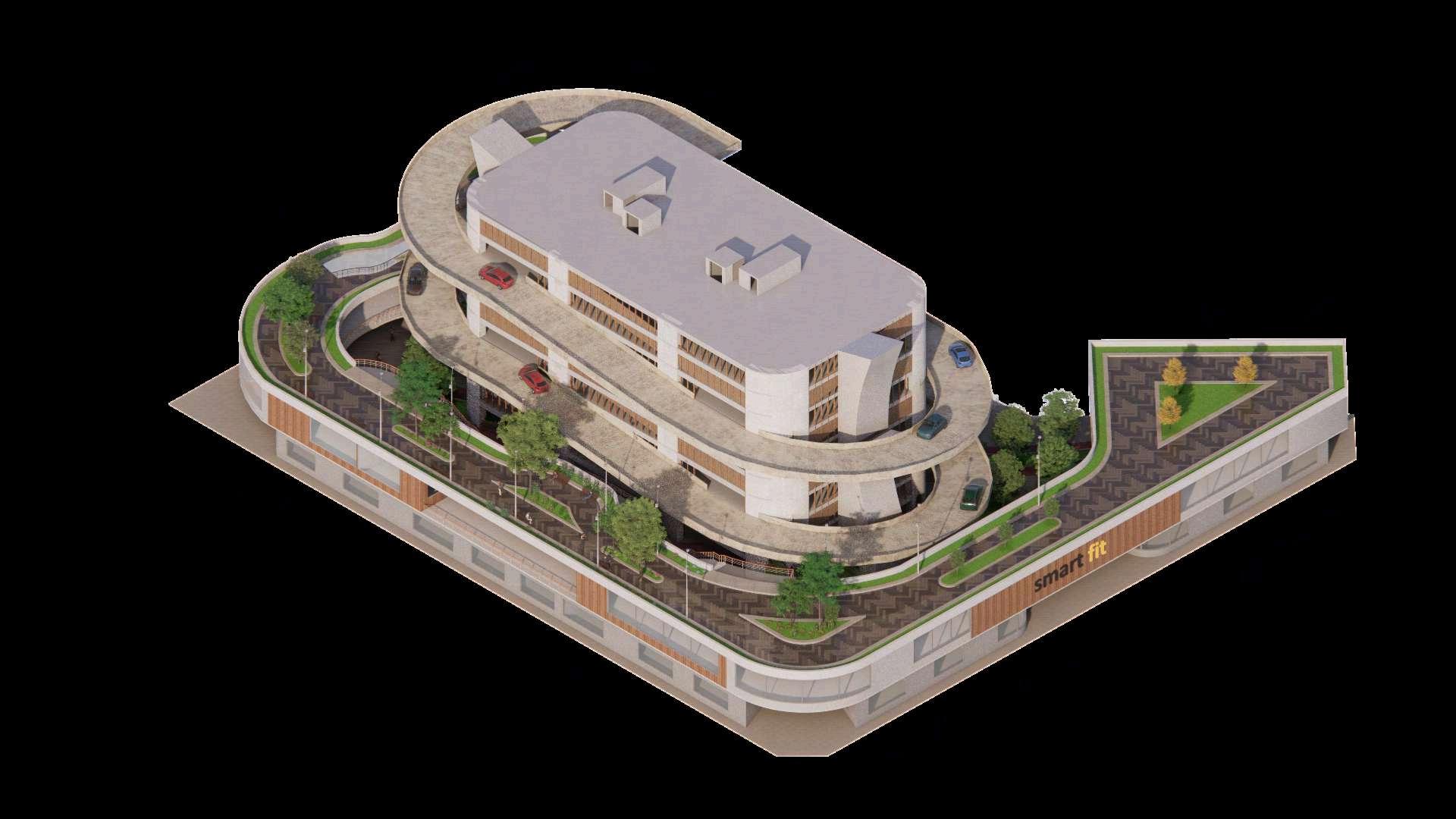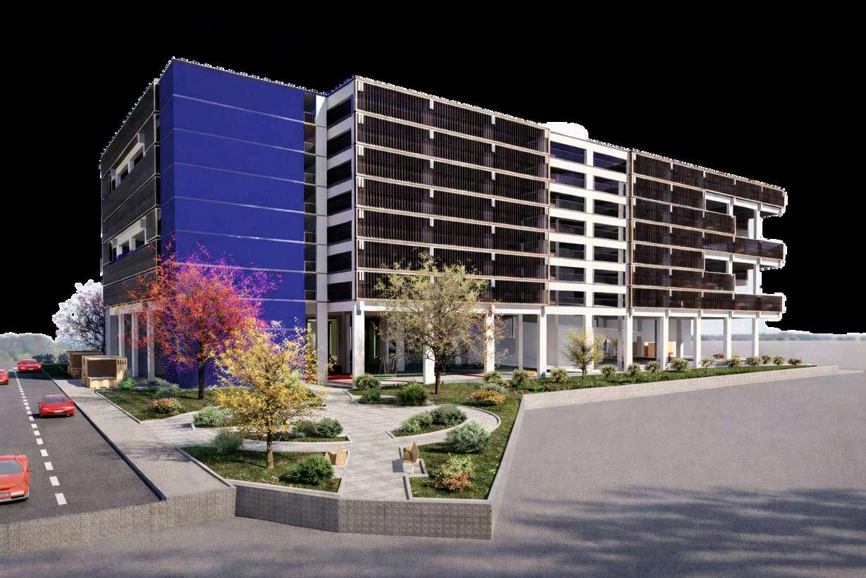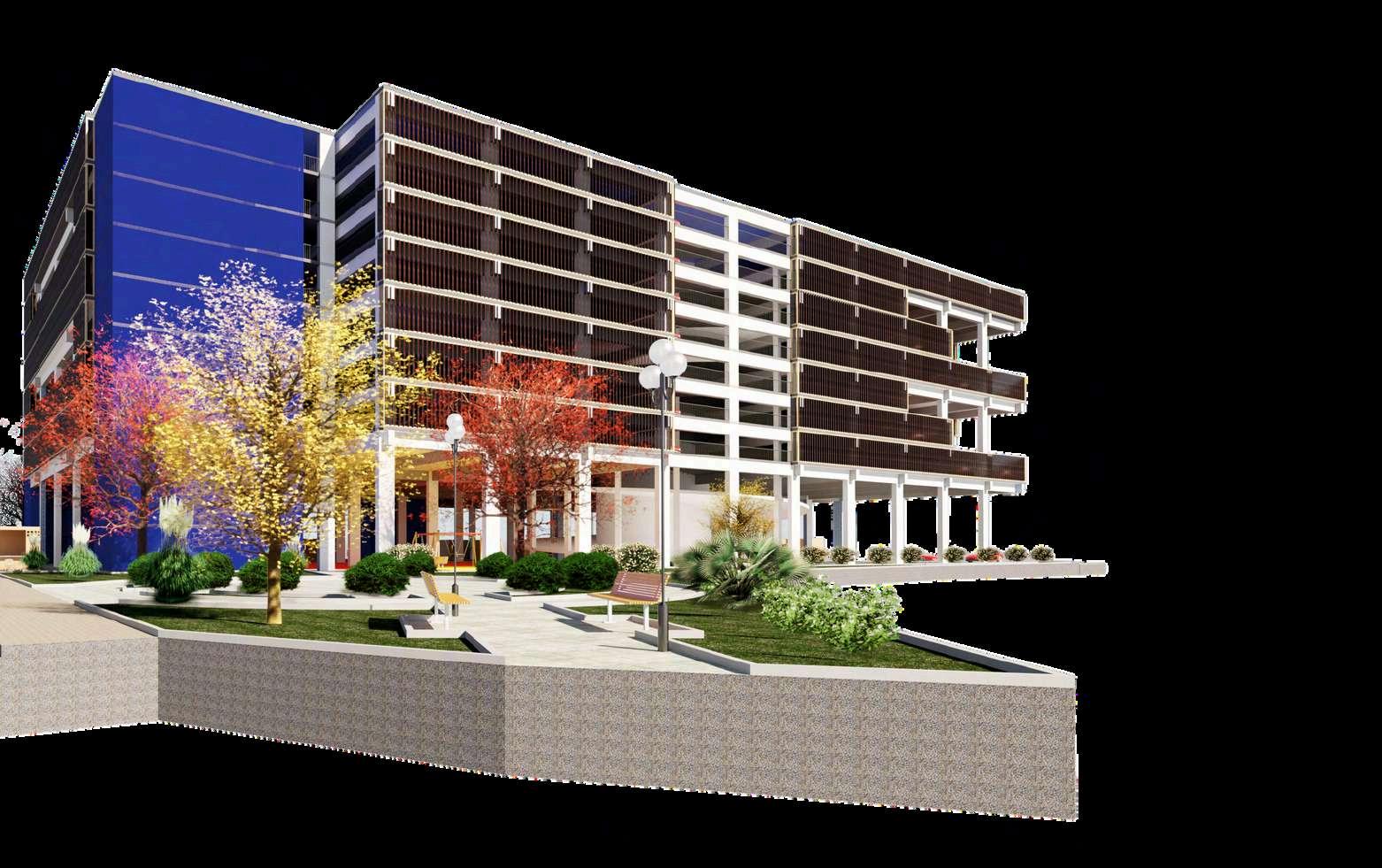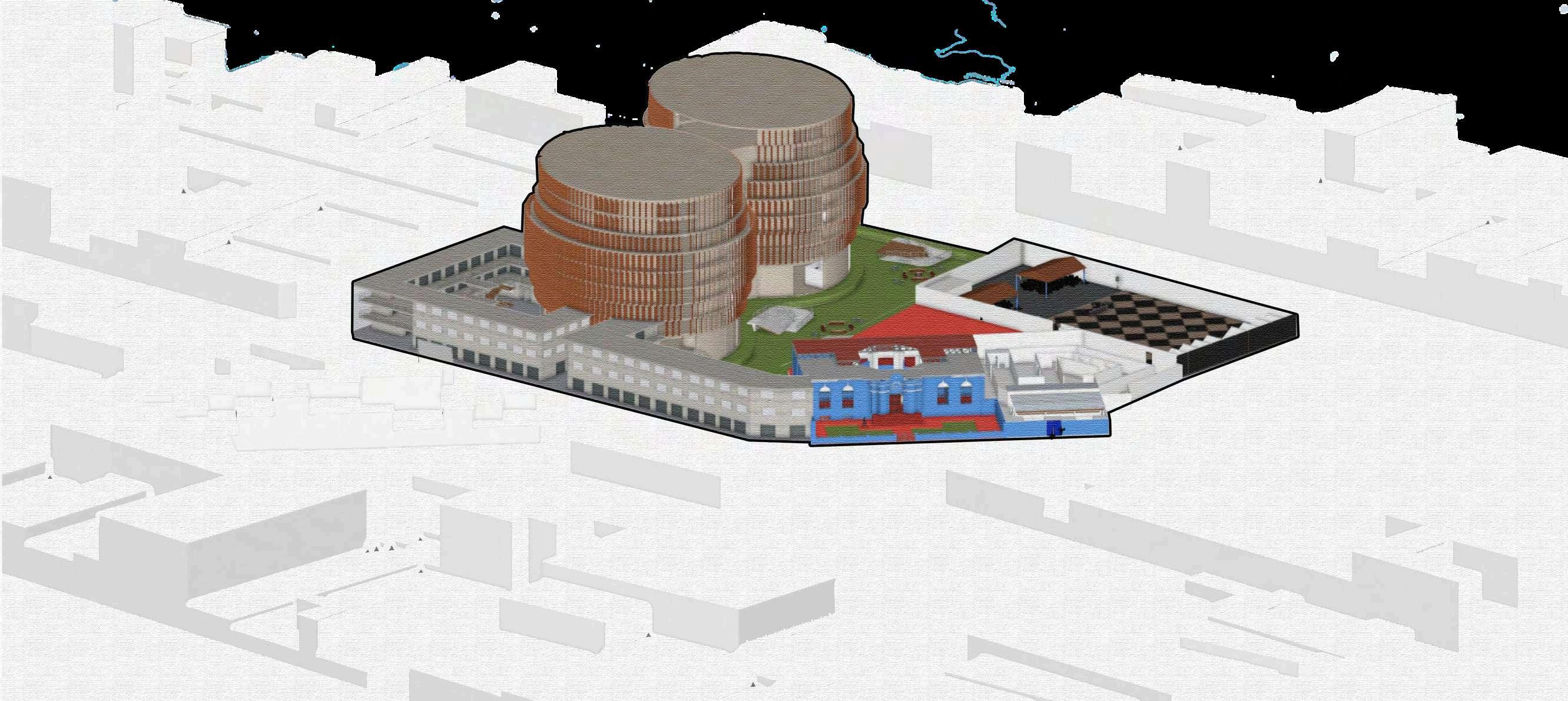 La implantación del proyecto en su contexto se representa mediante imágenes que permiten comprender la relaciónespacialyvisualentreeledificio deestacionamiento,elparqueurbanoyel entorno inmediato. En estas vistas se aprecia cómo el conjunto se inserta dentro del tejido urbano existente, respetando la escala del lugar y estableciendo una presencia clara pero equilibrada. El volumen principal se percibe como una pieza de carácter sobrio,cuyaformayalturadialogancon los espacios abiertos circundantes, evitando una lectura dominante y favoreciendo su integración al paisaje urbano.