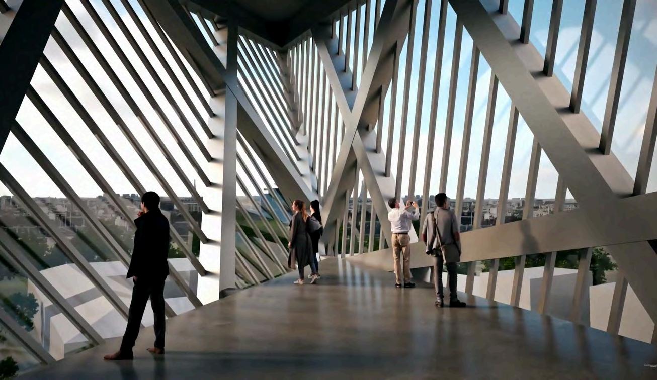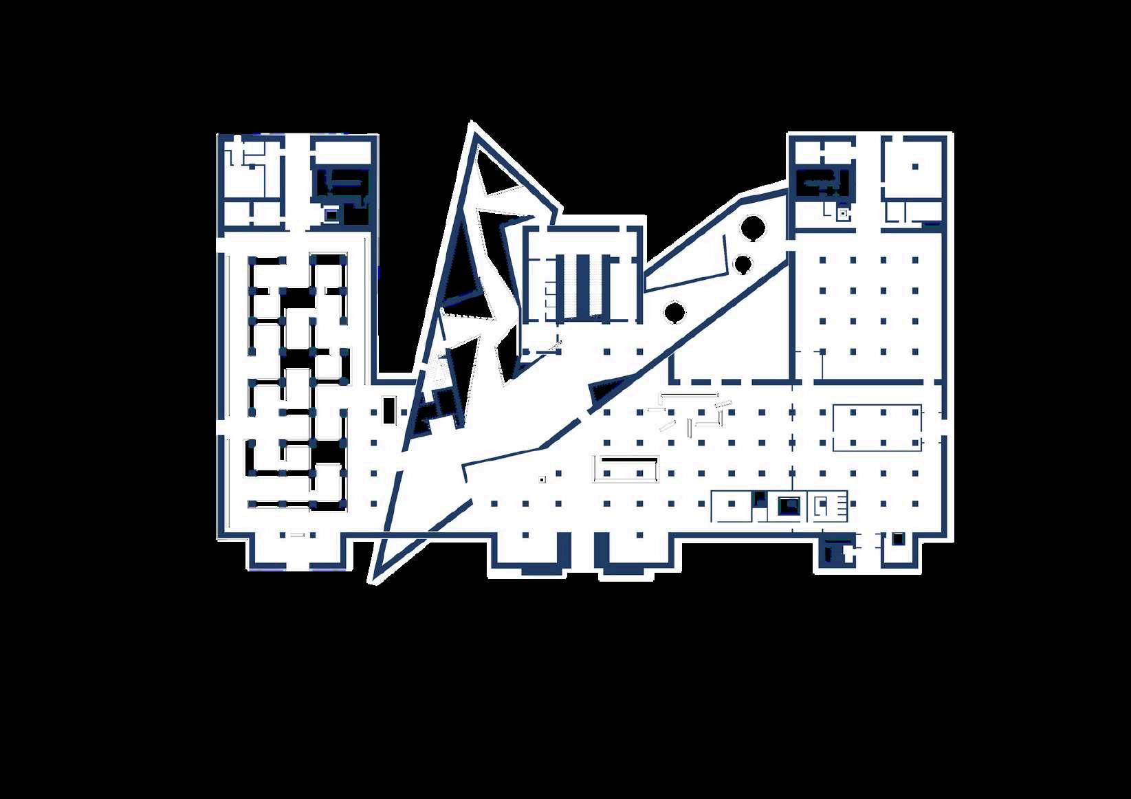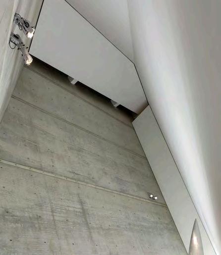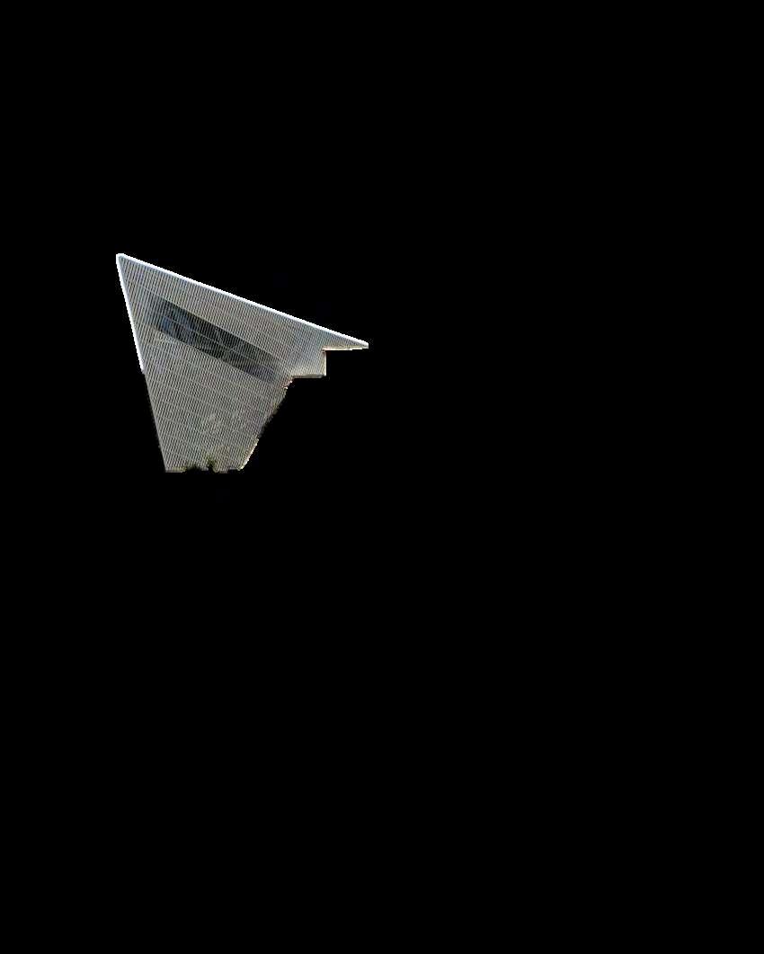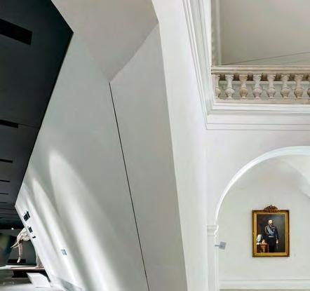la rigidez y el orden clásico de la construcción original, estableciendo un diálogo entre pasado y presente. La relación entre ambos volúmenes –el bloque macizo y la cuña metálica–generaunjuegodetensionesquenosolo redefine la imagen del museo, sino que tambiénloconvierteenunpuntofocaldel distrito, visible y reconocible a gran distancia.