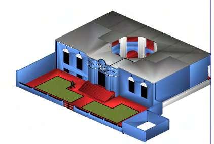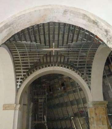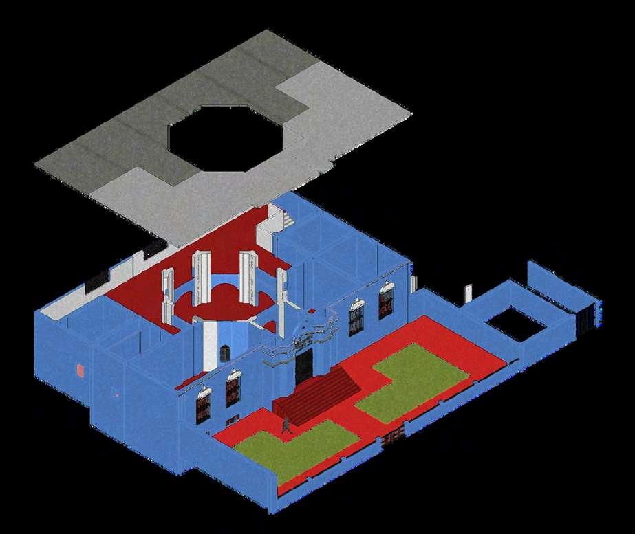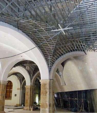 Labóvedadecruceríadelaplantabaja fueparcialmentereconstruidacontechos elaboradosenplacasdeyeso,integrando solucionescontemporáneasquerespetan la estructura original. Estas placas, además,conectanlacuñaconelmuseo, permitiendounadistribuciónuniformede las cargas de la nueva estructura hacia los muros existentes, reforzando su estabilidad y asegurando una adecuada integraciónentreloantiguoylomoderno.