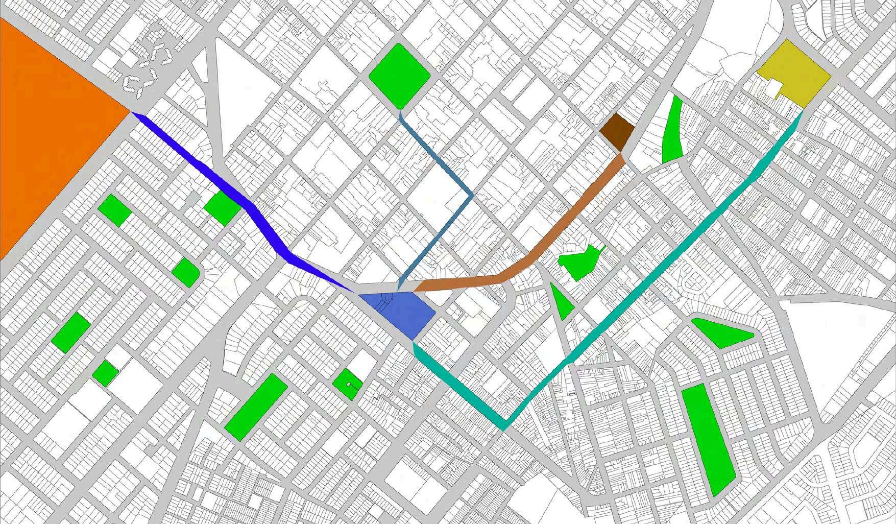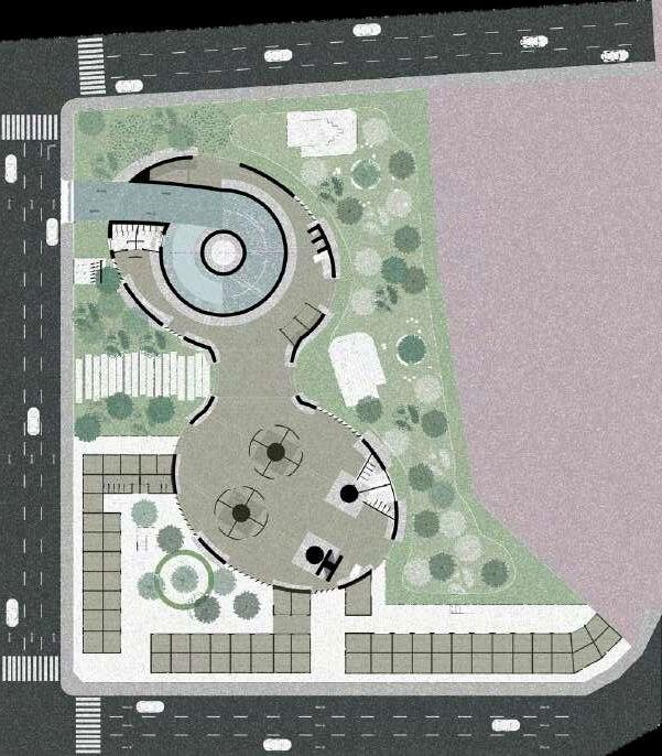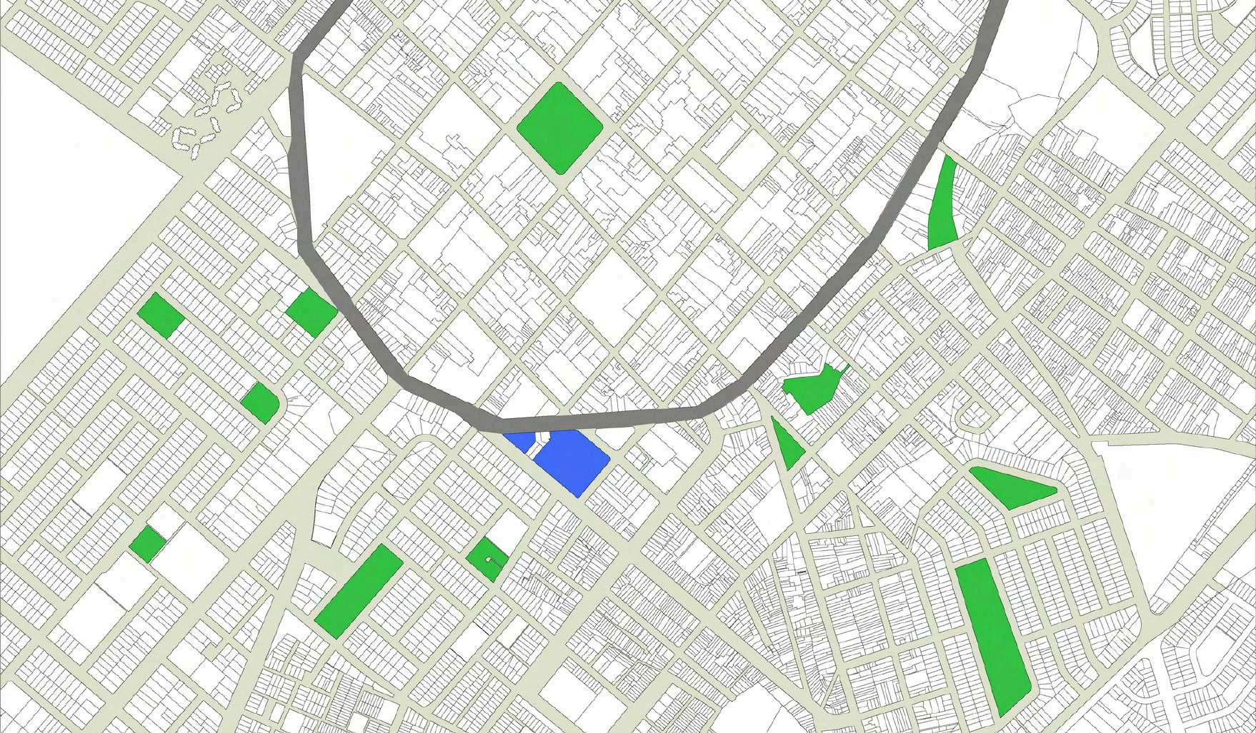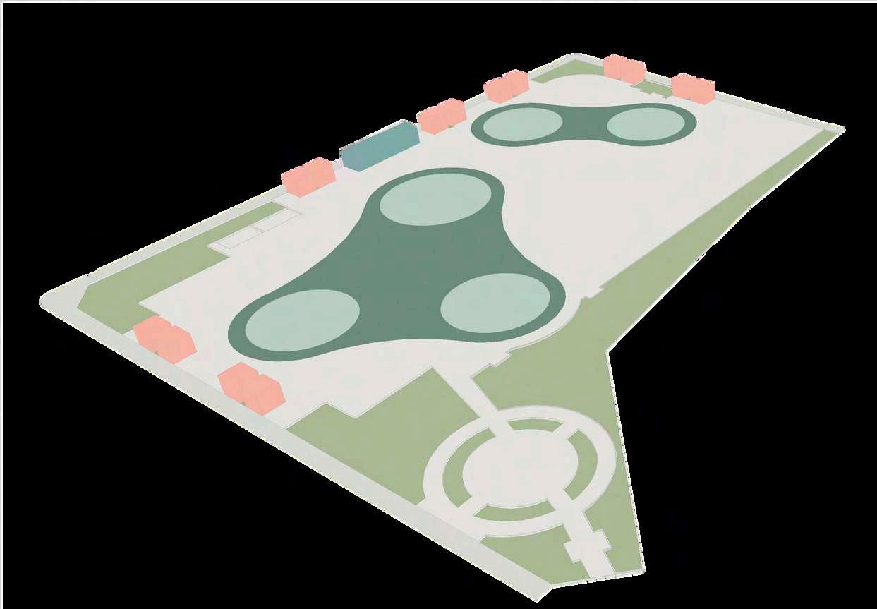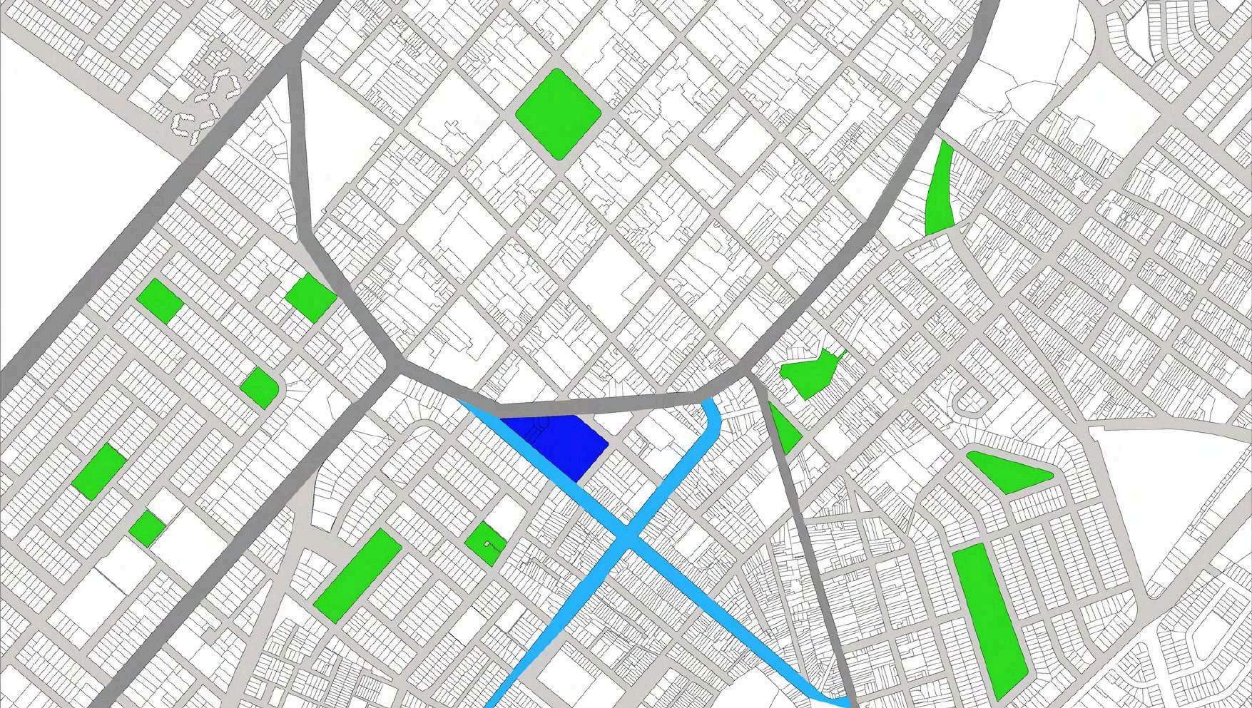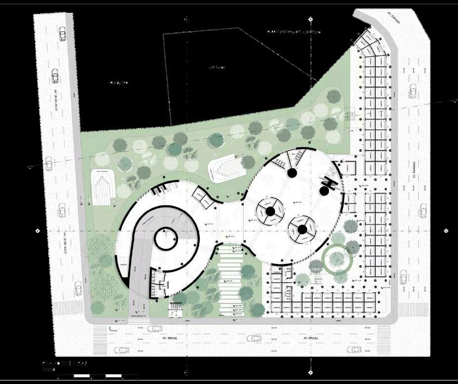 La distribución de la planta del parque urbanoseorganizaapartirdeunaclara diferenciación entre áreas activas y espaciosderecreación.Enlosbordesdel terreno se disponen los bloques de comercio, funcionando como un filtro urbano que define el límite del parque y genera frentes activos hacia el entorno inmediato. Estos volúmenes concentran actividades de servicio y apoyo, favoreciendolapermanenciadeusuarios y el dinamismo del espacio público sin interferirconlasáreasverdescentrales.