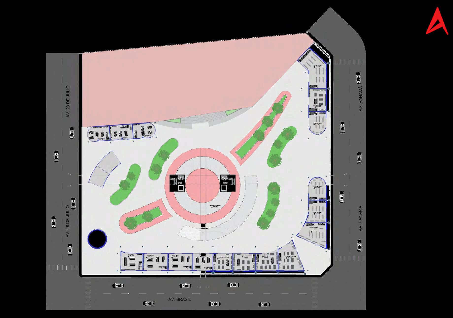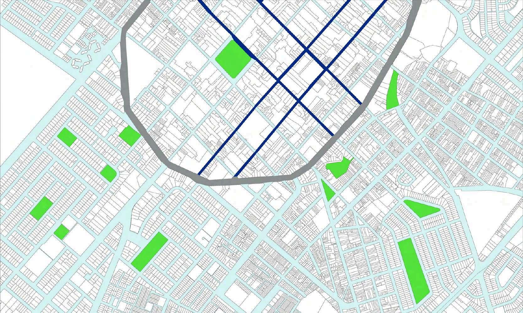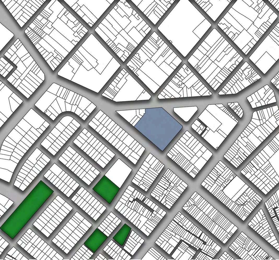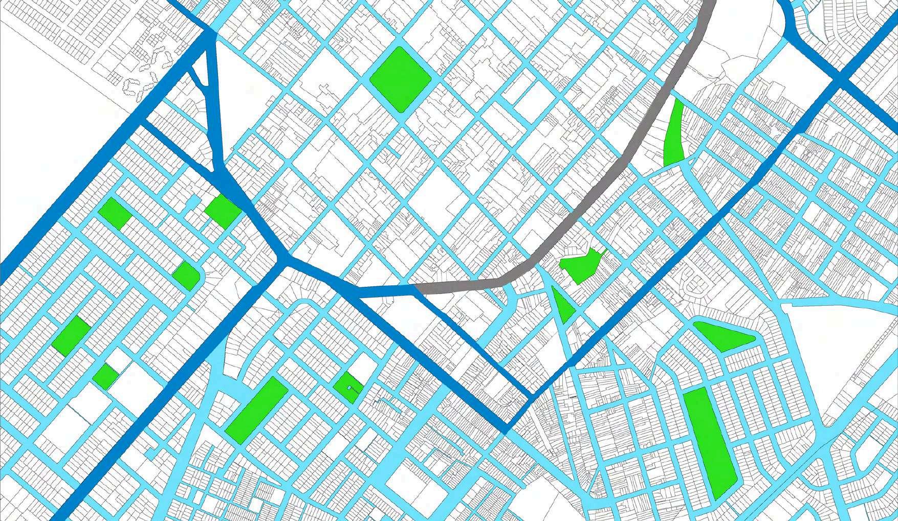 La distribución de la planta del parque urbanoseorganizaapartirdeunaclara diferenciación entre áreas activas y espaciosderecreación.Enlosbordesdel terreno se disponen los bloques de comercio, funcionando como un filtro urbano que define el límite del parque y genera frentes activos hacia el entorno inmediato. Estos volúmenes concentran actividades de servicio y apoyo, favoreciendolapermanenciadeusuarios y el dinamismo del espacio público sin interferirconlasáreasverdescentrales.