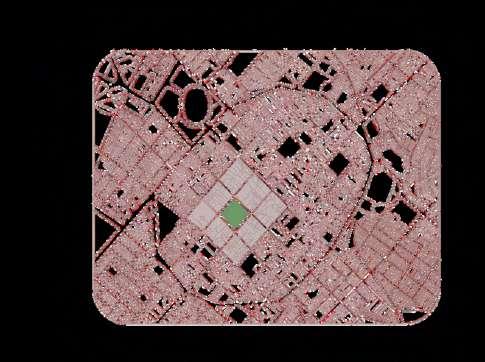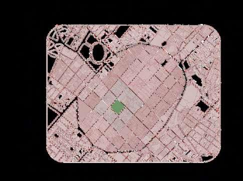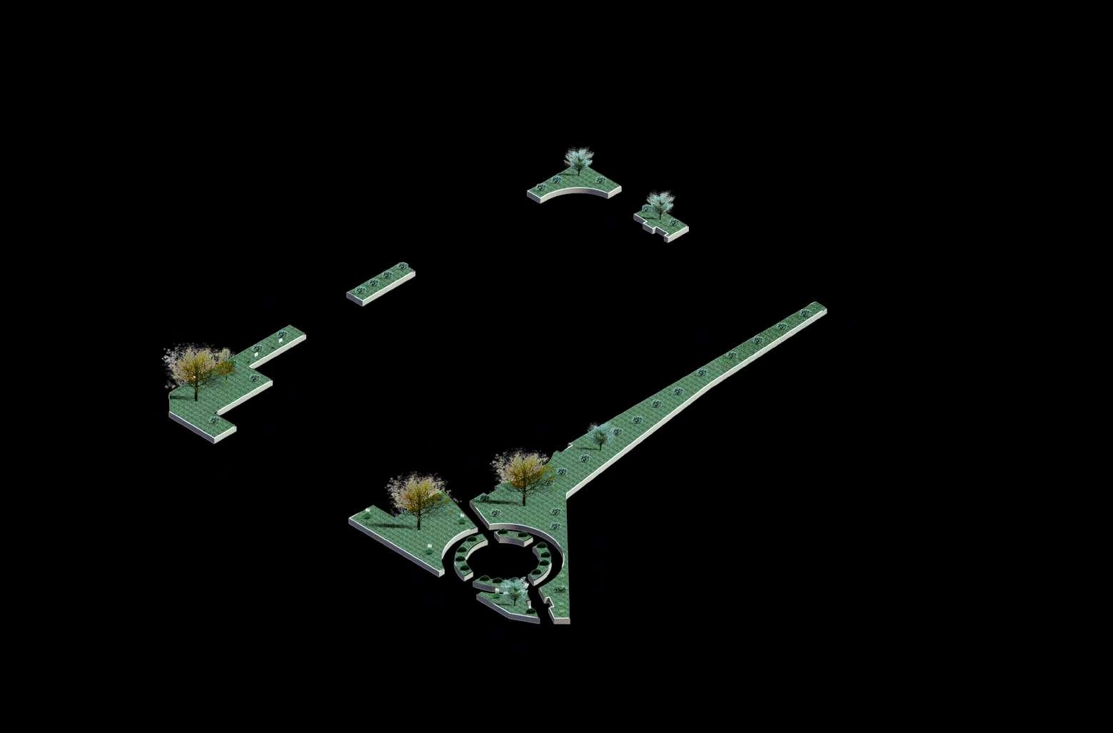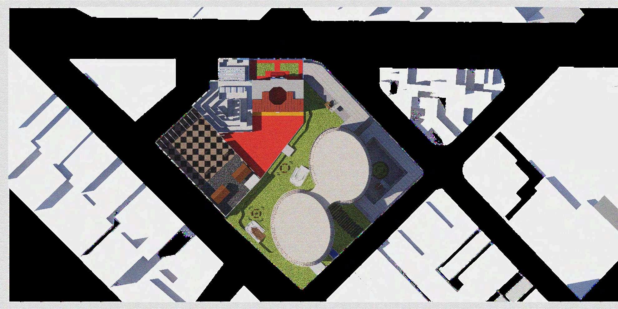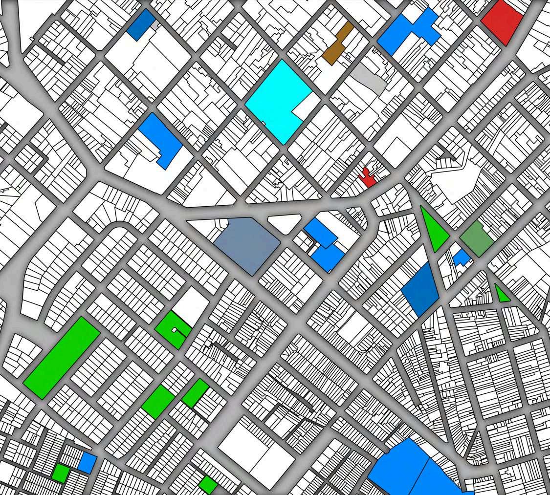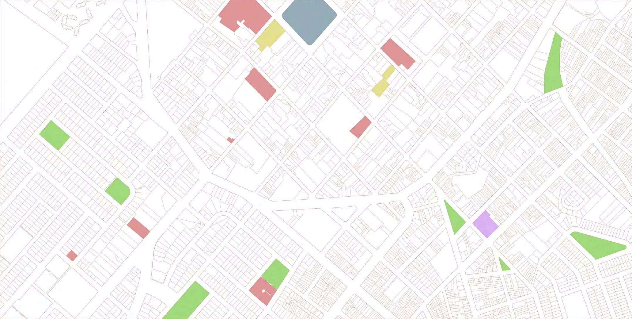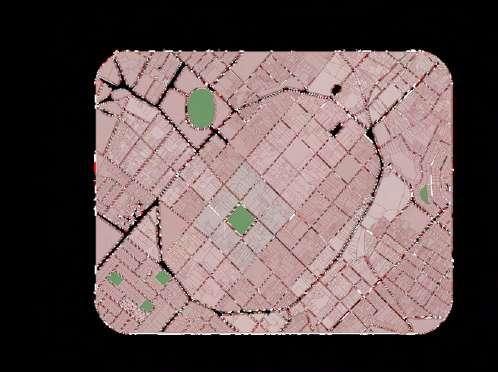 La distribución de la planta del parque urbanoseorganizaapartirdeunaclara diferenciación entre áreas activas y espaciosderecreación.Enlosbordesdel terreno se disponen los bloques de comercio, funcionando como un filtro urbano que define el límite del parque y genera frentes activos hacia el entorno inmediato. Estos volúmenes concentran actividades de servicio y apoyo, favoreciendolapermanenciadeusuarios y el dinamismo del espacio público sin interferirconlasáreasverdescentrales.