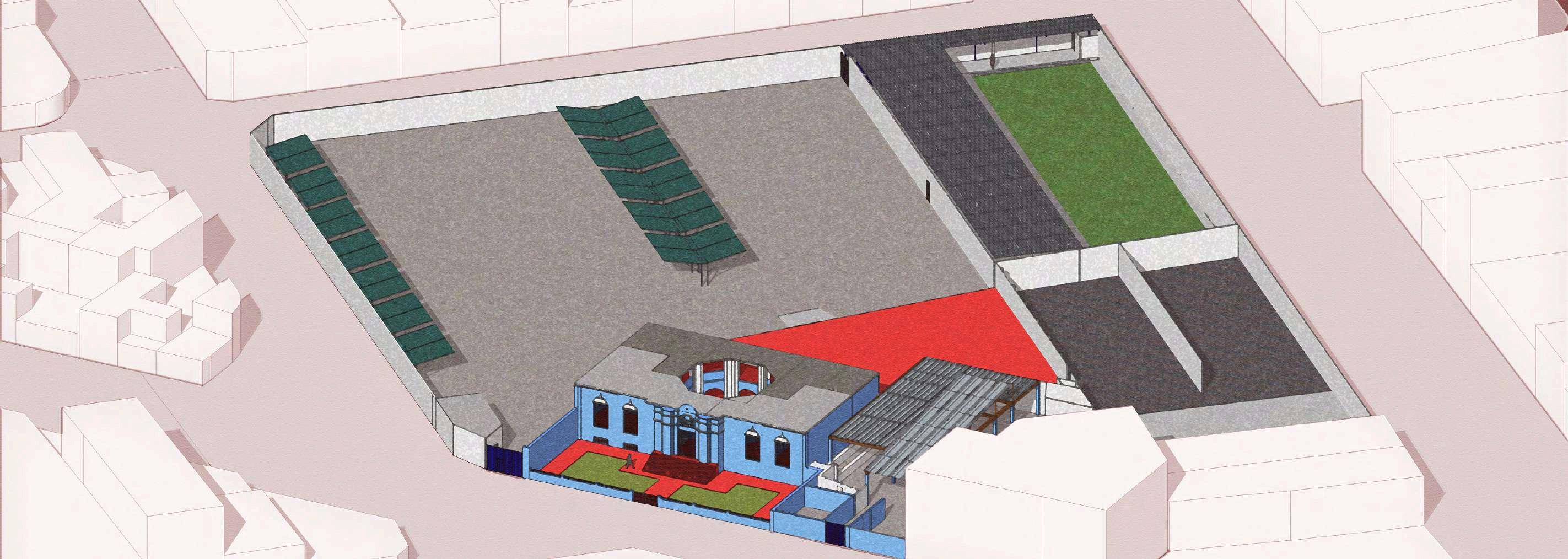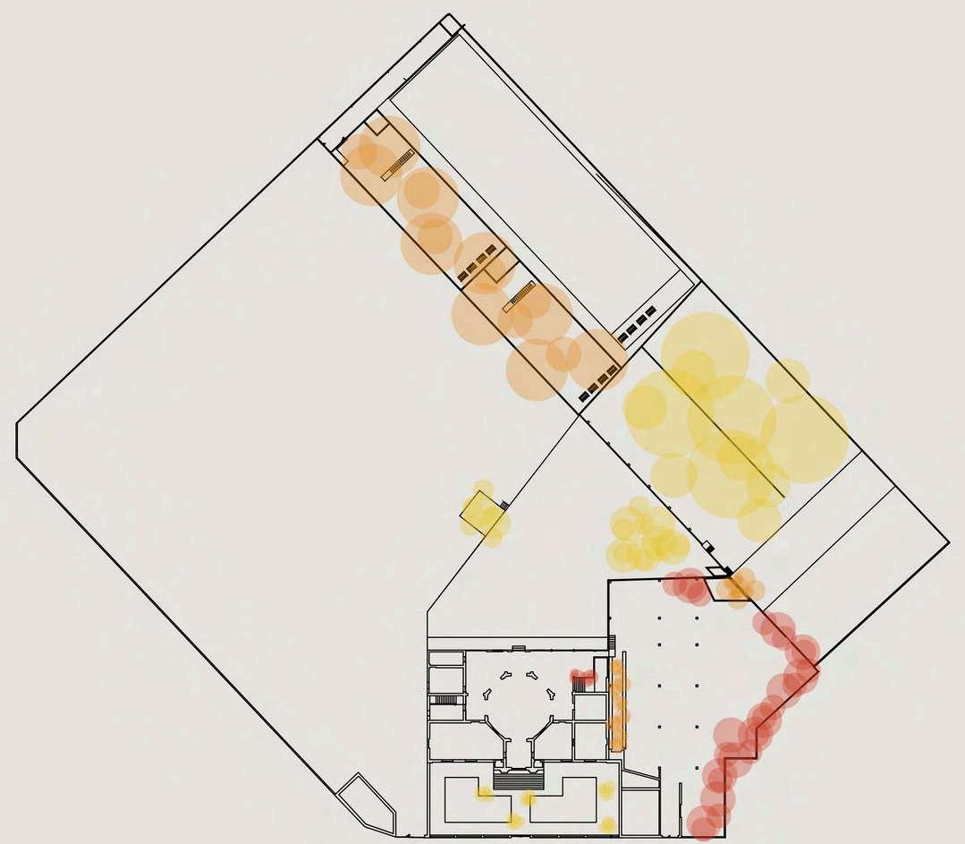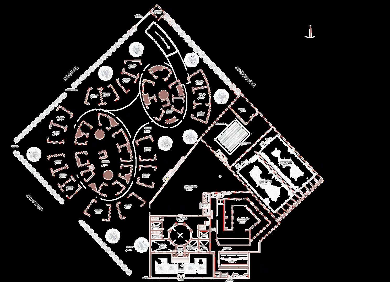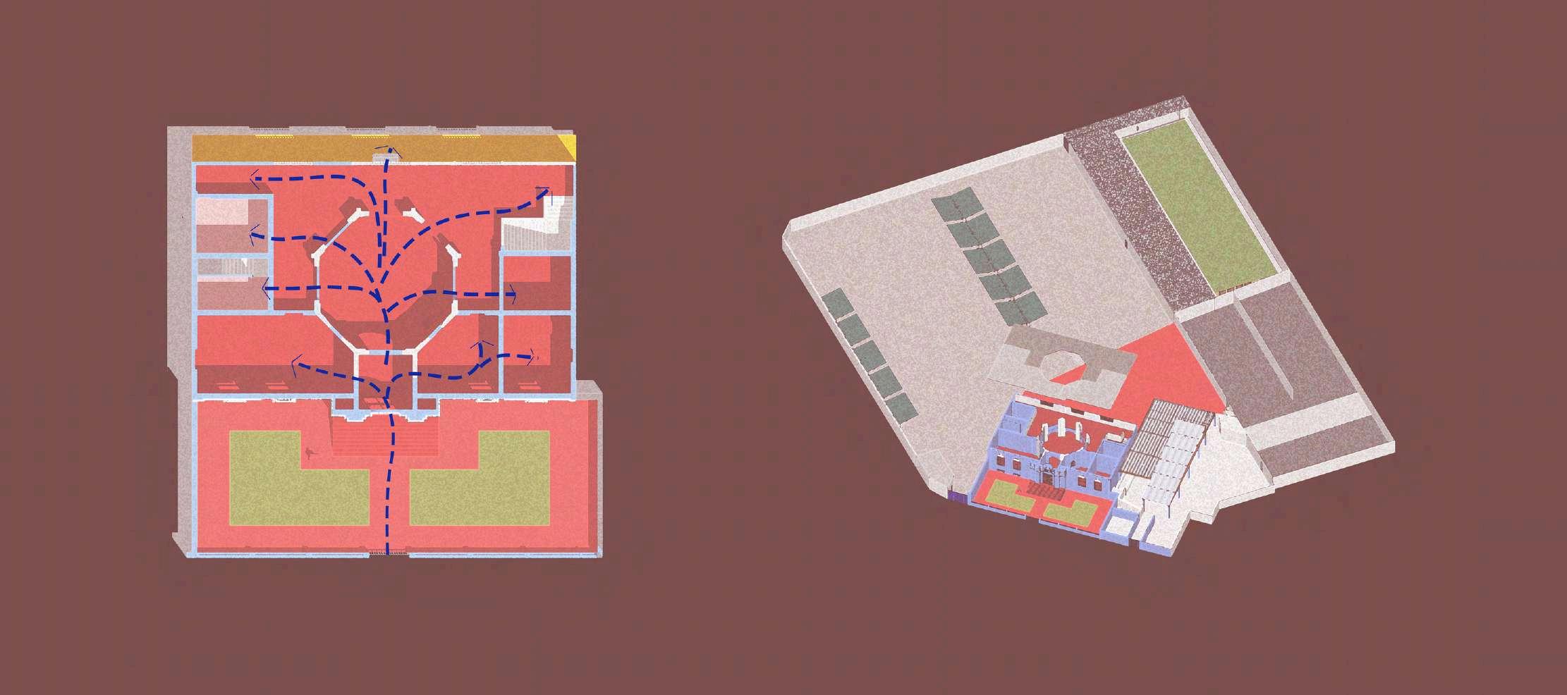 La ubicación del bloque dentro del área de estacionamiento permite generar espacios de transición claramente definidos entre el área construida y las zonas abiertas, funcionando como elementos de articulación entre el flujo vehicularylosrecorridospeatonales.La relaciónentrellenosyvacíosseplantea de manera equilibrada, permitiendo una adecuadapercepciónvisualdelconjunto yfacilitandolaorientacióndelusuario. Laintervenciónproponeunalecturaclara delespacio,dondeelnuevobloqueactúa como un elemento organizador del área de estacionamiento, de esta manera, el proyecto resignifica un espacio originalmente destinado únicamente al uso vehicular, incorporándolo al sistema espacial del recinto y fortaleciendo su integración funcional y visual dentro del conjuntoarquitectónico.