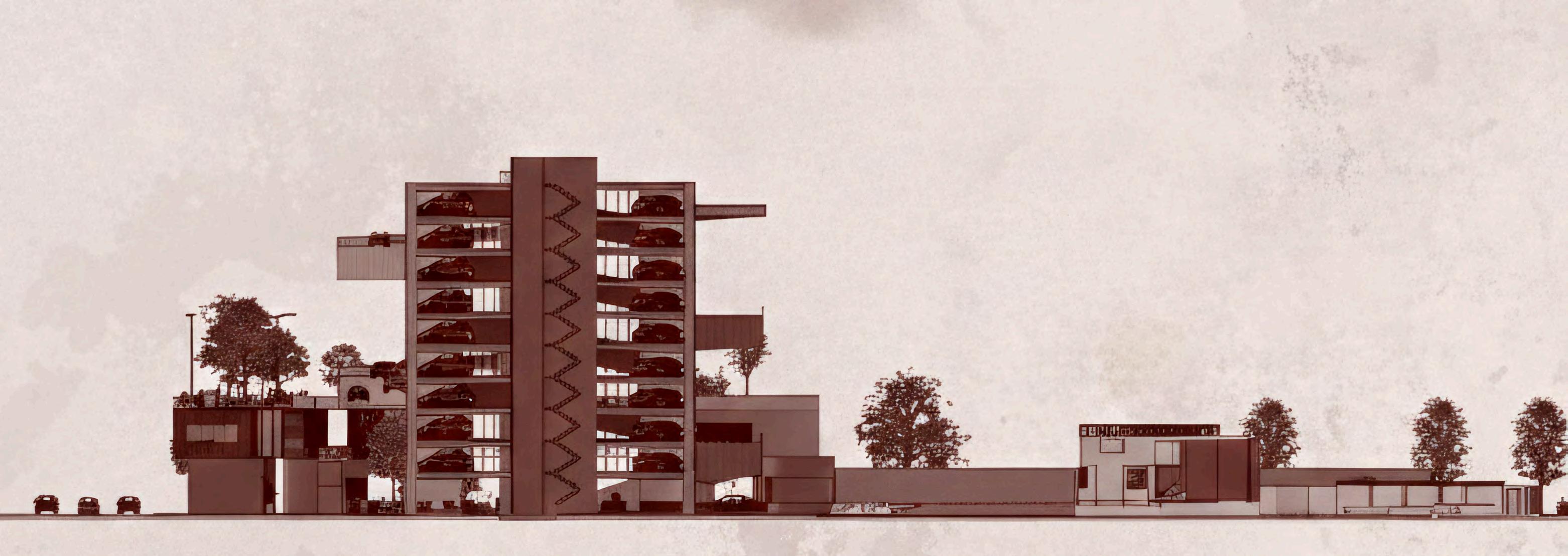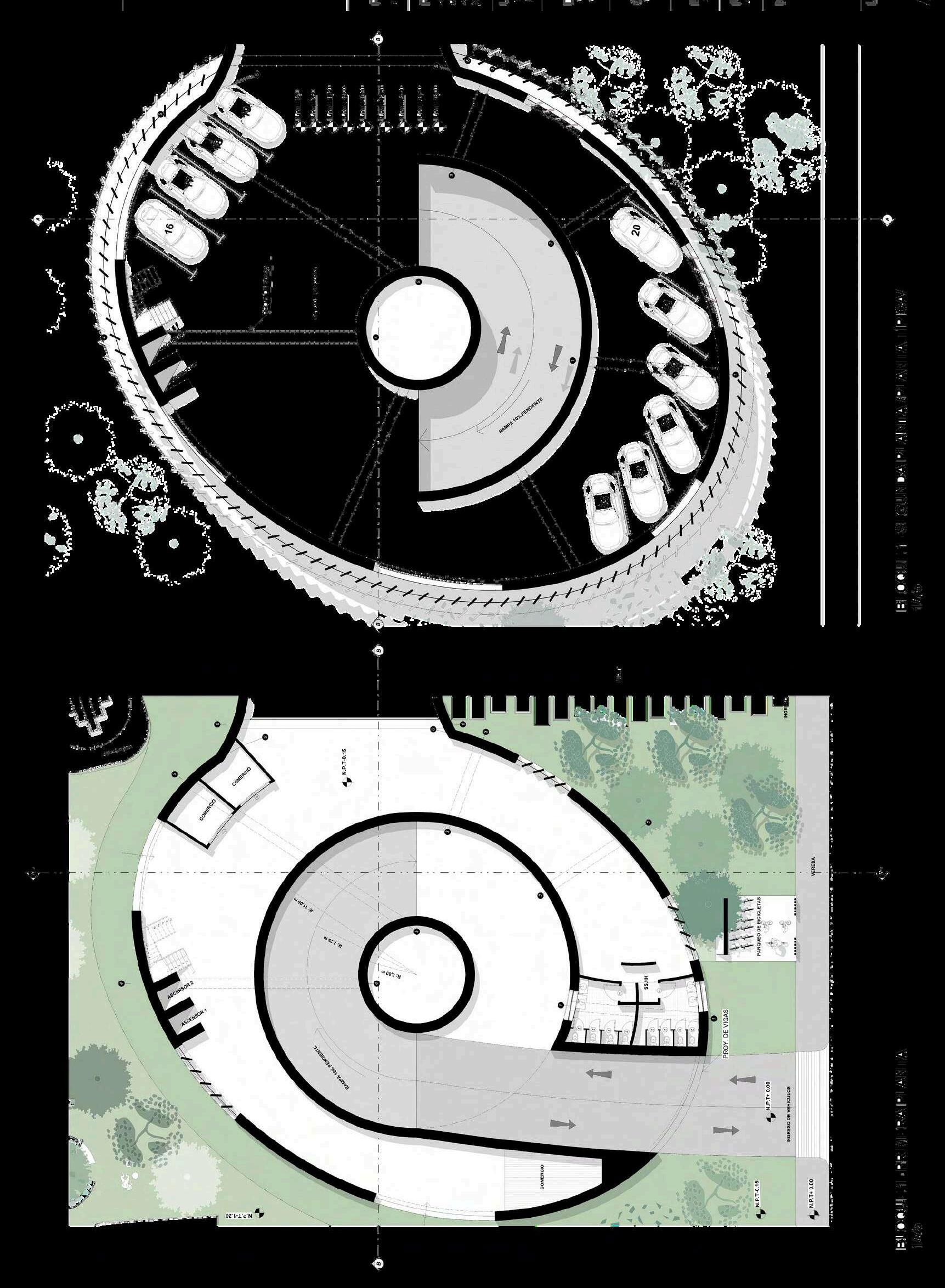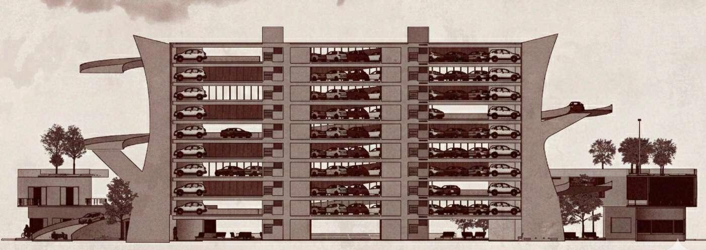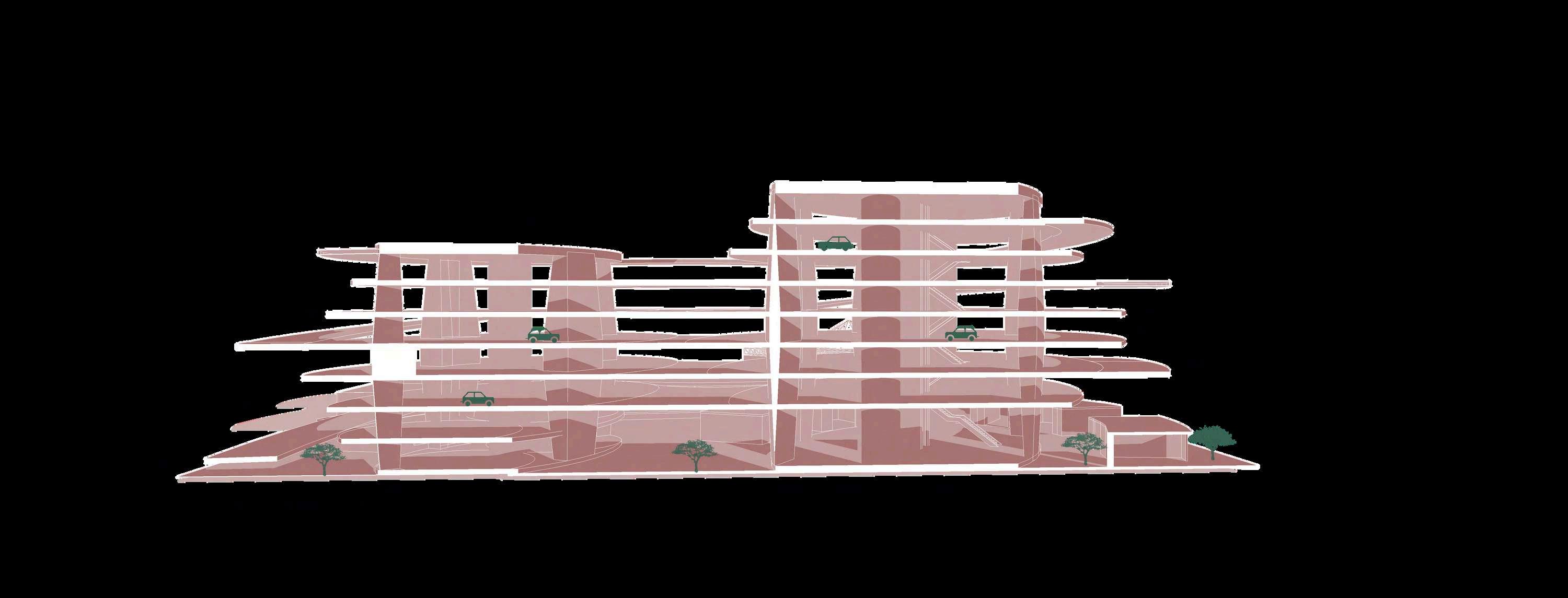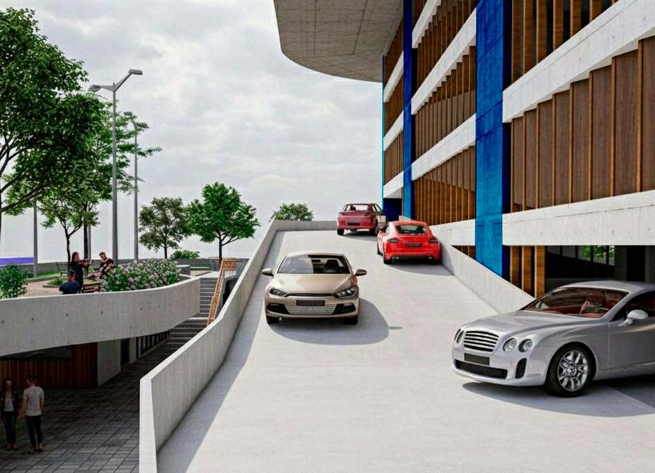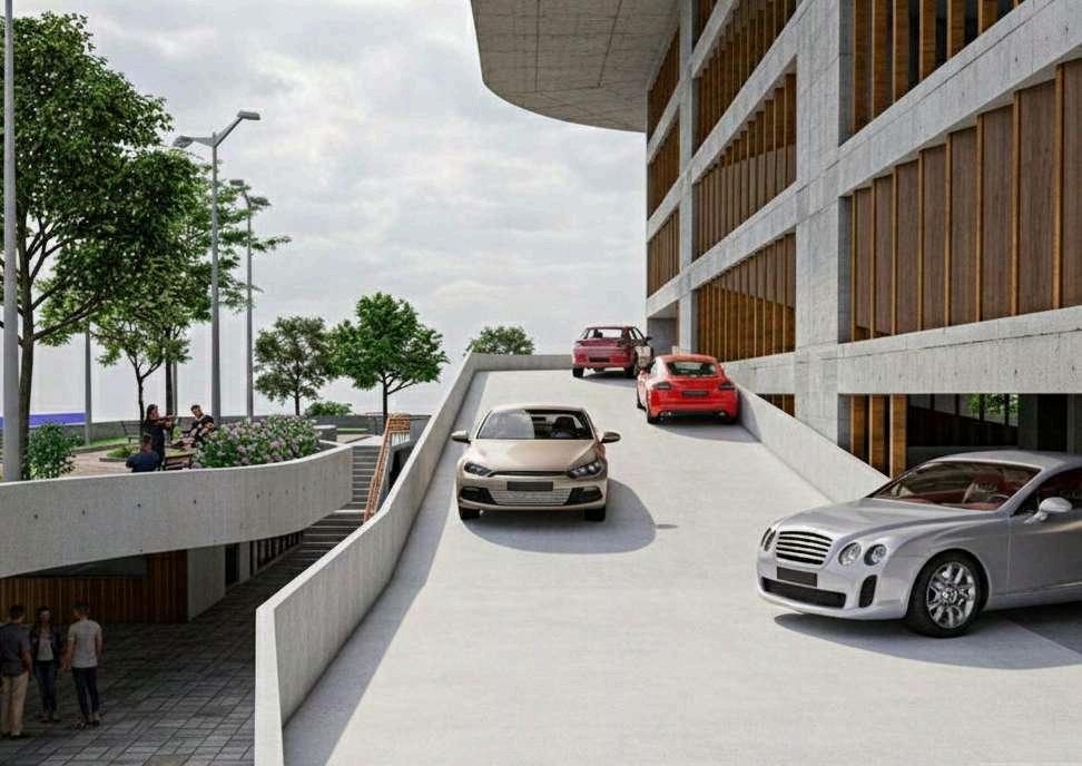 El edificio de estacionamiento se implanta sobre el parque como una volumetría claramente definida, diferenciándosedelnivelpúblicoinferior. Suzonificaciónpriorizalafuncionalidady la eficiencia en la circulación vehicular, organizando los accesos mediante una rampaqueconectalosdistintosnivelesy controla el ingreso desde el punto más alto del terreno. La zona de estacionamiento se concibe como un volumen compacto, liberando el suelo para el uso peatonal y las actividades recreativas.