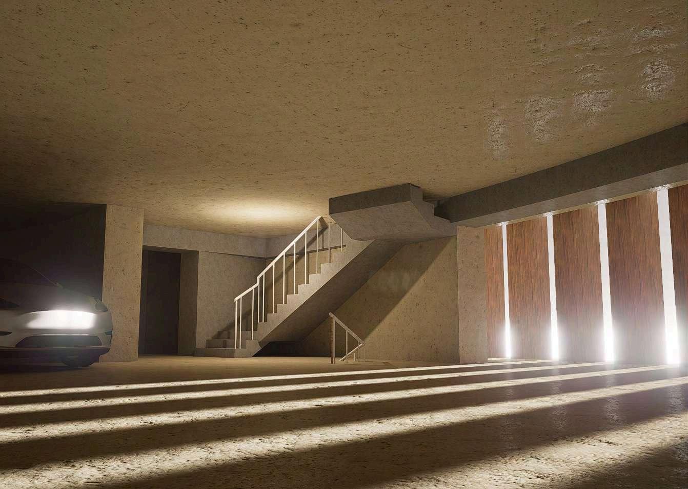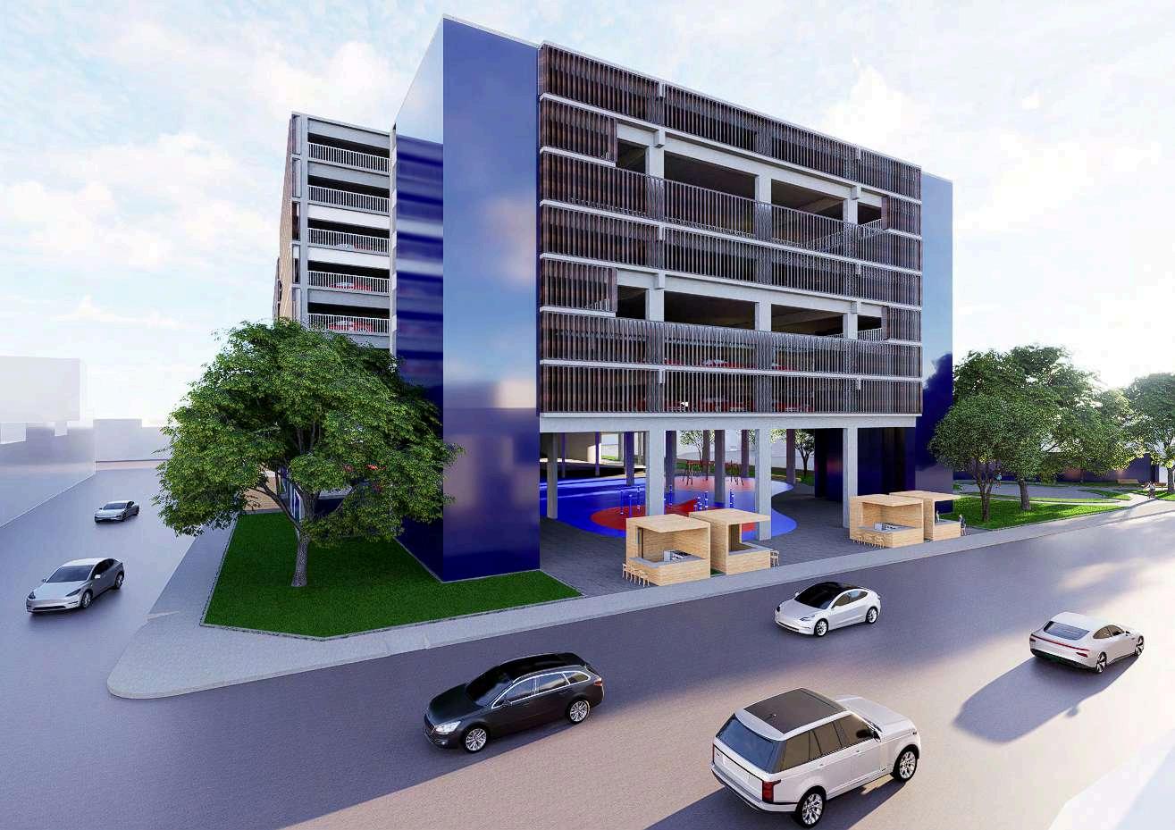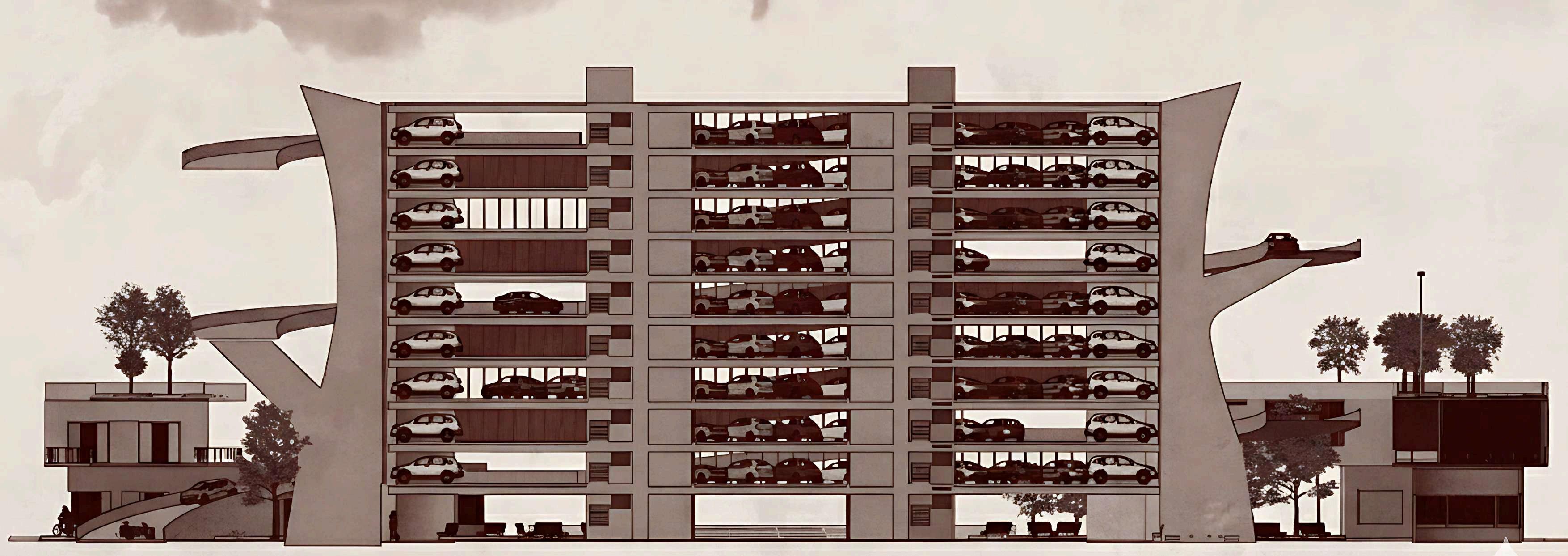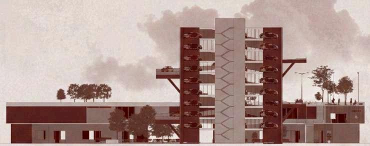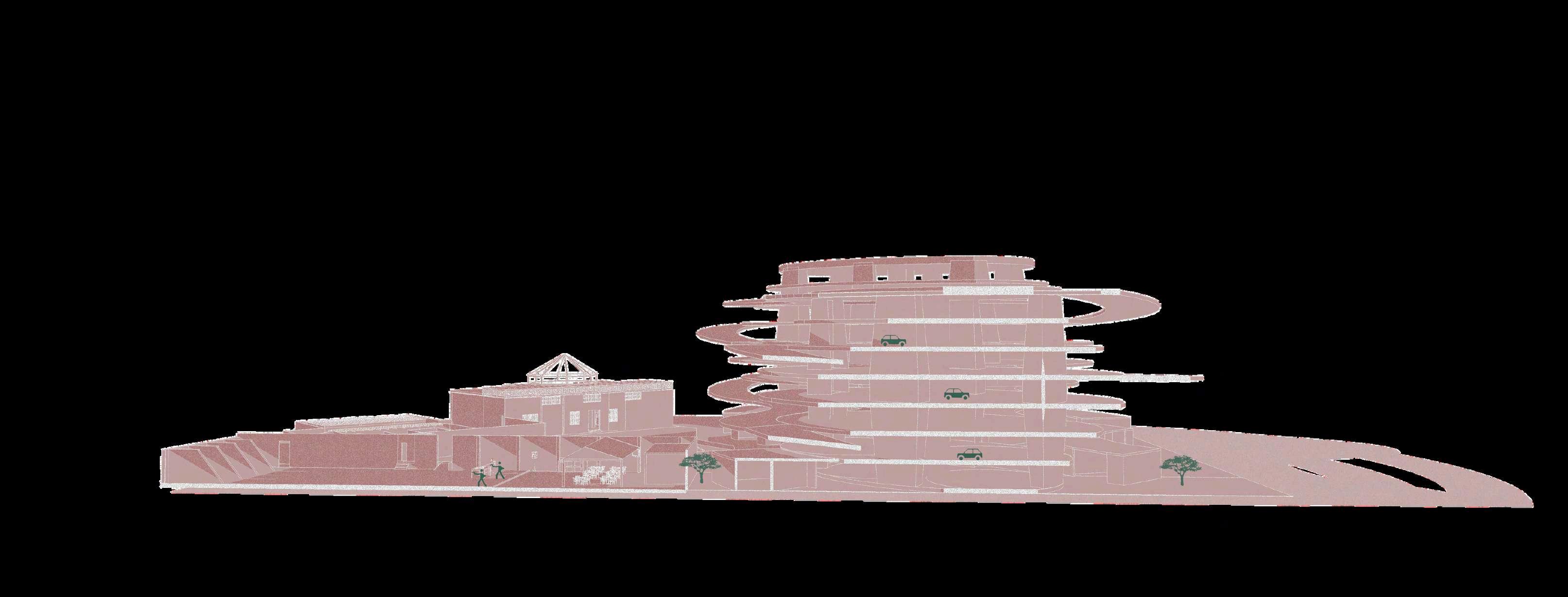 El edificio de estacionamiento se implanta sobre el parque como una volumetría claramente definida, diferenciándosedelnivelpúblicoinferior. Suzonificaciónpriorizalafuncionalidady la eficiencia en la circulación vehicular, organizando los accesos mediante una rampaqueconectalosdistintosnivelesy controla el ingreso desde el punto más alto del terreno. La zona de estacionamiento se concibe como un volumen compacto, liberando el suelo para el uso peatonal y las actividades recreativas.