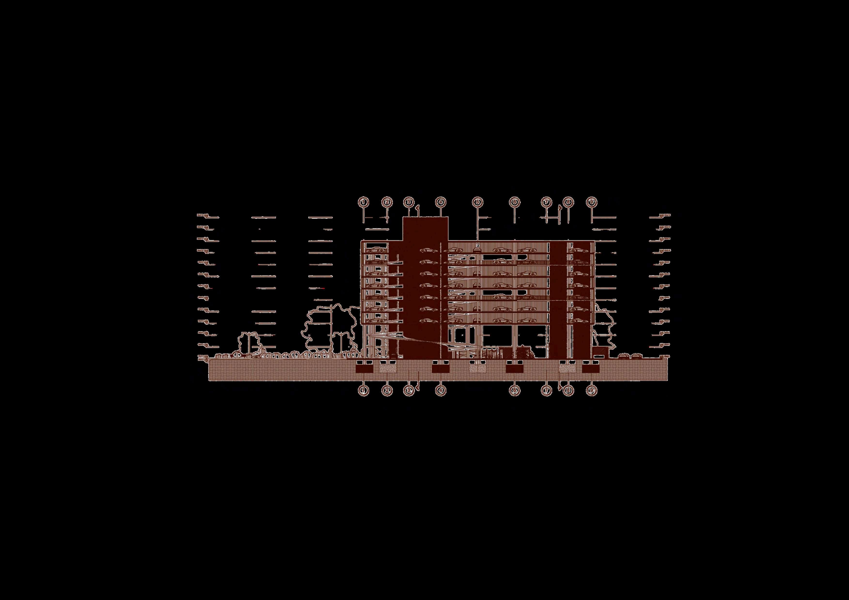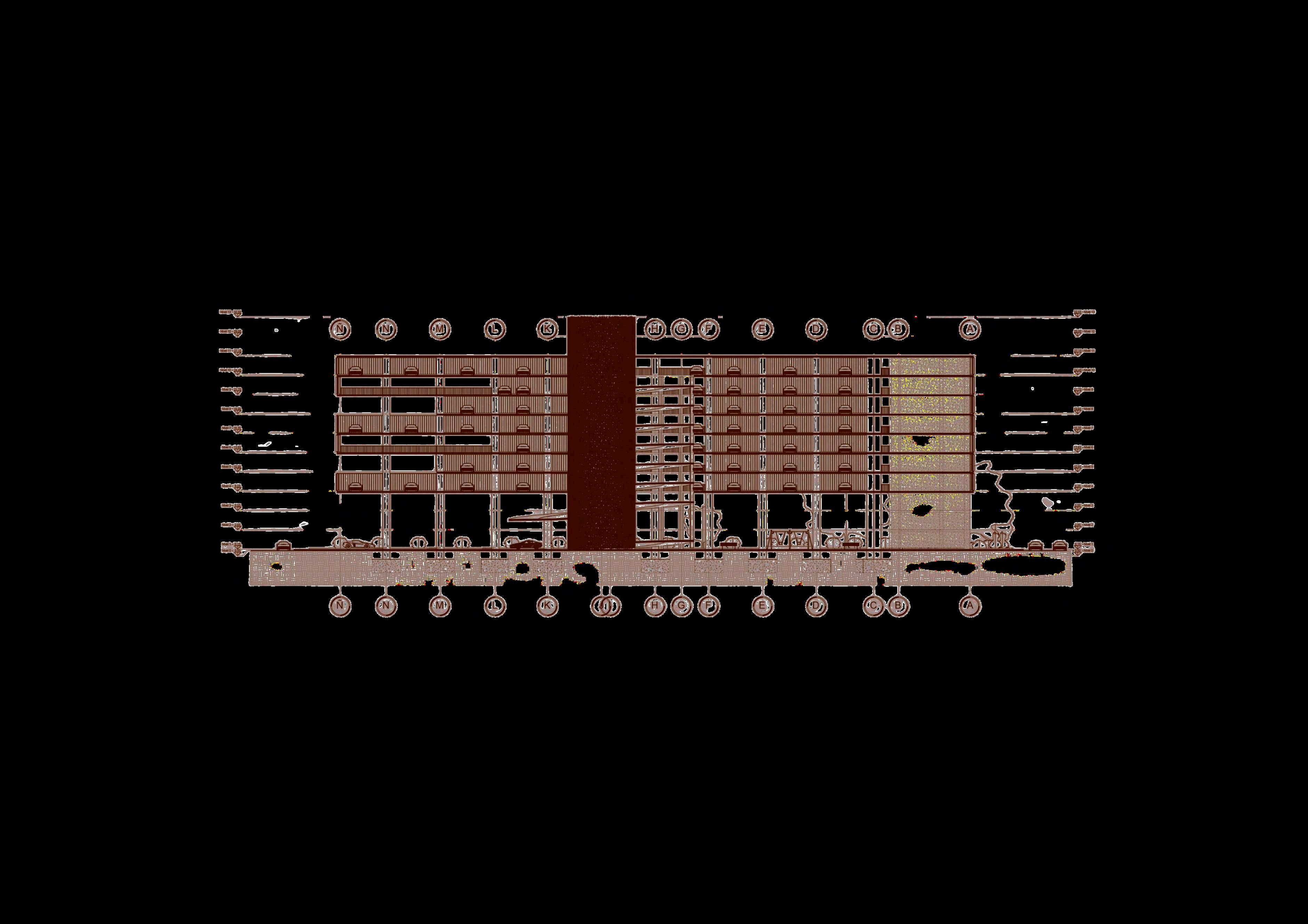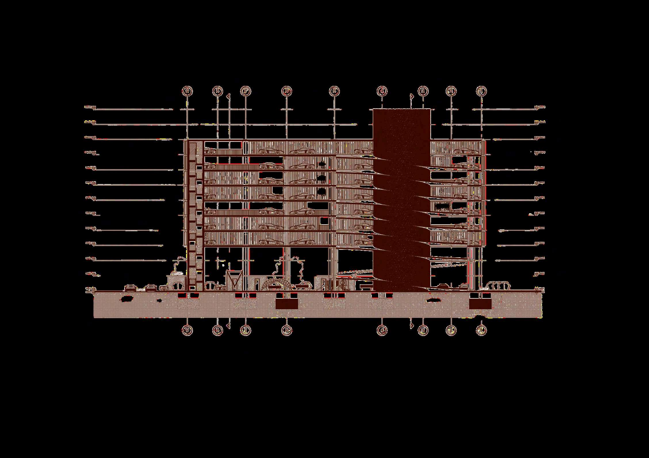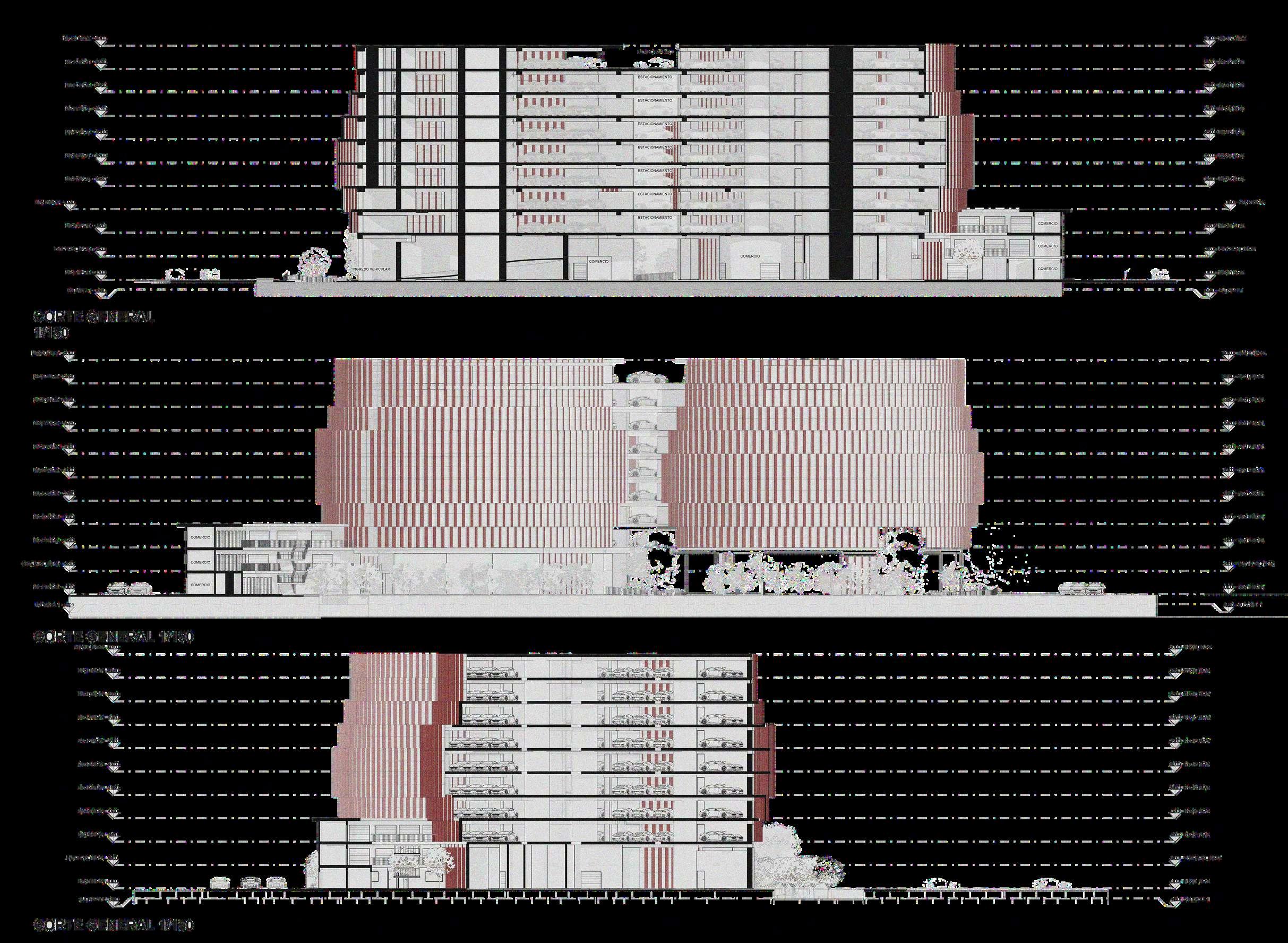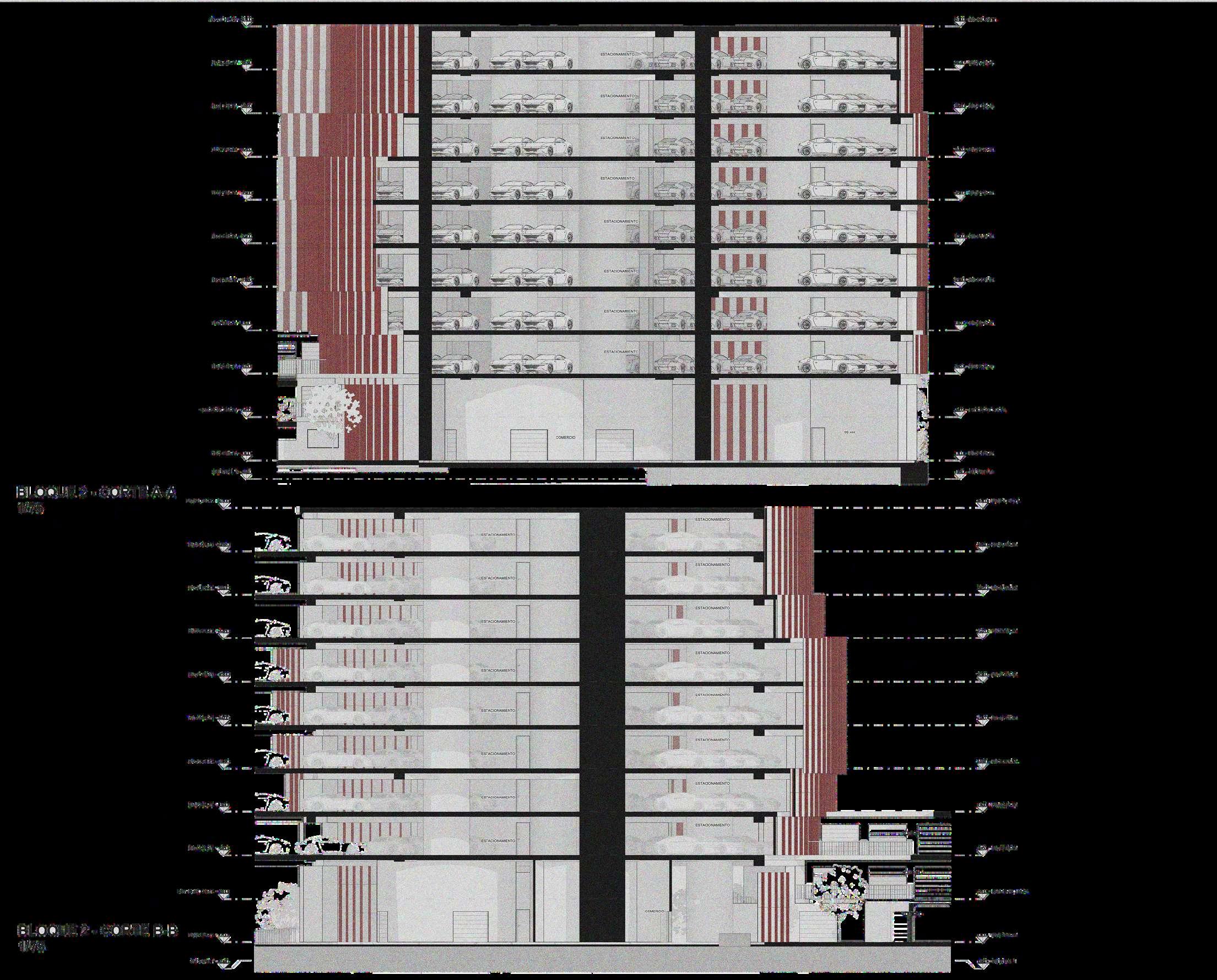 En los cortes también se aprecia la relación entre los niveles de estacionamiento y la altura libre destinadaalosvehículos.Lassecciones permitenverificarelcumplimientodelas dimensiones necesarias para la circulación,maniobrayestacionamiento, asícomolacontinuidadestructuralentre los pisos. La superposición de plantas repetidas evidencia una modulación constante,queordenatantolaestructura comoladistribucióndeloscajonesylas circulacionesvehiculares.