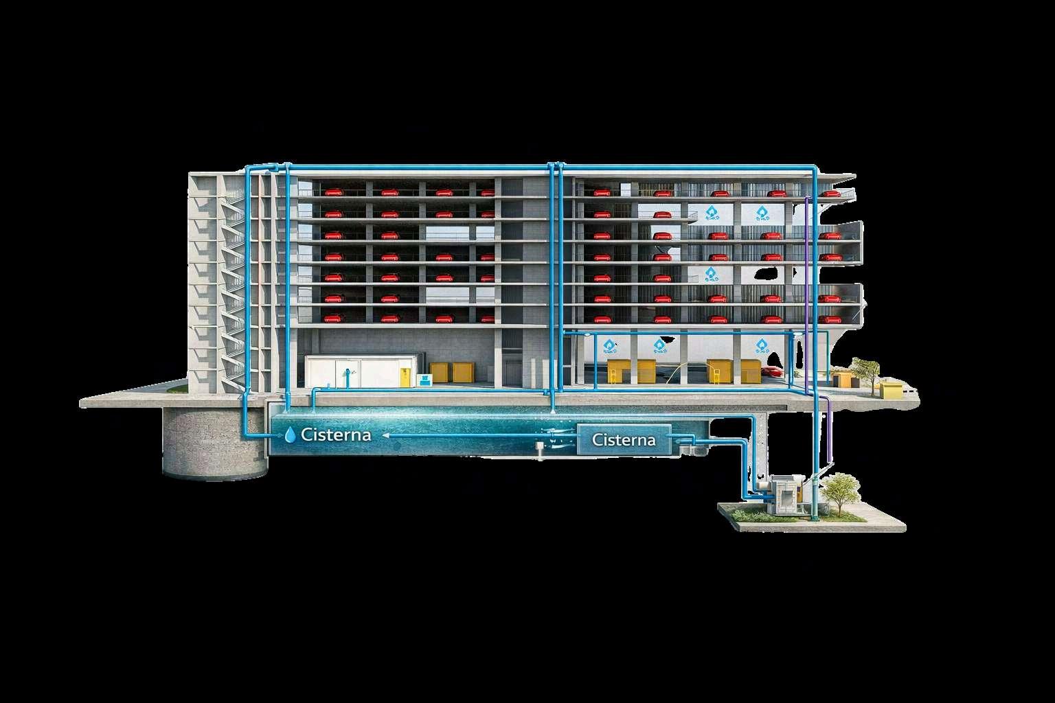 El Estacionamiento Central O’Donovan incorpora un sistema integral de gestión delagua,diseñadoparaoptimizarsuuso yfomentarlasostenibilidad,medianteel aprovechamiento de aguas pluviales y grises integradas en la estructura del edificio.