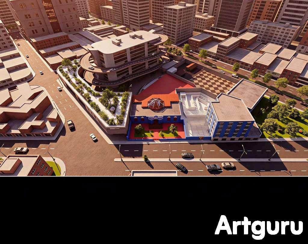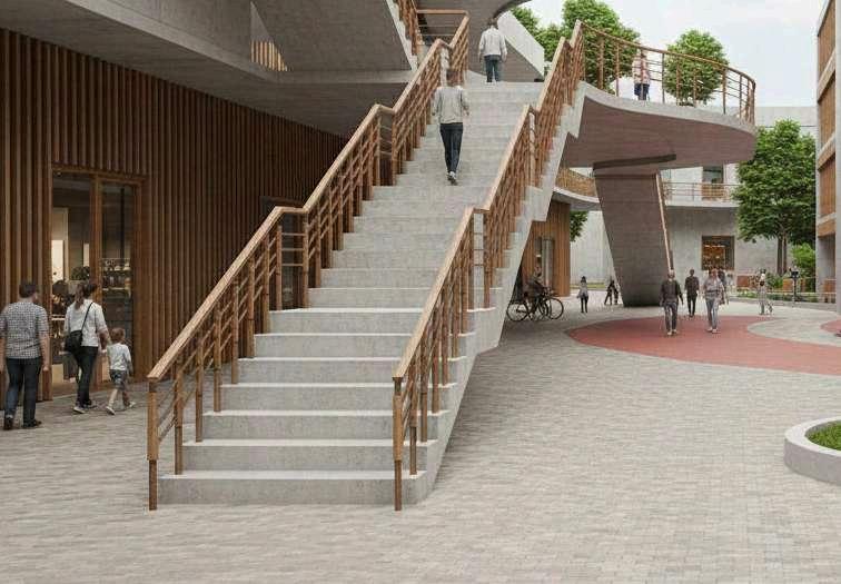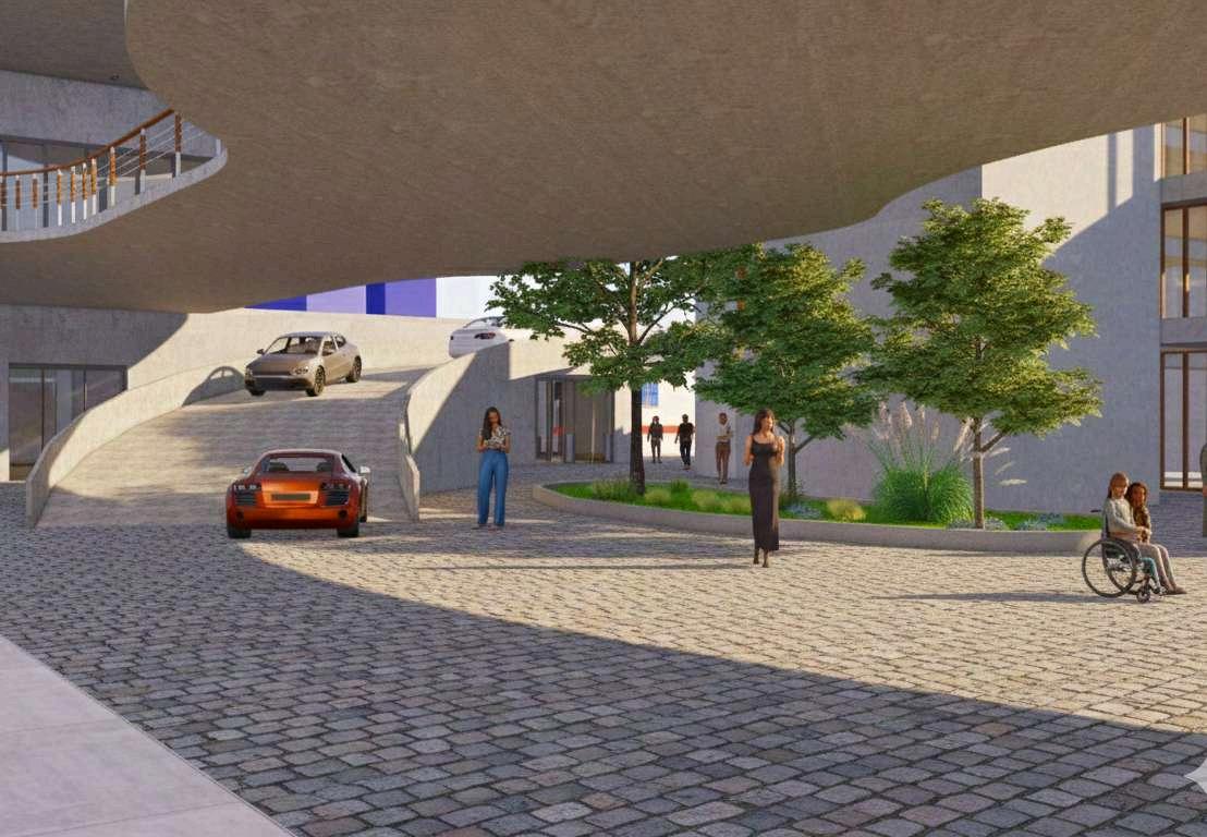 En el espacio del parque urbano, las imágenes muestran la organización de losrecorridospeatonalesylasáreasde permanencia. Los senderos de adoquinesestructuraneldesplazamiento delosusuariosyconectanlosdistintos puntos del proyecto, mientras que las áreas verdes se disponen como superficiescontinuasqueaportanconfort ambientalyunatransiciónnaturalentre las zonas construidas. Los bloques de comercio, desarrollados en madera de roble, se integran en los bordes del parque, definiendo límites claros sin interrumpir la continuidad visual del espaciopúblico.Seaprecialapresencia de los circuitos de entretenimiento, identificadosporsuperficiesyelementos en colores rojo y azul, que introducen dinamismoypuntosdeactividaddentro del parque. Estas áreas se relacionan directamente con los recorridos y espaciosabiertos,reforzandoelcarácter recreativodelconjunto.Enconjunto,las imágenes representan una implantación que articula arquitectura, paisaje y uso público, mostrando la interacción entre losdistintoscomponentesdelproyectoy su adaptación al contexto urbano existente.