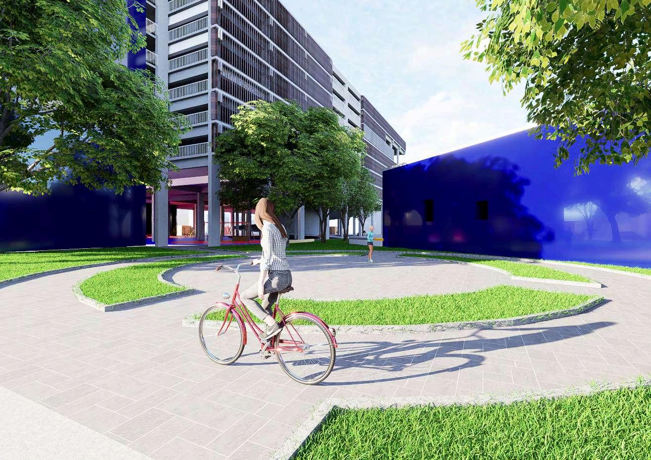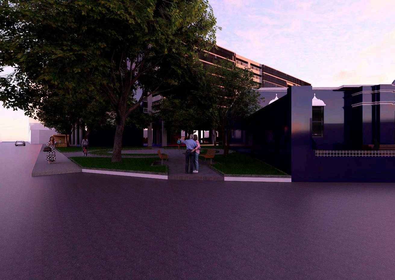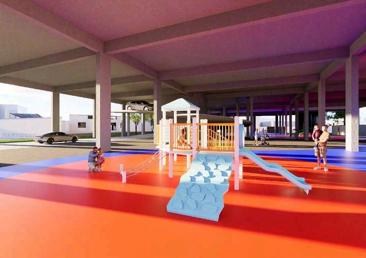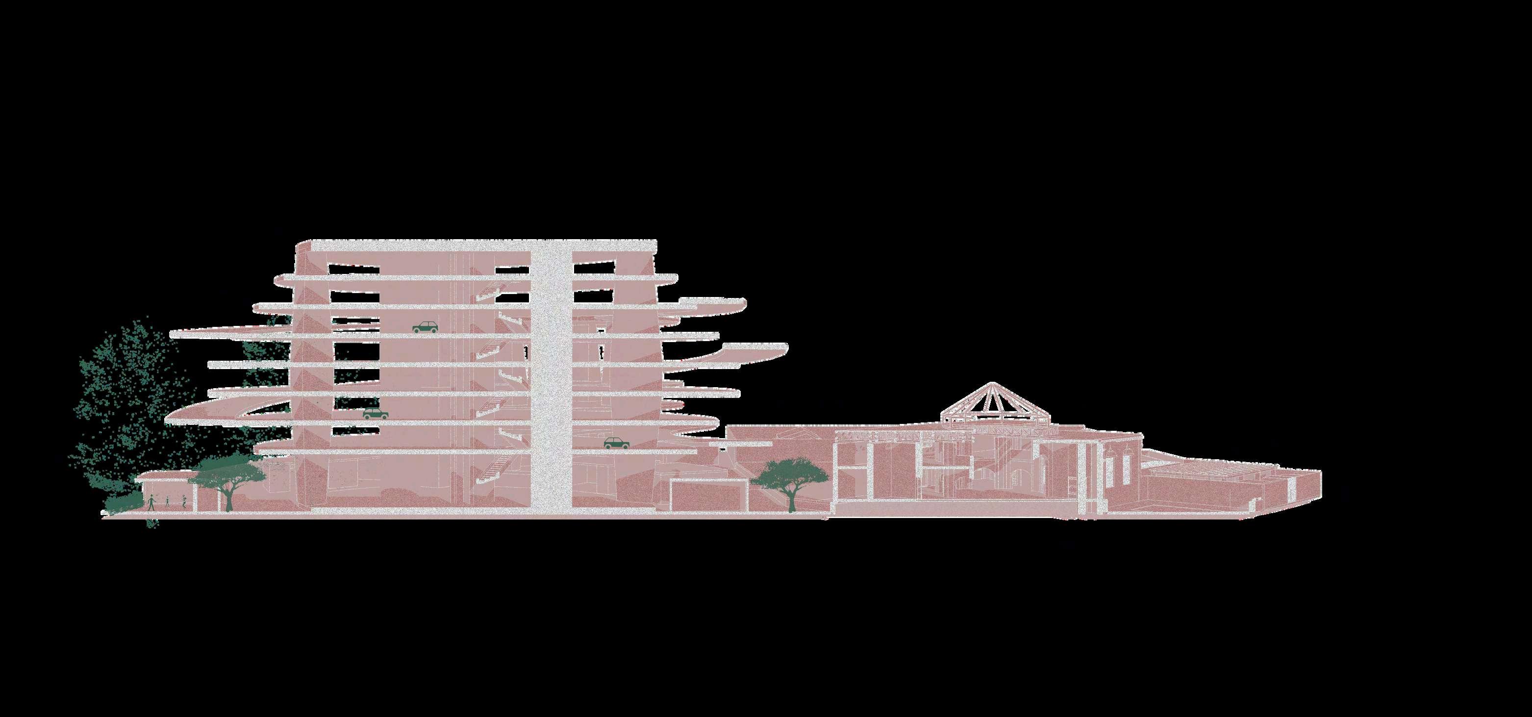En el primer nivel del Estacionamiento CentralO’Donovanseplanteaunparque urbano,concebidocomoespaciopúblico de encuentro, permanencia y transición.