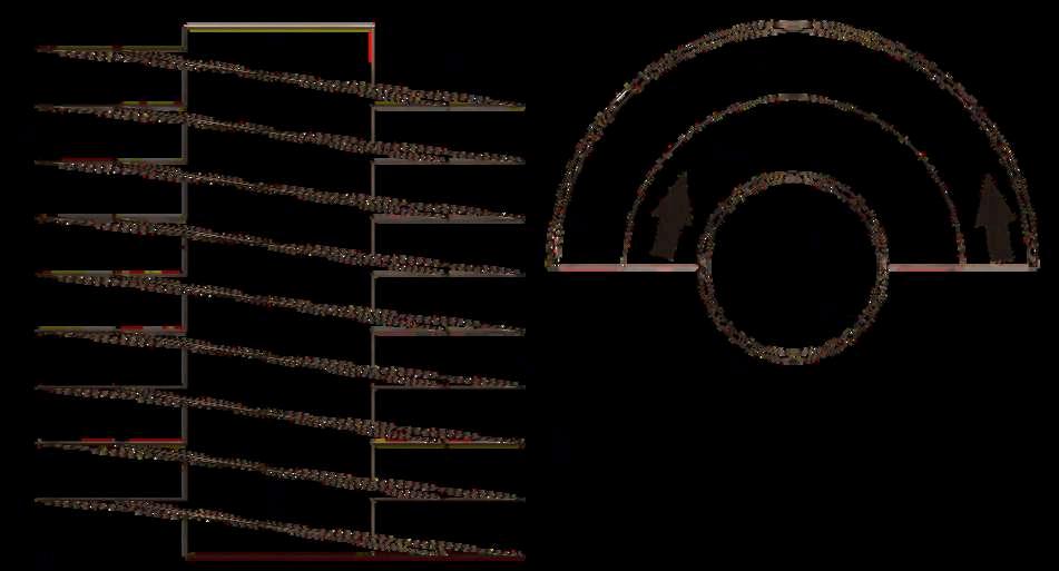 Las secciones del edificio permiten comprender la organización espacial, funcional y estructural del proyecto. A través de estos se evidencia la relación vertical entre los distintos niveles, así comoladisposicióngeneraldelossiete pisos que conforman el edificio. La lecturaensecciónmuestralacontinuidad de la rampa vehicular como elemento articulador, conectando de manera constante los diferentes niveles y ordenando la circulación interna. Asimismo, se identifican claramente las escalerasdeevacuación,dispuestaspara garantizar recorridos directos y accesibles desde cualquier punto del estacionamiento.