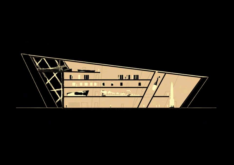 Destacan las formas triangulares metálicas revestidas en vidrio, que permitenespacioselevadosyabiertossin apoyos intermedios. Esta solución optimizaeláreaútilysimbolizalaruptura conlanarrativaautoritariadelpasado,en líneaconelenfoquecríticodelmuseo.
