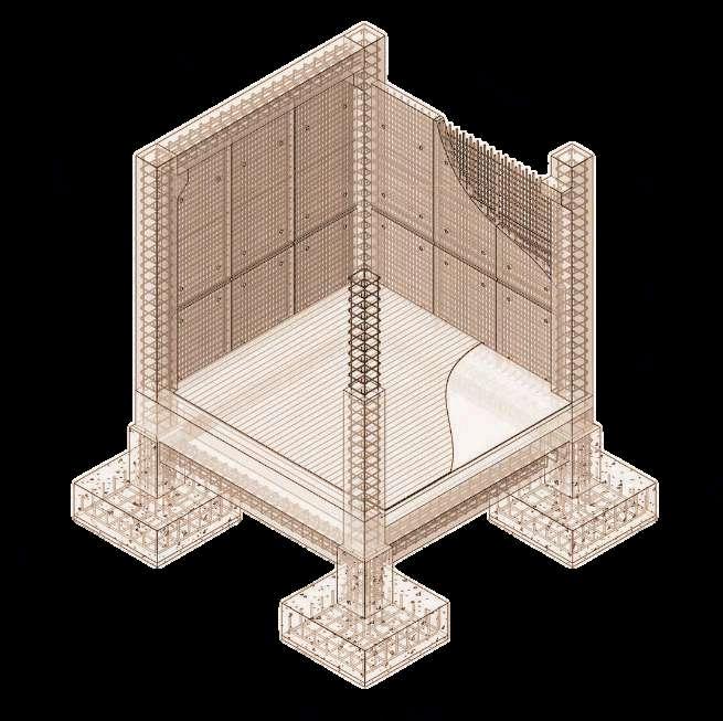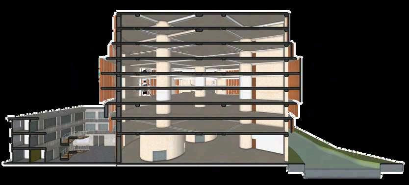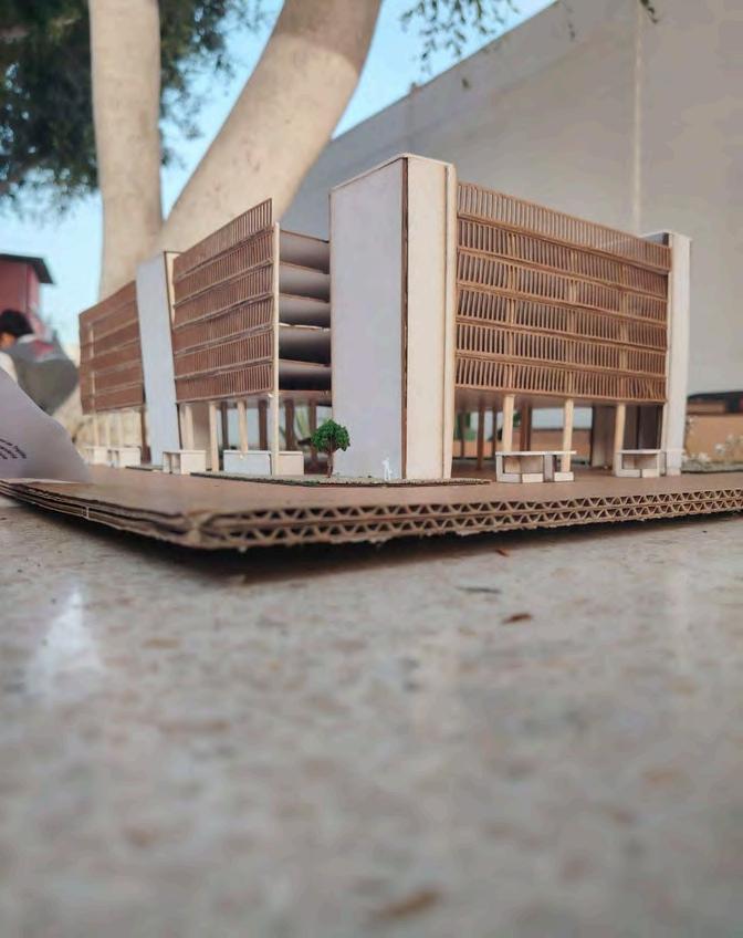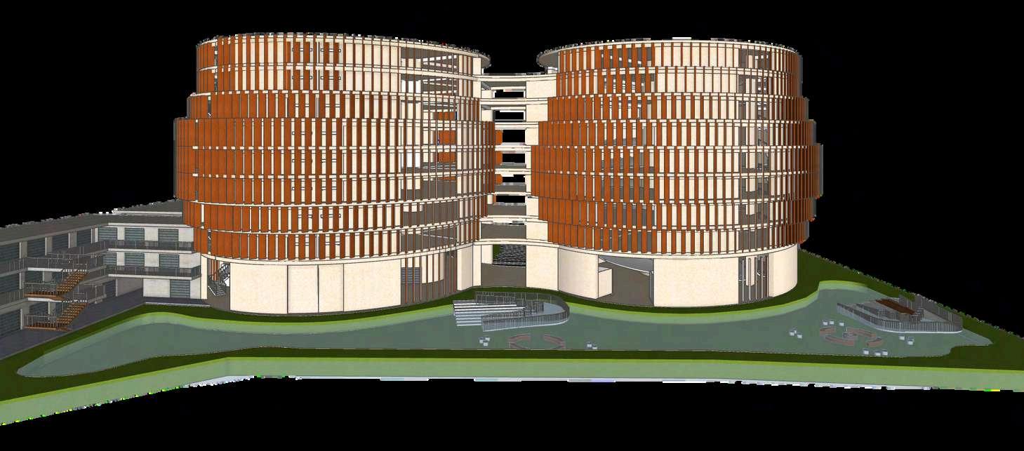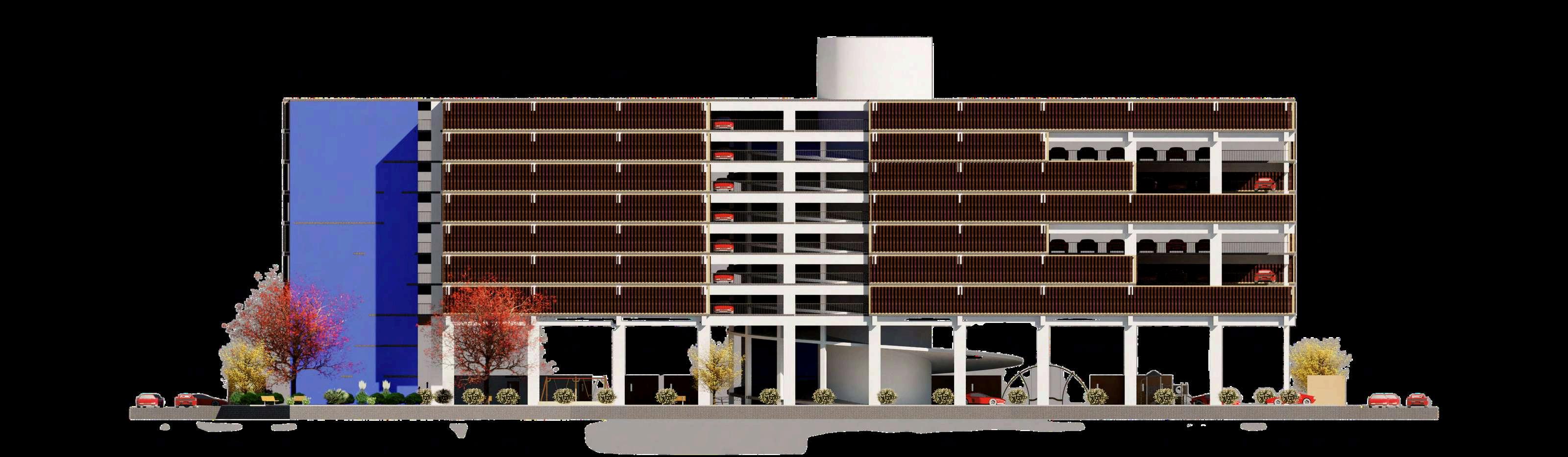 Lamaterialidaddelproyectosedefinea partir de una combinación equilibrada entreelementosestructuralesrobustosy materialesqueaportancalidez,identidad y relación con el espacio público. El edificio principal de estacionamiento se resuelve íntegramente en concreto, material elegido por su resistencia, durabilidadycapacidadpararespondera las exigencias estructurales del uso vehicular. El concreto se expresa de manera sobria y funcional, permitiendo unalecturaclaradelsistemaestructuraly reforzando el carácter utilitario del edificio, sin recurrir a revestimientos innecesarios. Como contrapunto a la solidezdelconcreto,eledificioincorpora celosías de madera de roble en sus fachadas. Este elemento cumple una doble función: por un lado, regula el ingresodeluzyventilaciónnaturalhacia el interior del estacionamiento; por otro, aporta una textura más cálida y permeable al conjunto. La madera de roble, por su resistencia y tonalidad natural,estableceundiálogovisualconel parqueurbanoyreducelapercepciónde un volumen cerrado, generando una transiciónmásamable.