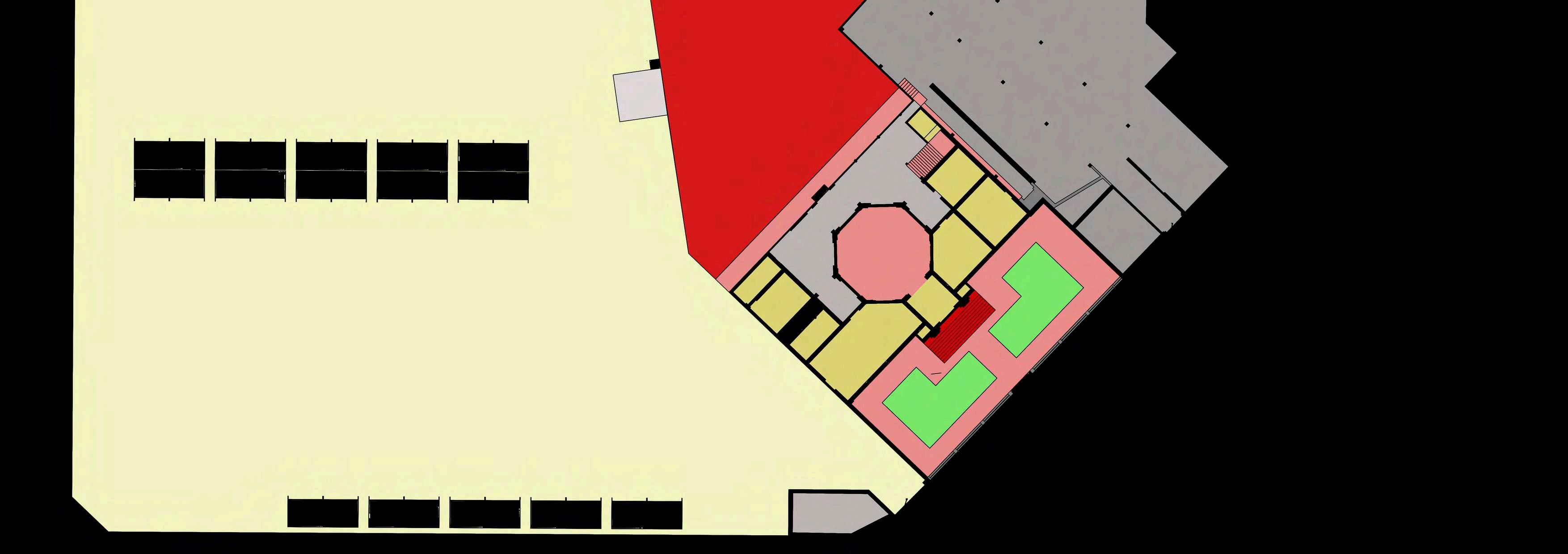 En cuanto a pisos, la armería se distribuyeentresnivelesprincipalesmás un sótano de servicios, conectados por amplias escaleras de piedra. La nueva intervenciónagregaunrecorridodiagonal ascendente mediante rampas metálicas, independiente de la retícula de los nivelesoriginales.