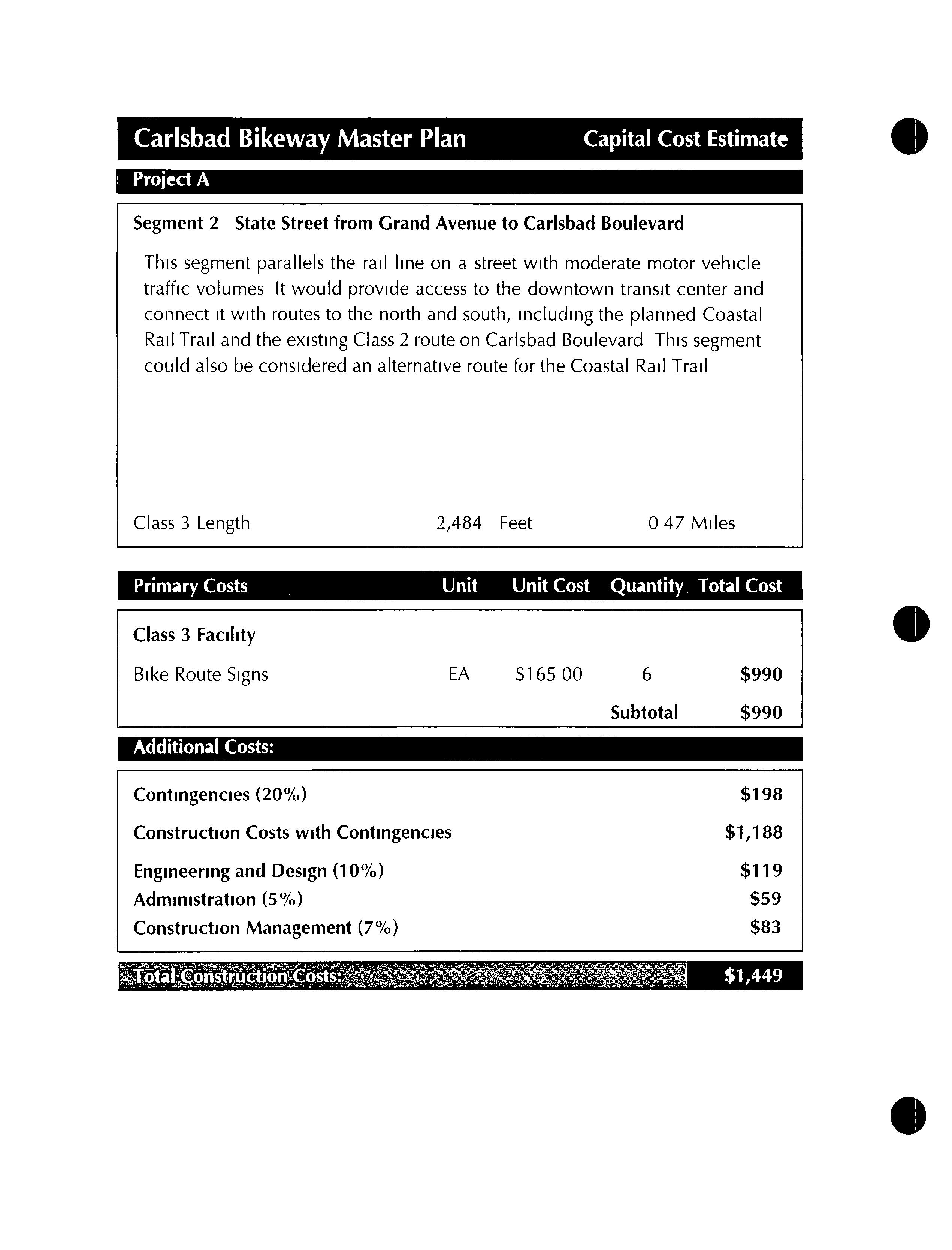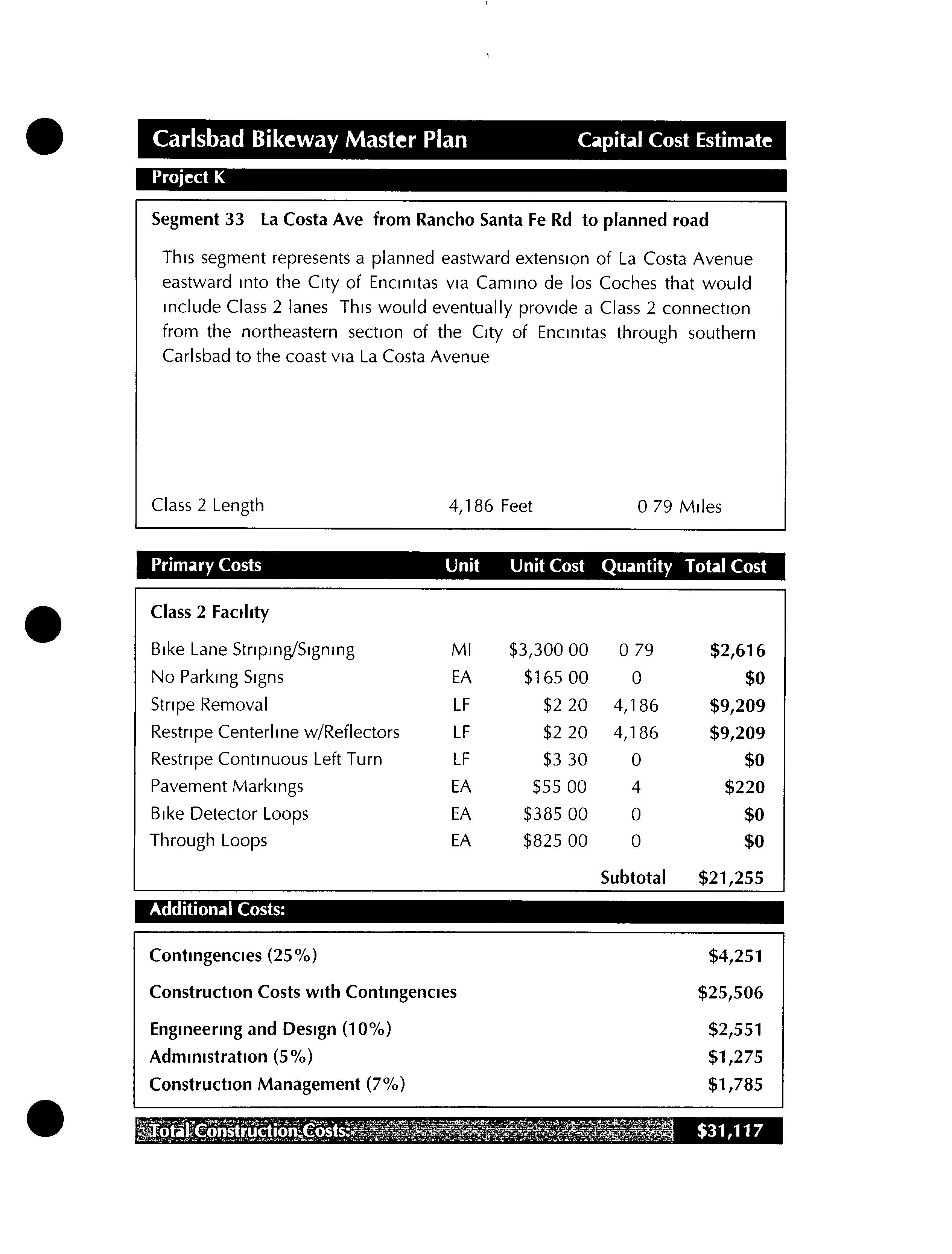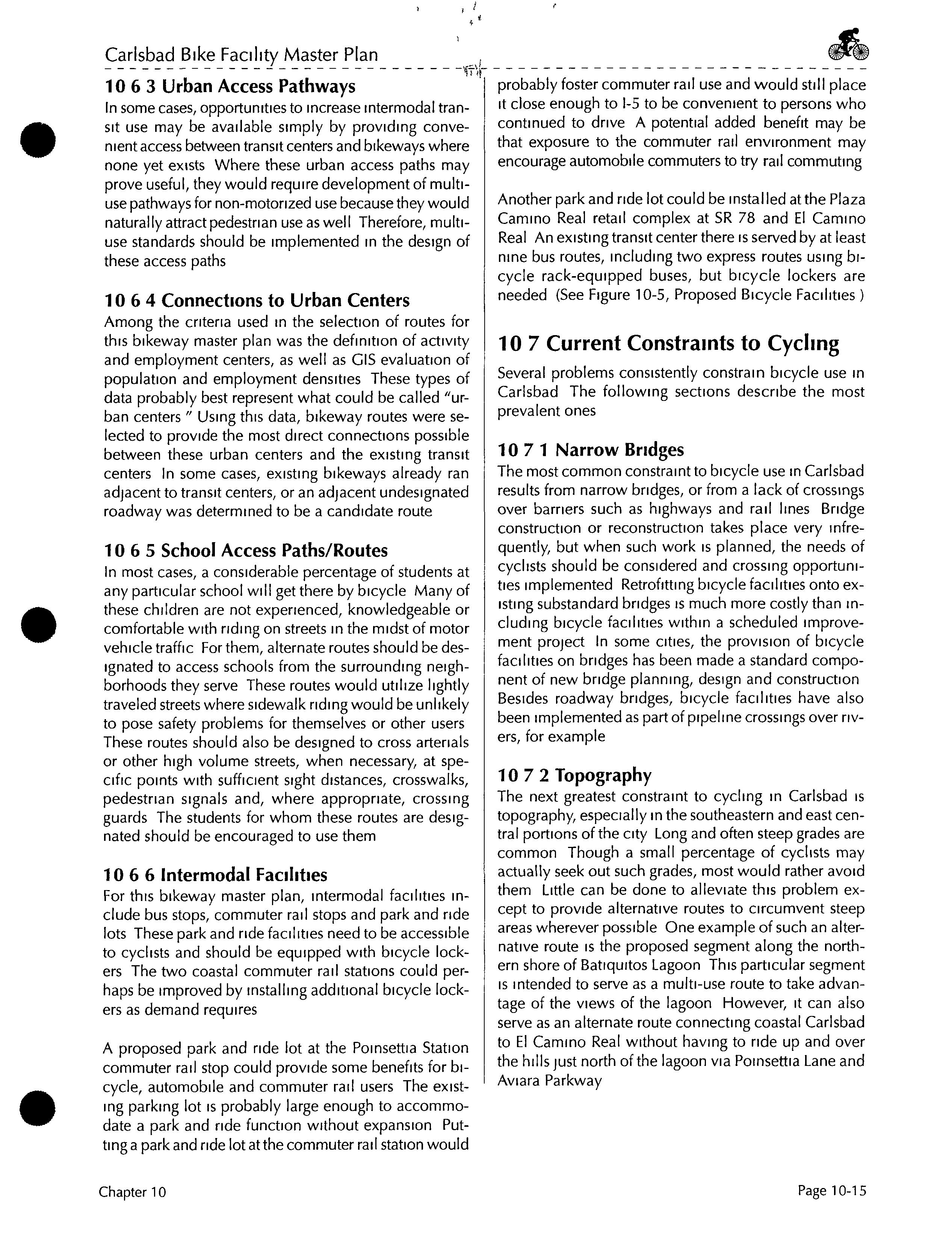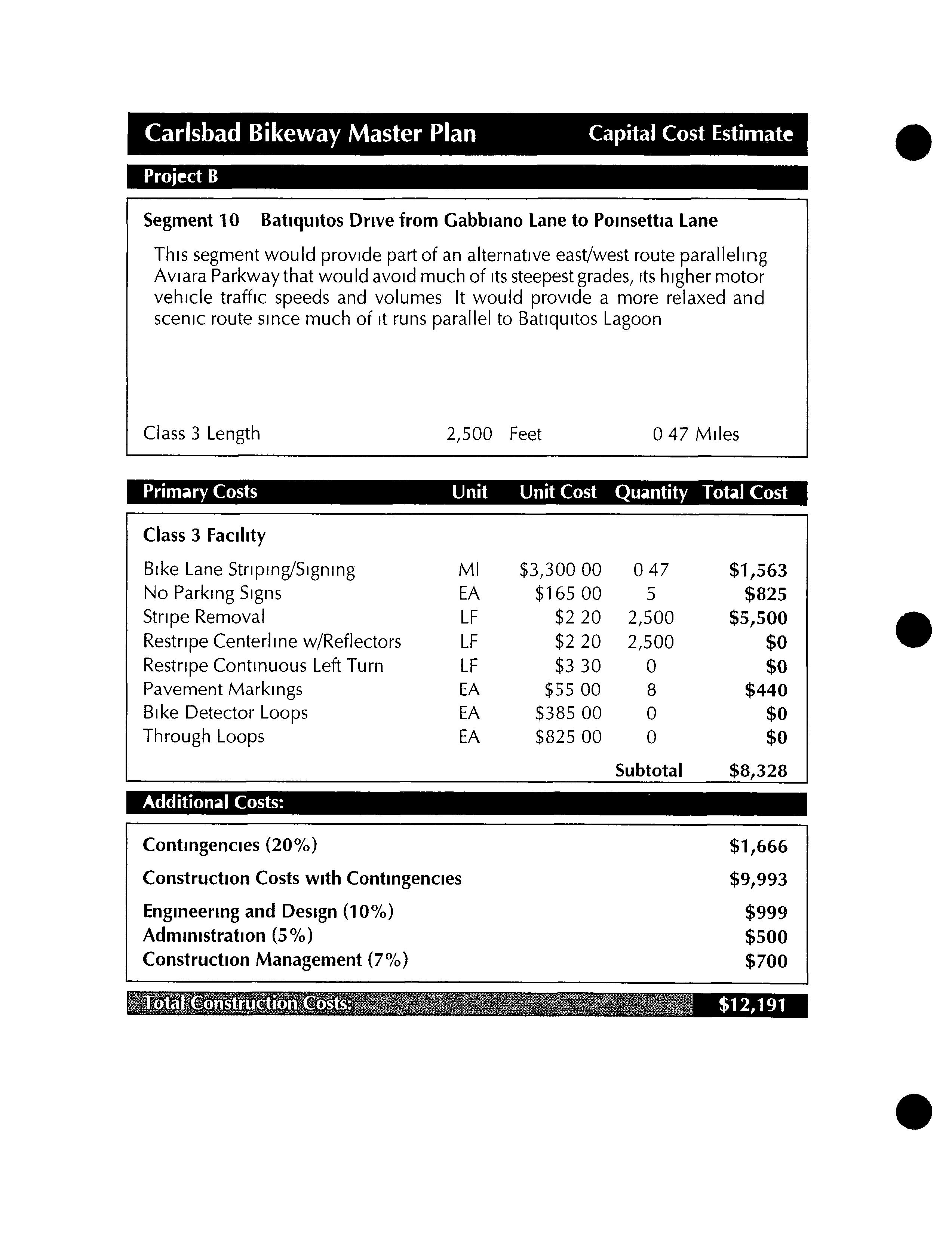 Much of this particular segment already exists as a well established dirt road To take advantage of this road andthe more natural experience it affords, these two segments would differ from all other proposed segments in this bikeway master plan by remaining unpaved Since this segment would be primarily for recreational use, commuting cyclists who preferred to ride on paved streets could use theclosely parallel Batiquitos Drive