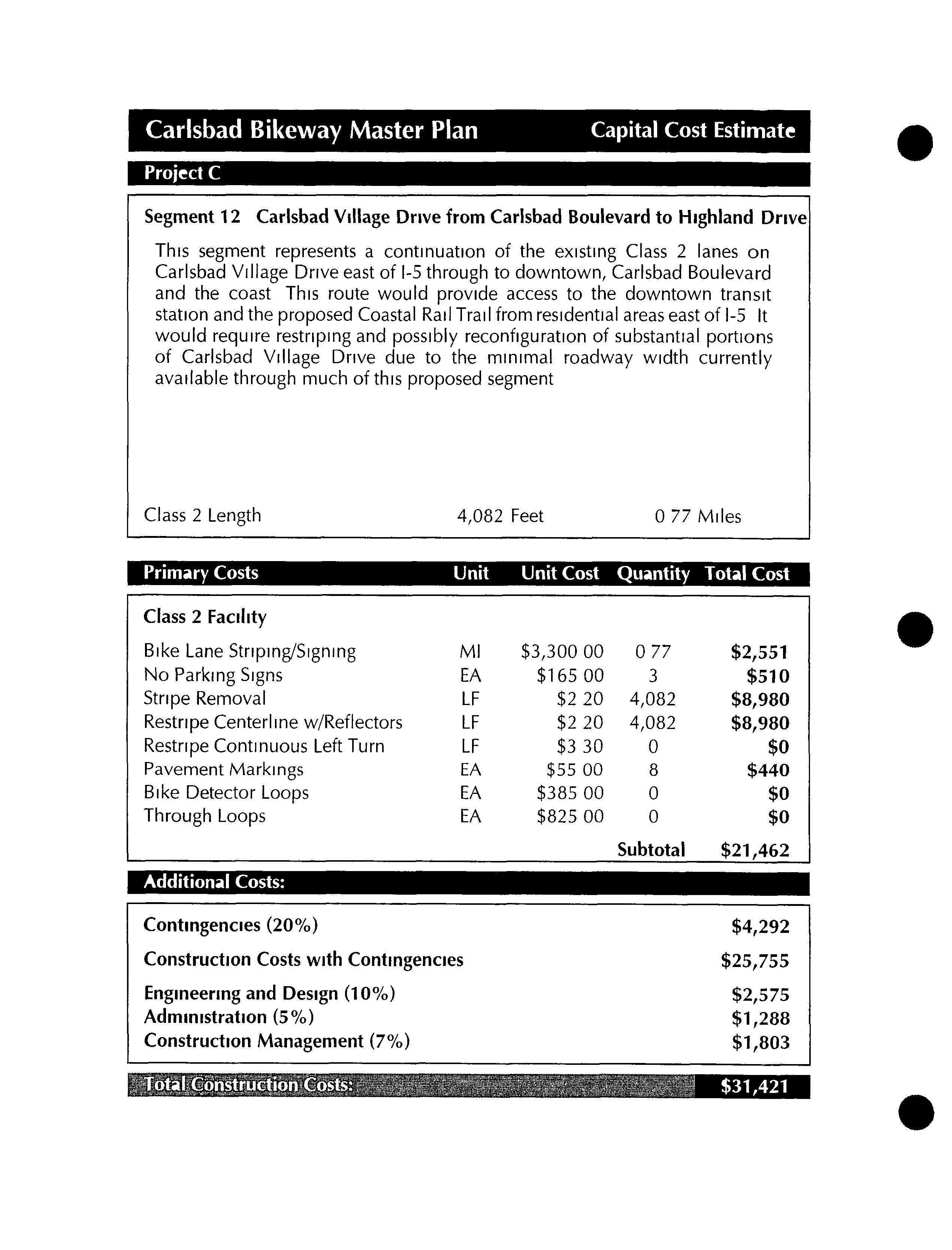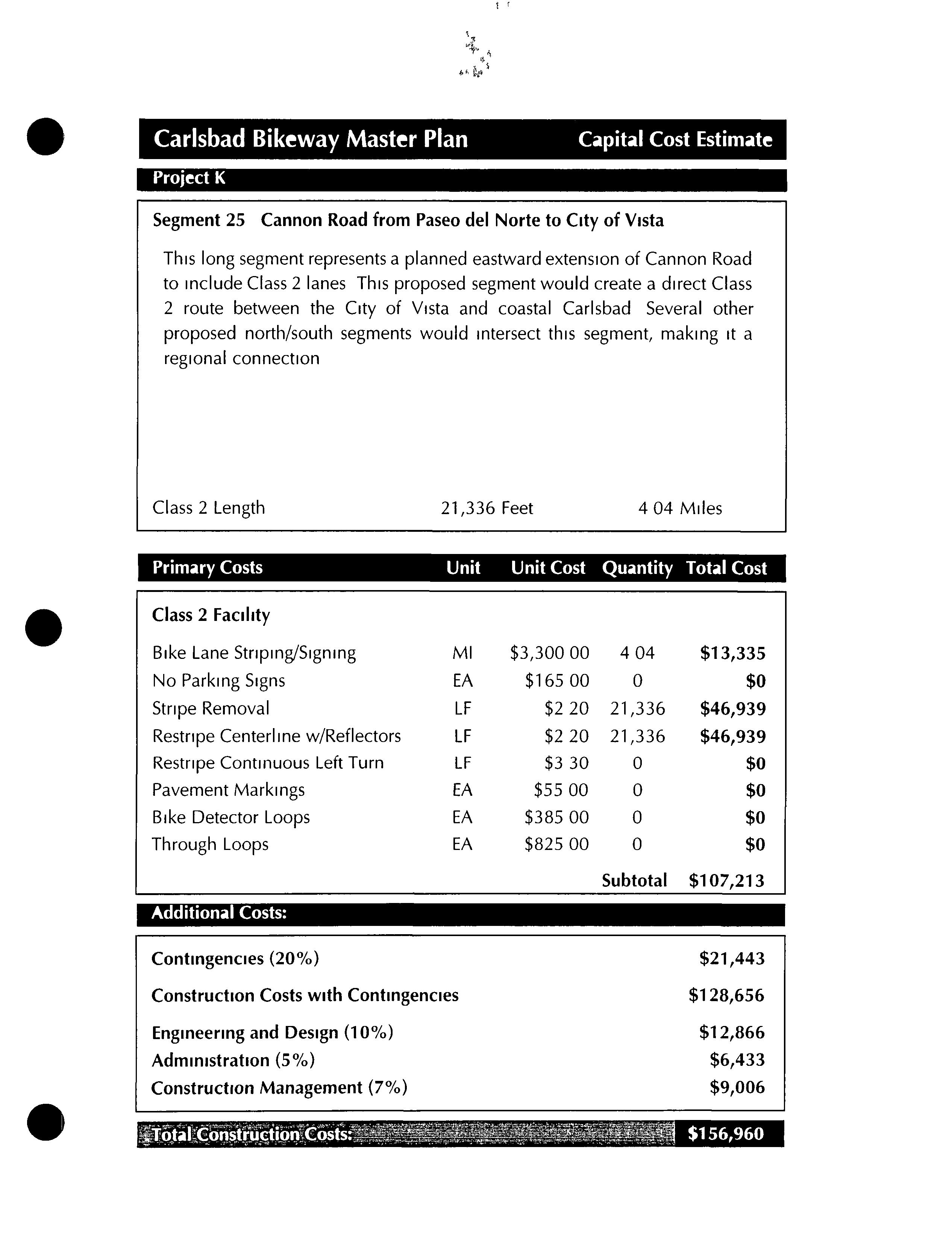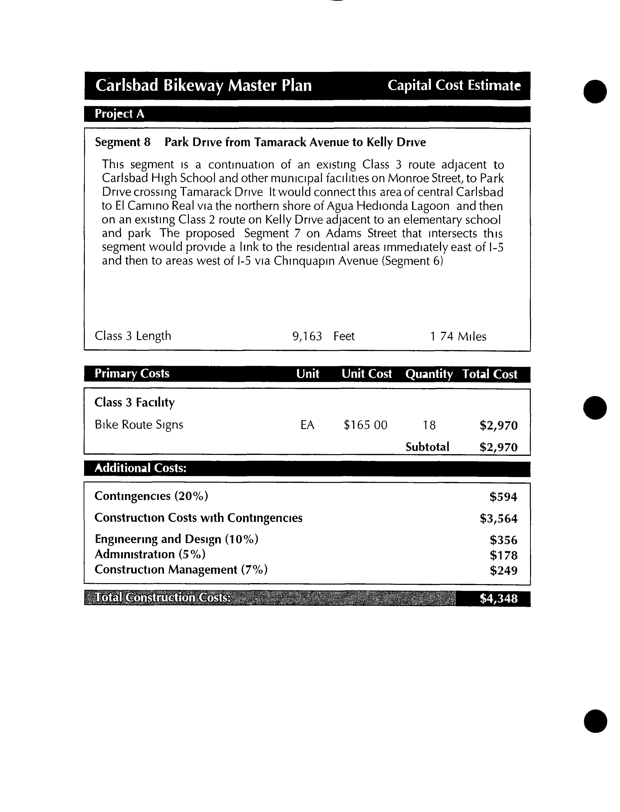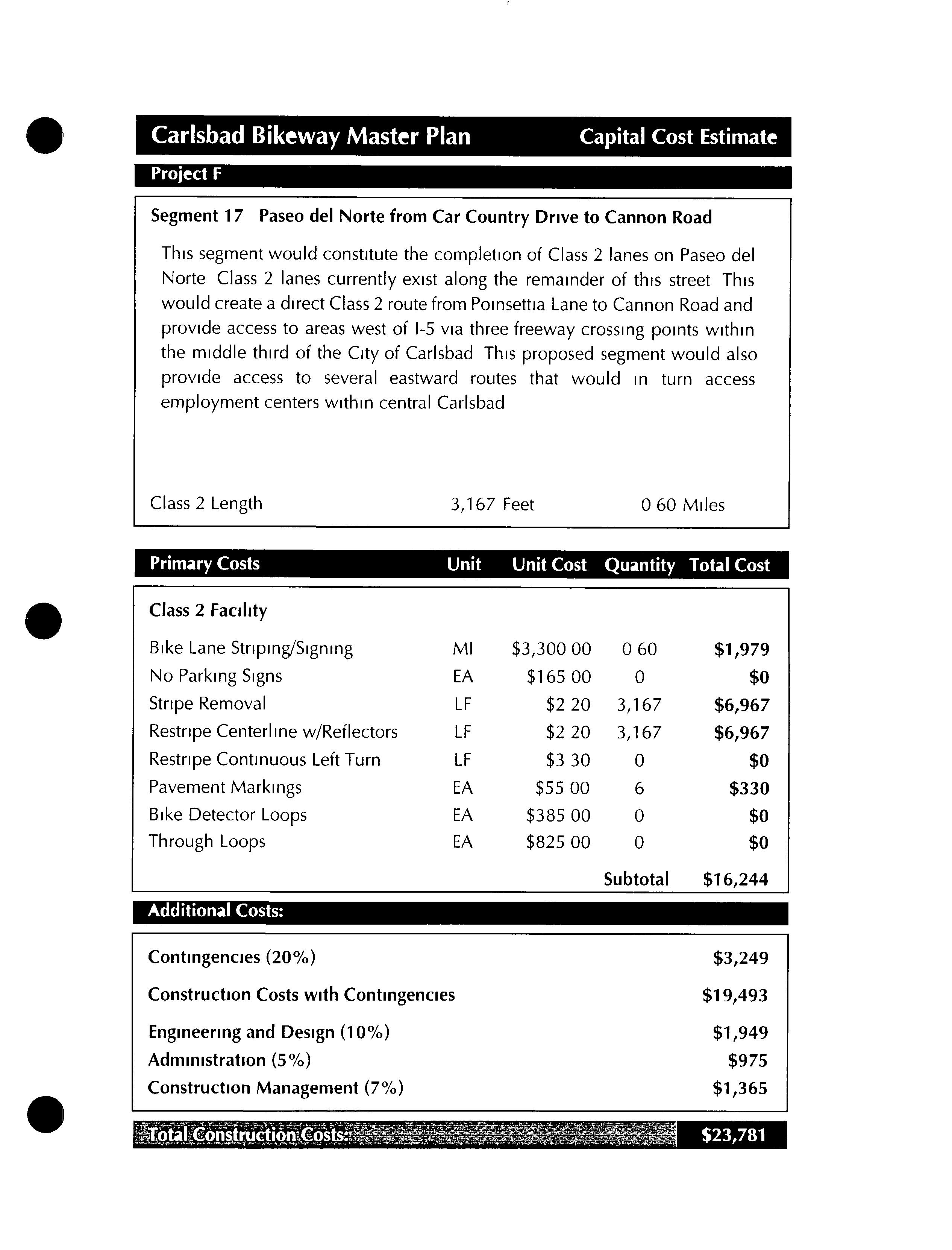 Much of this particular segment already exists as a well established dirt road To take advantage of this road andthe more natural experience it affords, these two segments would differ from all other proposed segments in this bikeway master plan by remaining unpaved Since this segment would be primarily for recreational use, commuting cyclists who preferred to ride on paved streets could use theclosely parallel Batiquitos Drive
