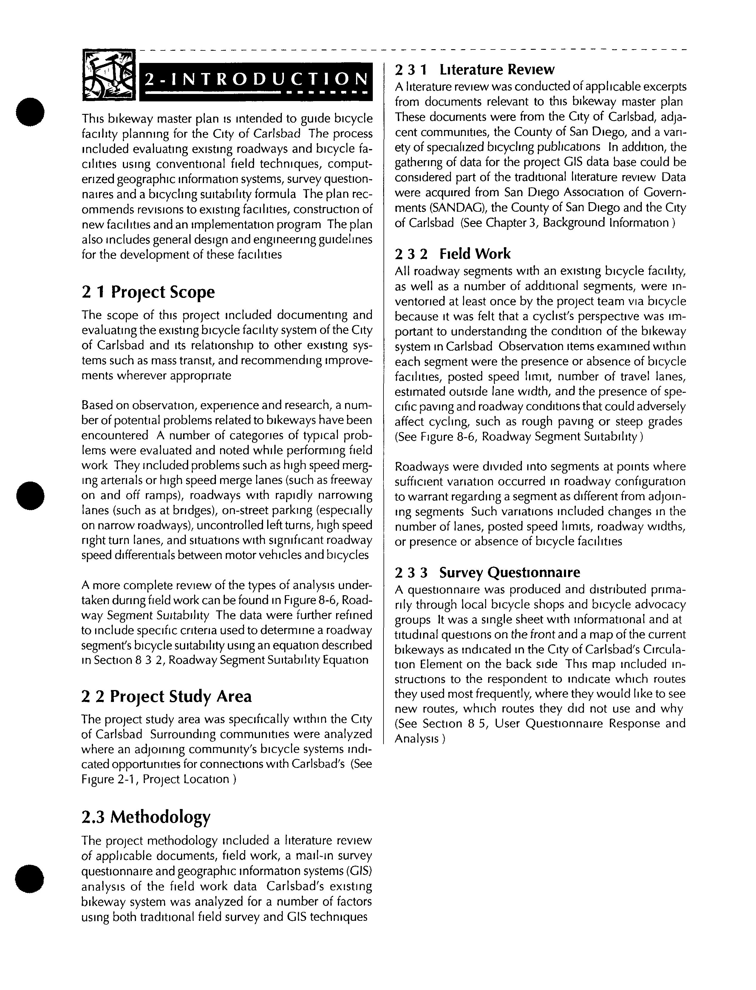 This Bikeway Master Plan provides a broad vision, strategies and actions for the improvement of bicycling in Carlsbad. It is important to note that the City of Carlsbad isby no means starting from scratch in terms of accommodating and encouragingbicycling.This Bikeway Master Plan focuses on completion of the bicycle network, identifies several new routes to provide additional connectivity, provides recommendations for spot improvements to the existing network, and identifies programs to educate motorists and bicyclists on the rules of the road, and encourage even more residents to bicycle. The Bikeway Master Plan is important for the following reasons: