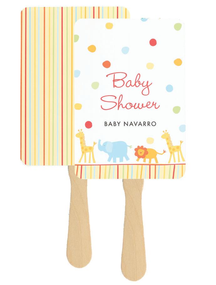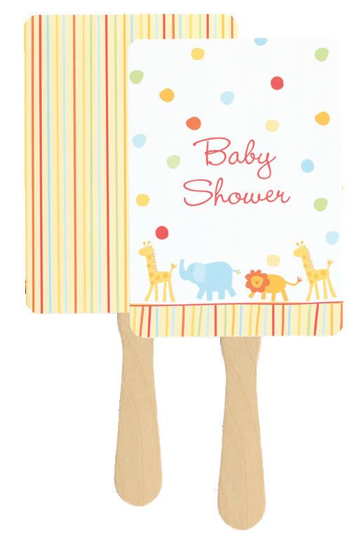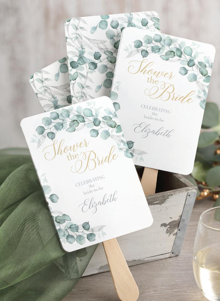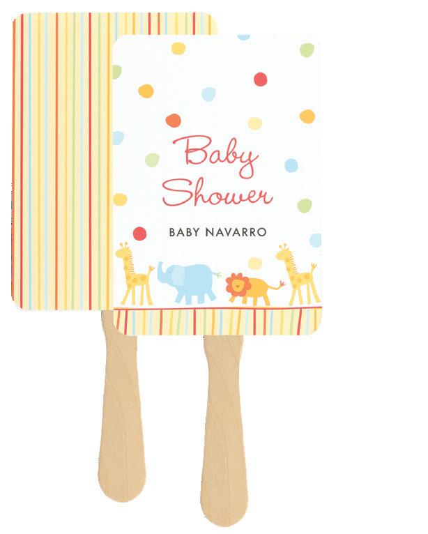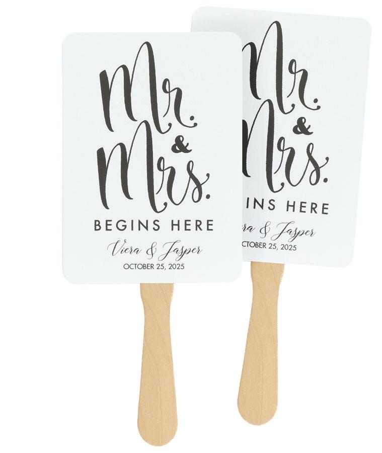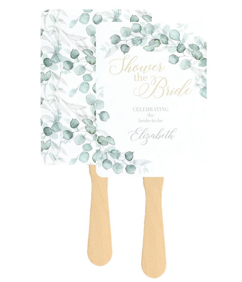 To personalize see pages 167 and 168. ChampagneNU ink and Futura Light font shown. Customer assembly required. Each favor fan consists of two, 5" x 7" cards, a wooden handle and glue dots. Package of 25.