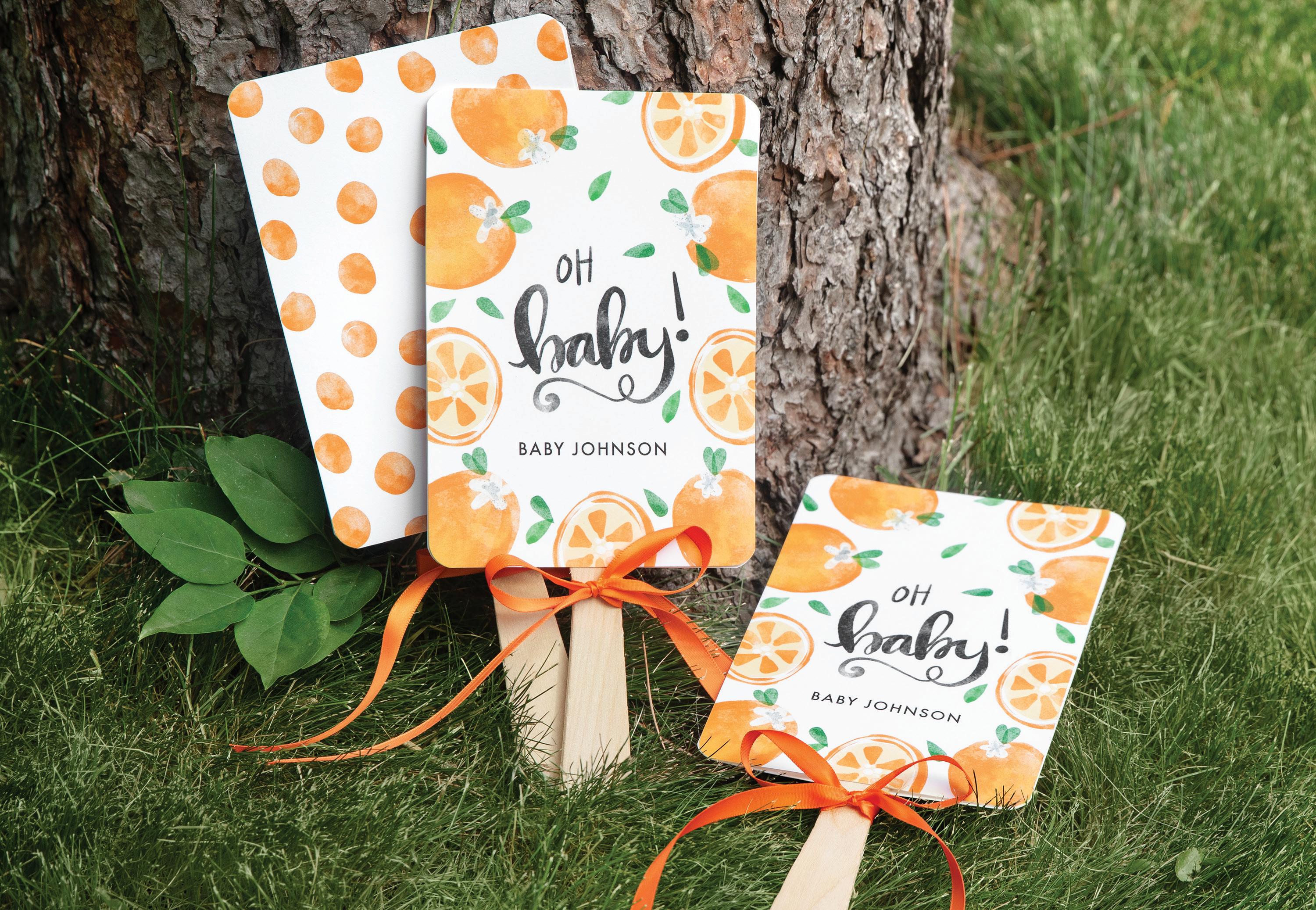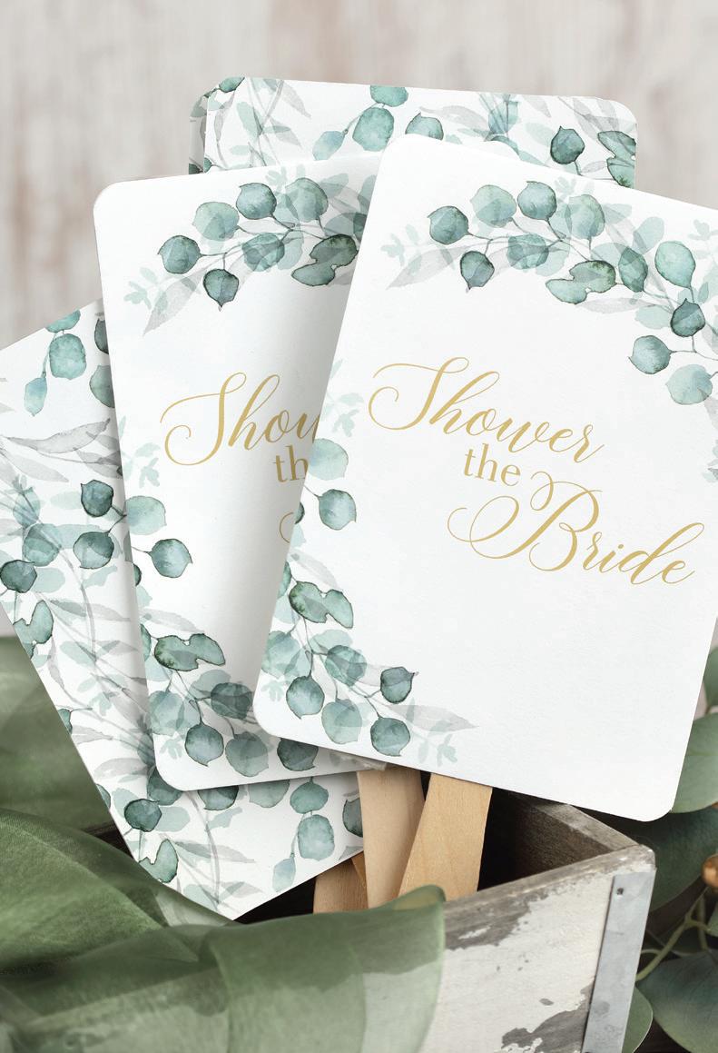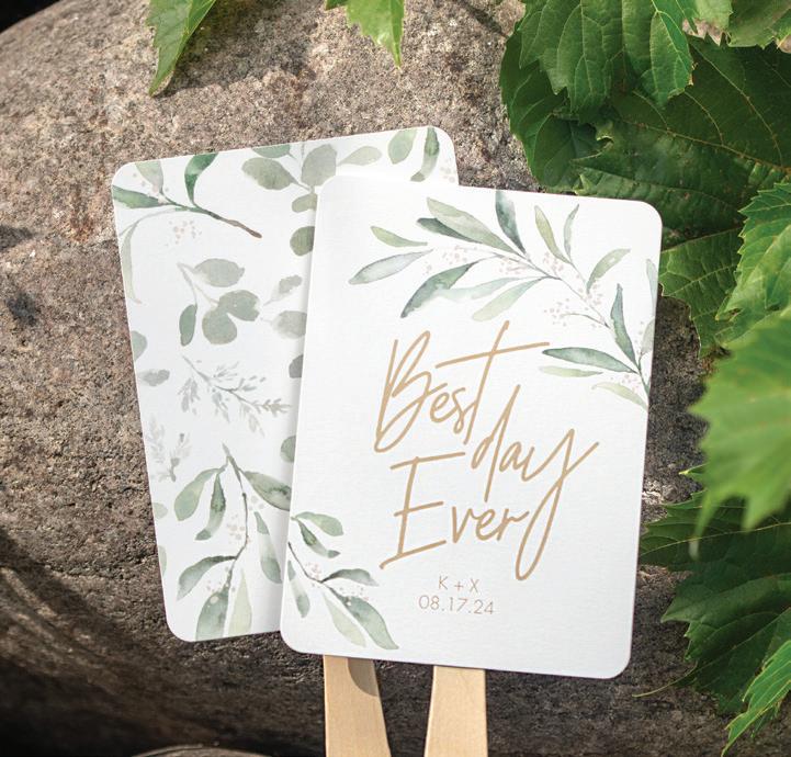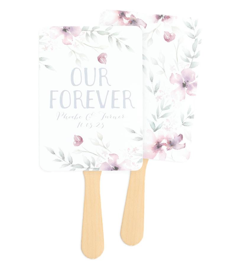 To personalize see pages 167 and 168. ChampagneNU ink and Futura Light font shown. Customer assembly required. Each favor fan consists of two, 5" x 7" cards, a wooden handle and glue dots. Package of 25.