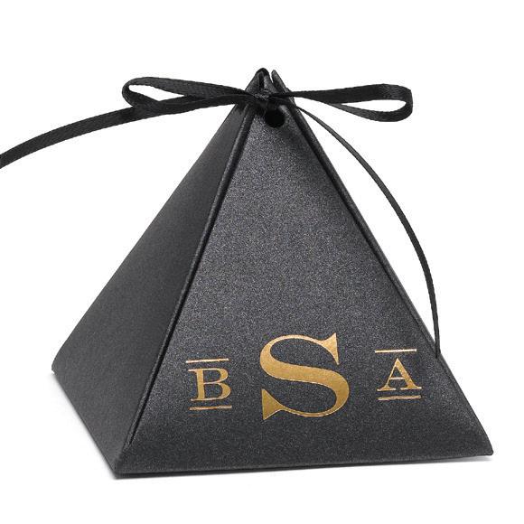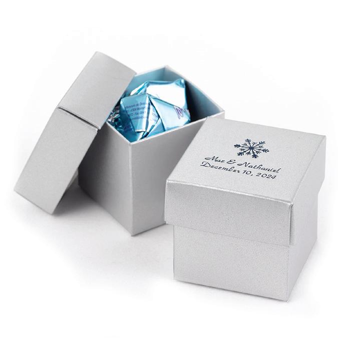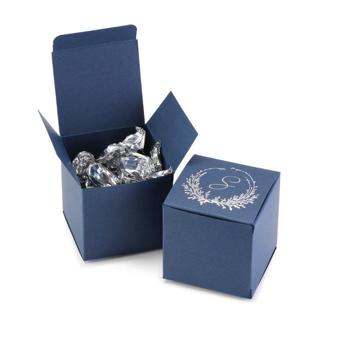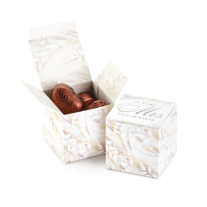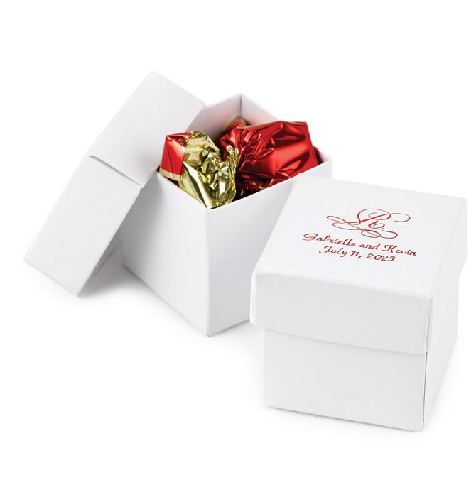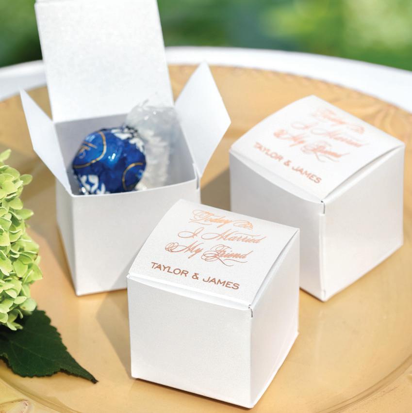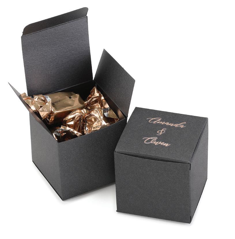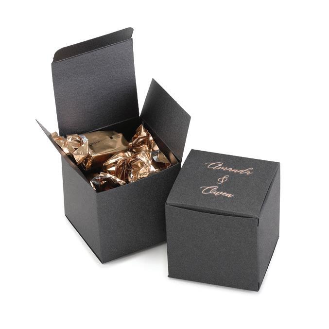 SQUARE FAVOR BOXESPERSONALIZED Rose Gold foil and Brunella Script font shown on black shimmer paper. 5 paper color options. Package of 25. ZBK62232P $50.90