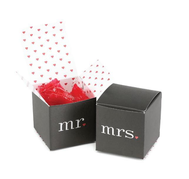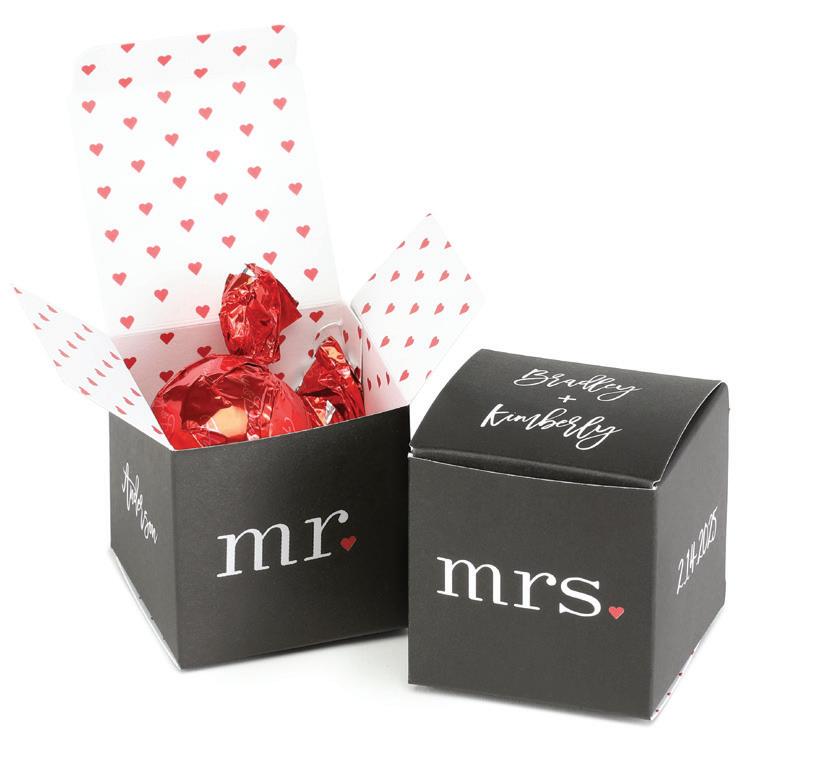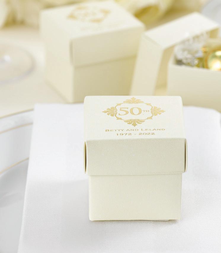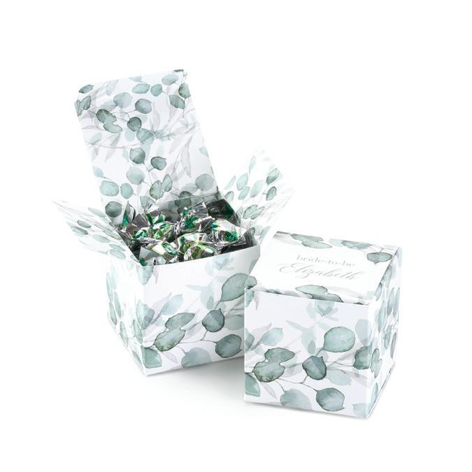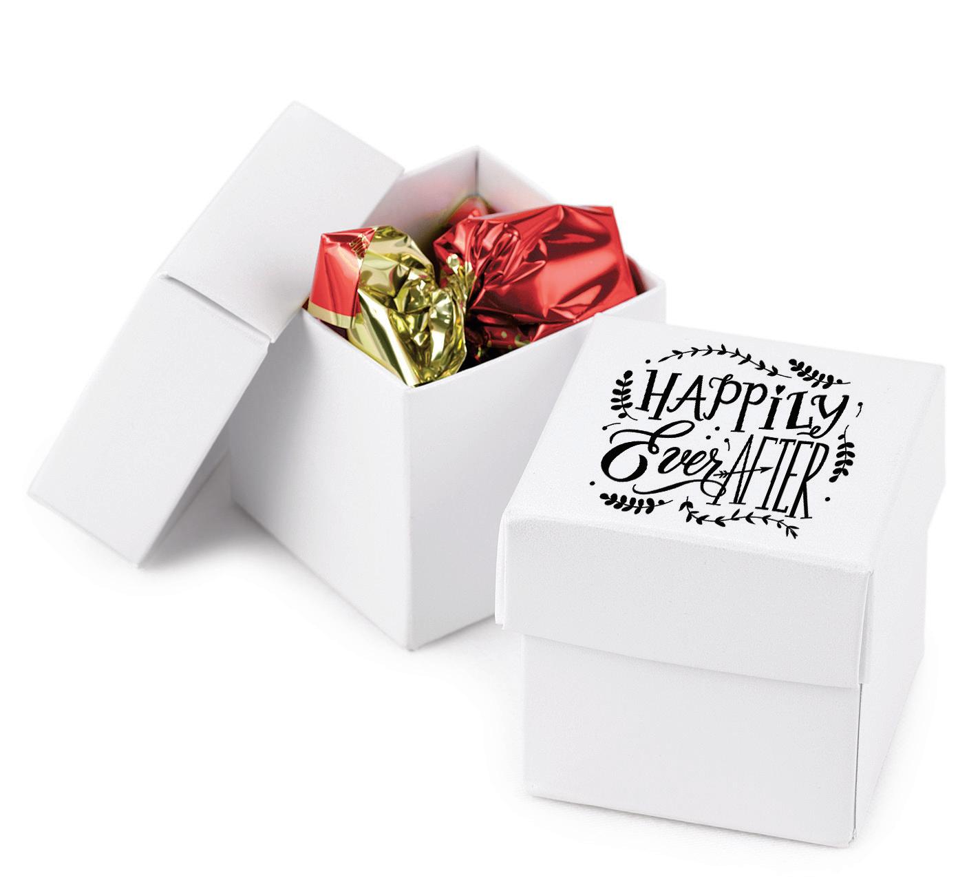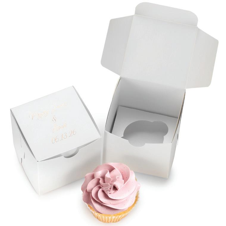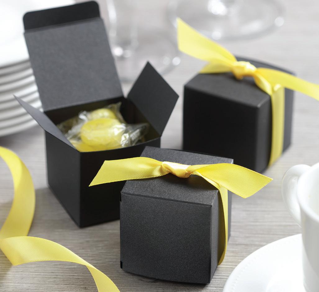 SQUARE FAVOR BOXESPERSONALIZED Rose Gold foil and Brunella Script font shown on black shimmer paper. 5 paper color options. Package of 25. ZBK62232P $50.90