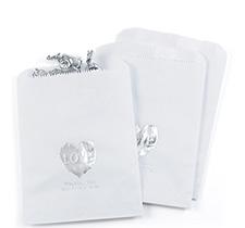 To personalize see pages 167 and 168. Platinum ink and Bombshell font shown. Customer assembly required. Each favor fan consists of two, 5" x 7" cards, a wooden handle and glue dots. Package of 25.