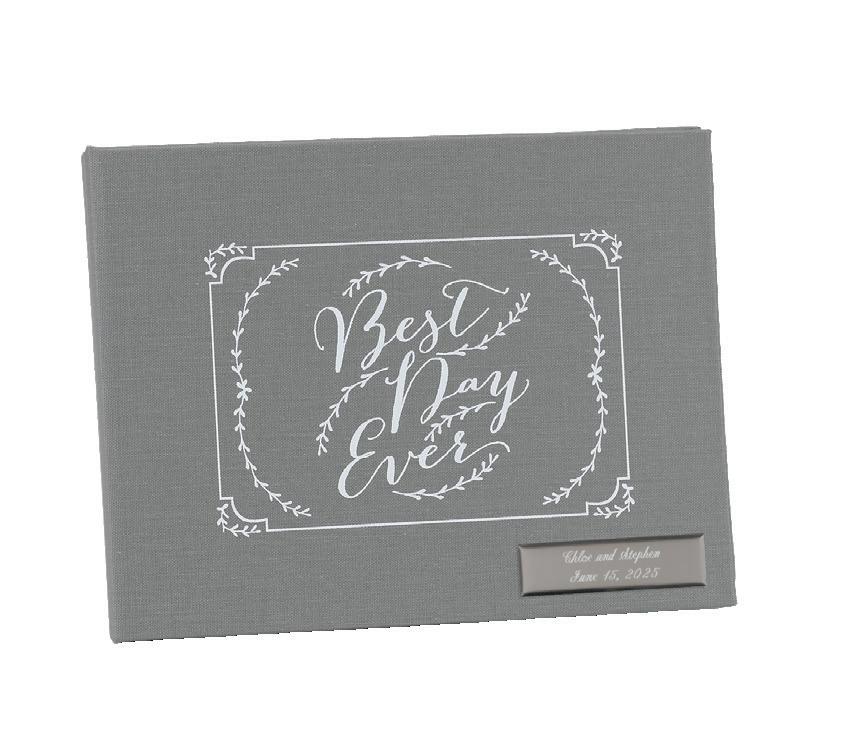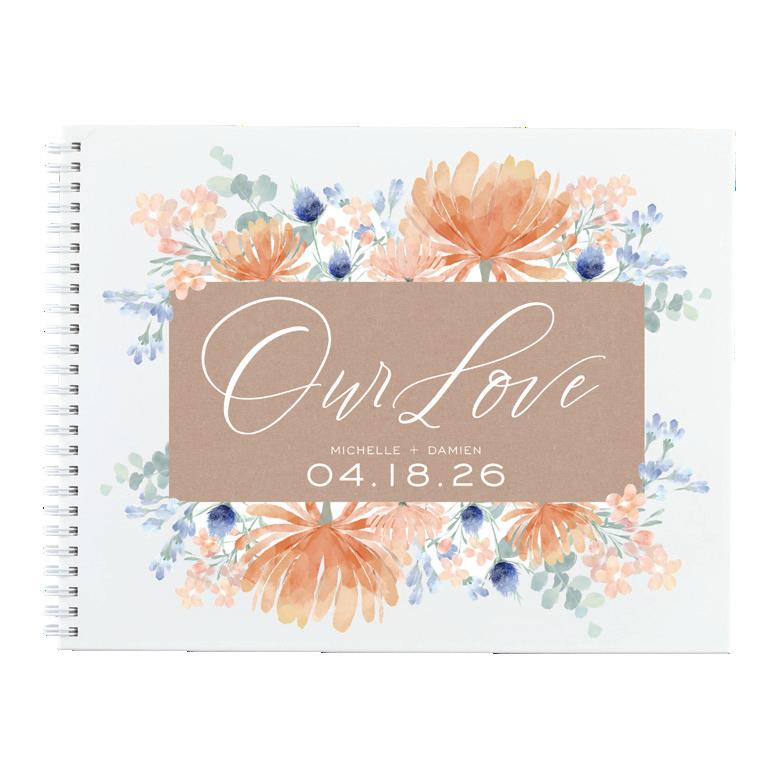 D. KRAFTED BLOSSOMS GUEST BOOK White ink and Engravers Gothic font shown.