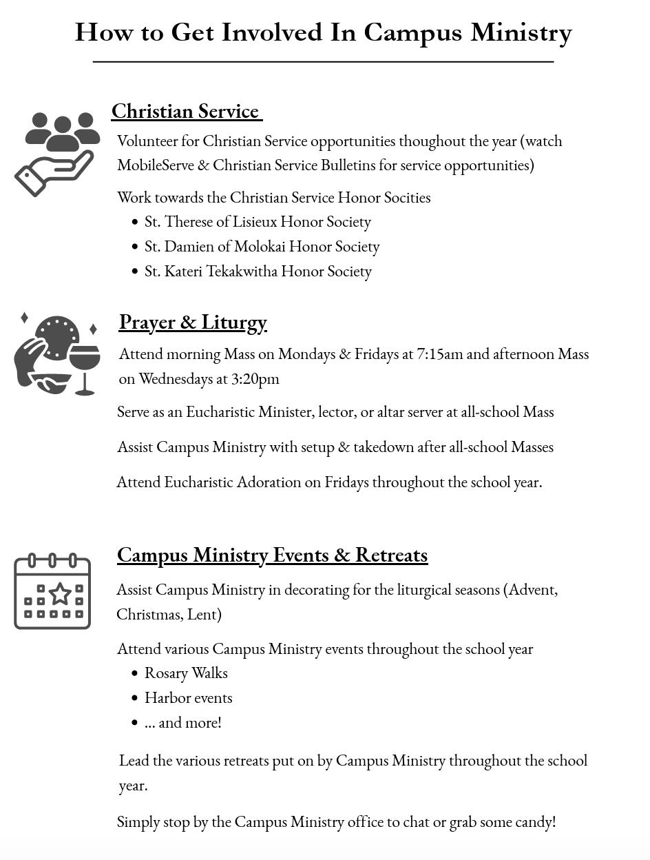 All school Mass, morning Mass, 4-year Retreat Program, Christian Service and Harbor events.
