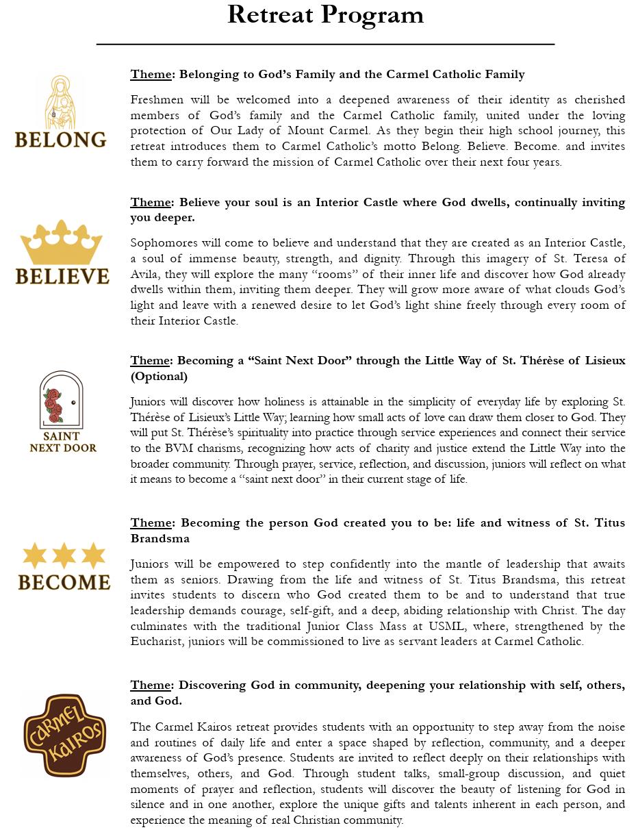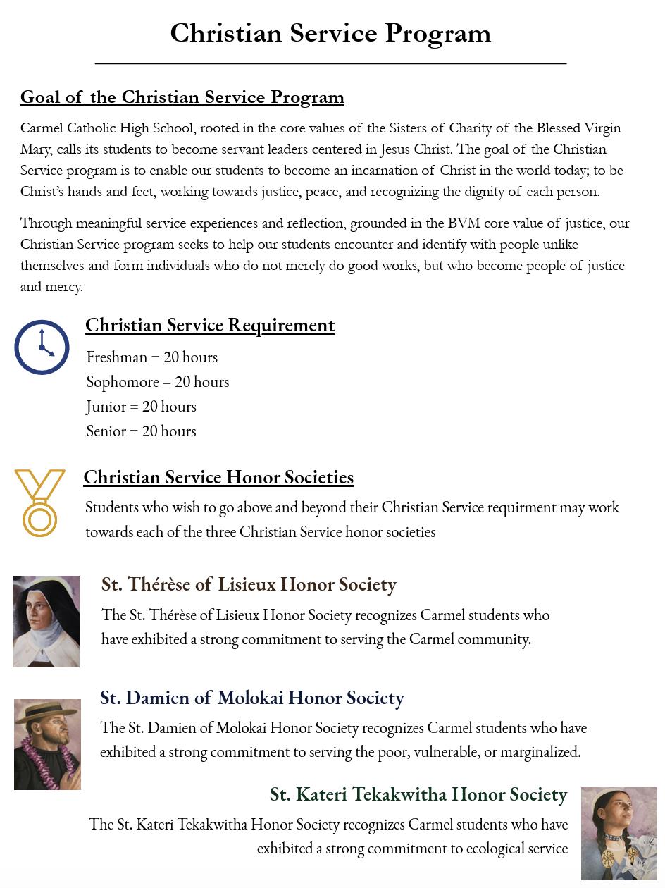 Students are required to complete 20 hours of verified Christian Service annually. Attendance at the yearly class retreat is also mandatory: Freshmen and Juniors attend a one-day retreat, while Sophomores participate in an overnight retreat. To meet graduation requirements, Seniors must attend a multi-day overnight retreat. Carmel Catholic facilitates this via the Kairos retreat. Any alternative retreat plans for the Senior graduation requirement must be approved by the Mission & Ministry Office.