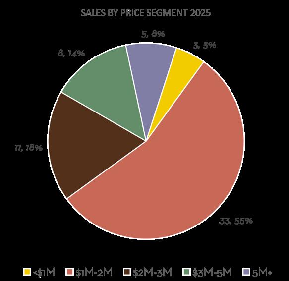 Carmel-by-the-Sea experienced a modest year in both sales transactions and sales volume. The number of sales came in at 103 for the year, up 7.3% from 96 sales last year. Sales volume was down 8.5% due to the mix of sales that took place during the year. 2025 saw 19 sales over $5M in the area, the same as 2024, but last year these $5M+ sales brought $35M in additional volume. In addition, 2024 saw eight additional sales in the $3M-$5M range than 2025. All this led to an average sales price drop of almost 15% year-overyear. Though average prices were down this year, we still believe homes in the area appreciated somewhere in the 1-5% range, more typical of what was seen across the entire Monterey Peninsula.