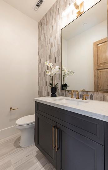 • Paint grade custom vanity cabinetry with Sherwin Williams Urbane Bronze paint with Calacatta Umber honed marble slab countertop with 6” splash